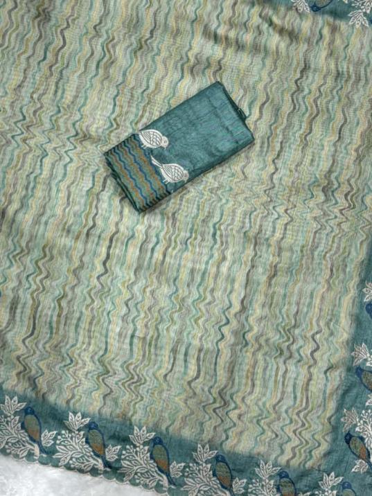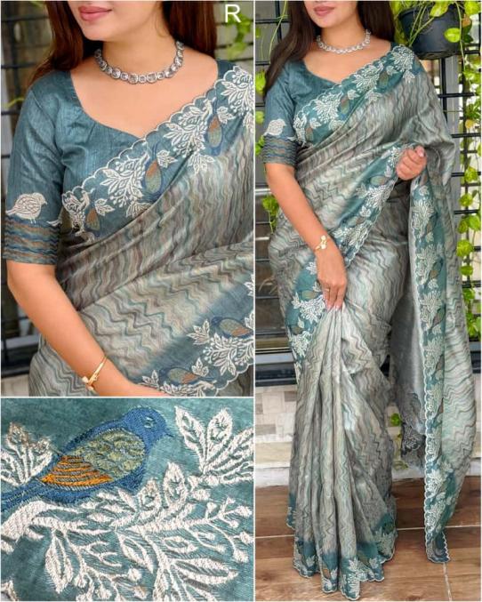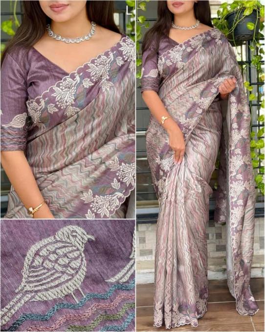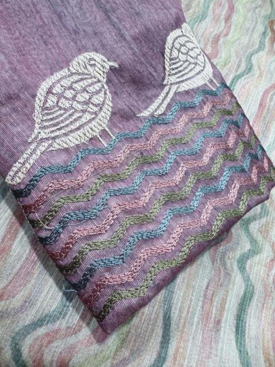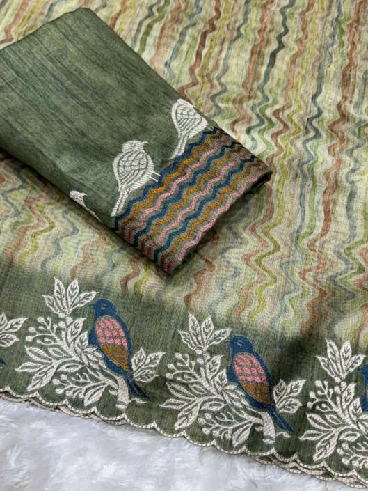 Design-Ruhani Wrapped in the poetry of heritage, this tusser silk digital print saree is where tradition meets pure grandeur. The rich tusser saree glows with fine thread kashmiri style Embroidery Fabric- Pattern-