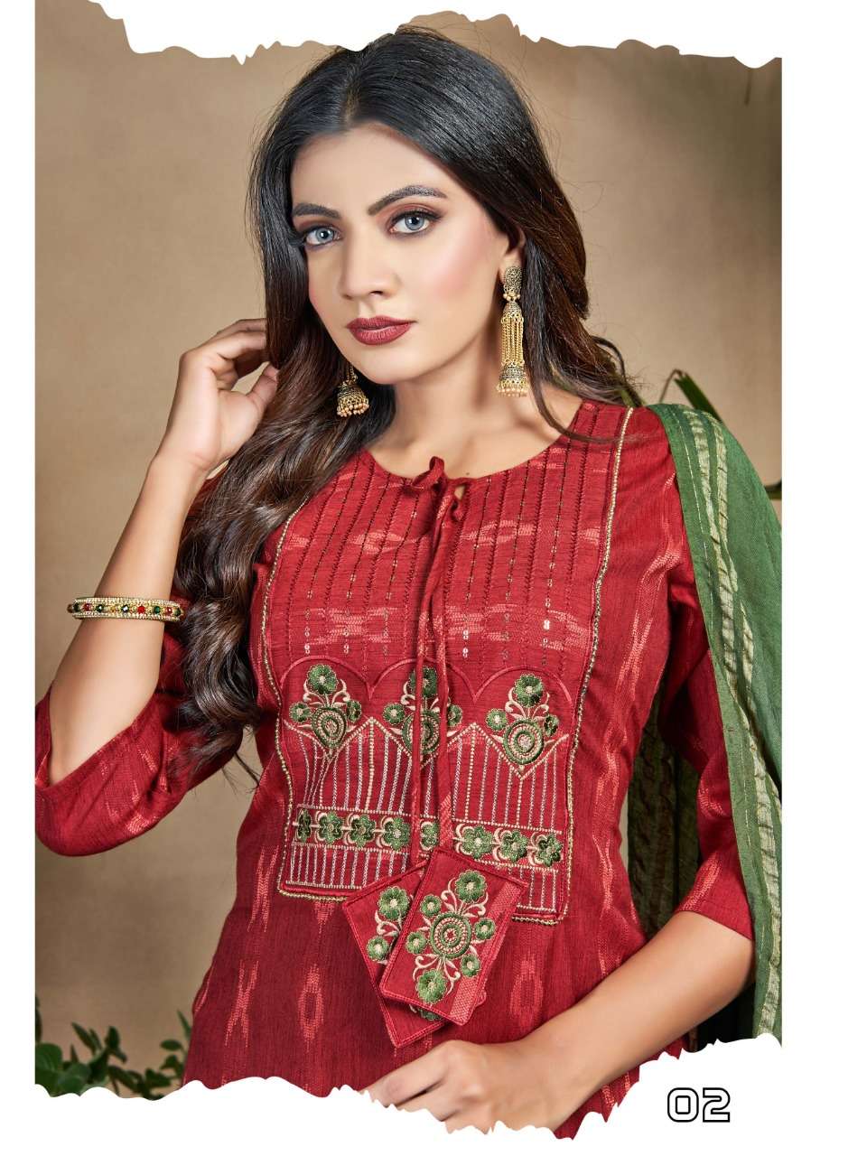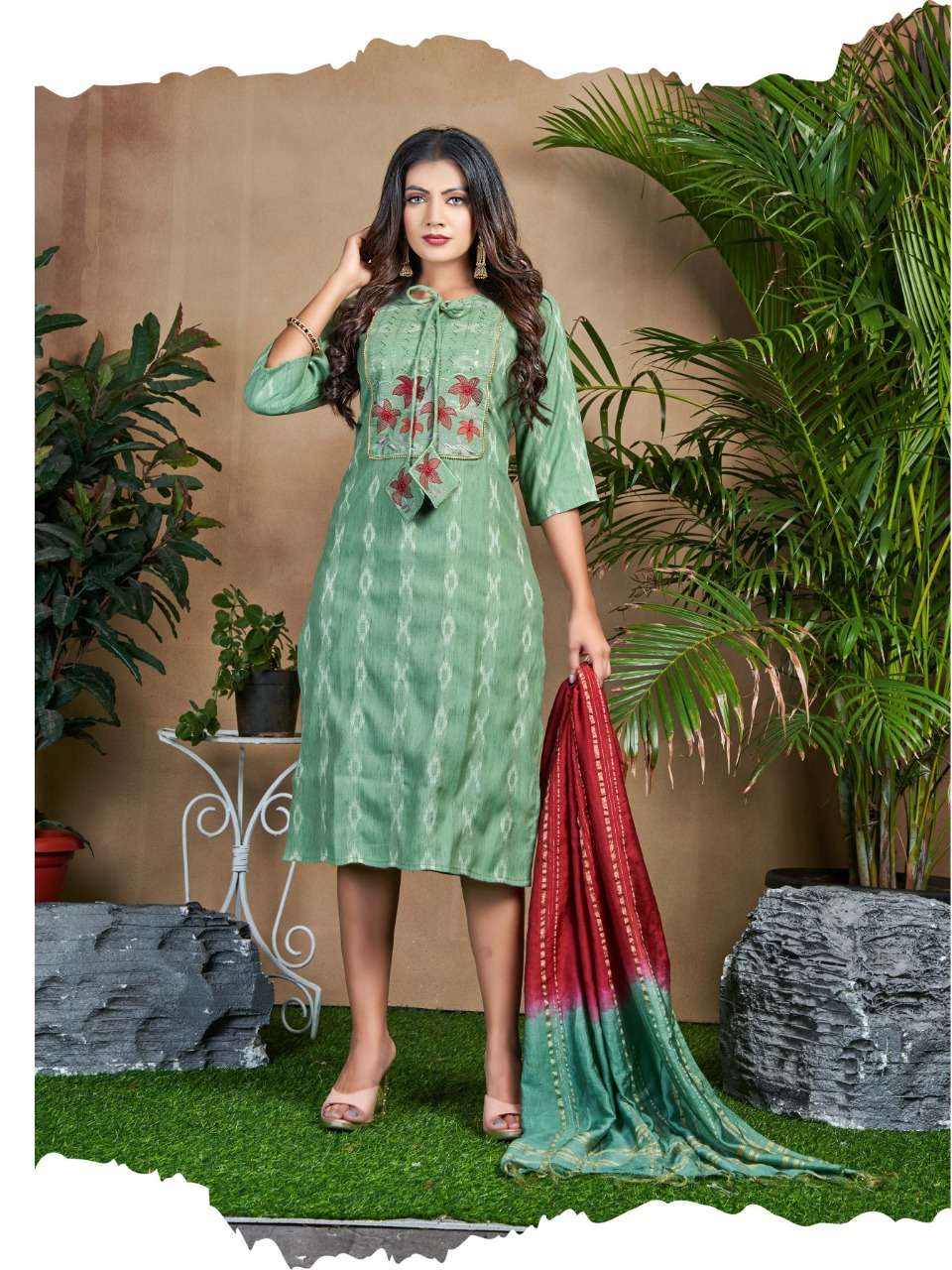 Brand - Rung FEBRIC..HEAVY ikkat riyon PRINT WITH EMBROIDERY & dupatta Dupatta .jacard silk dupatta. PC's. 8 Size. M. L. XL. XXXL Rate |