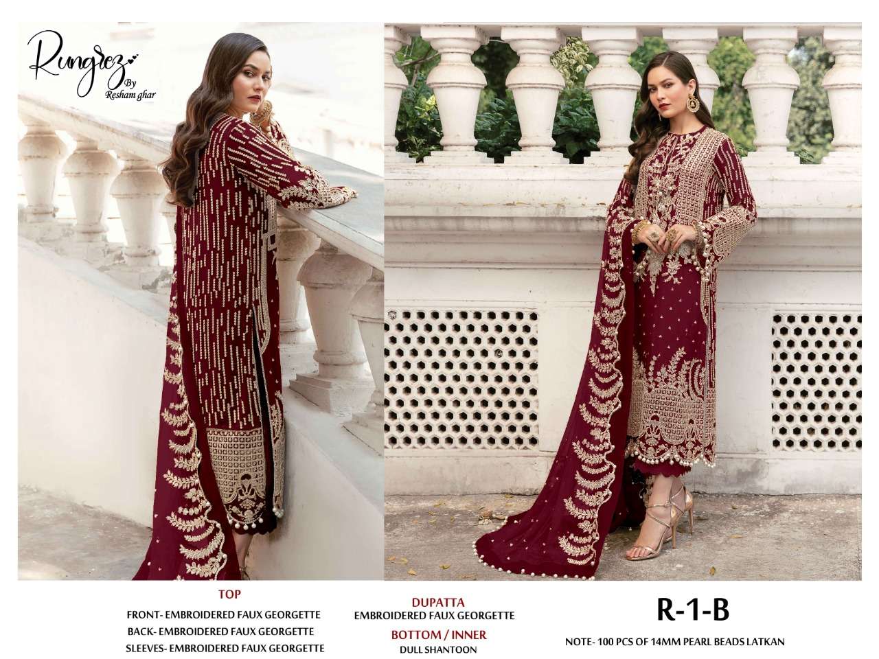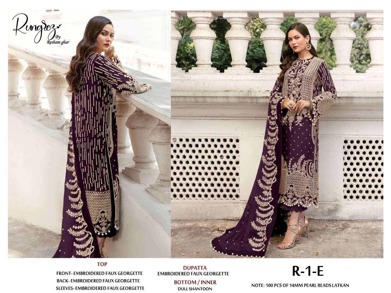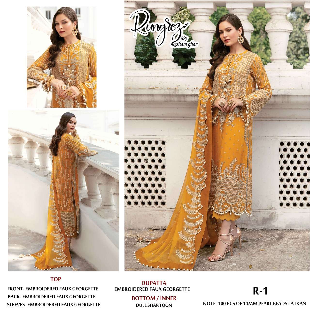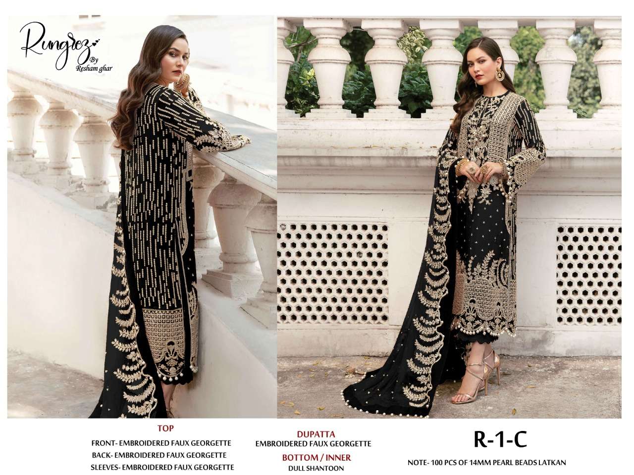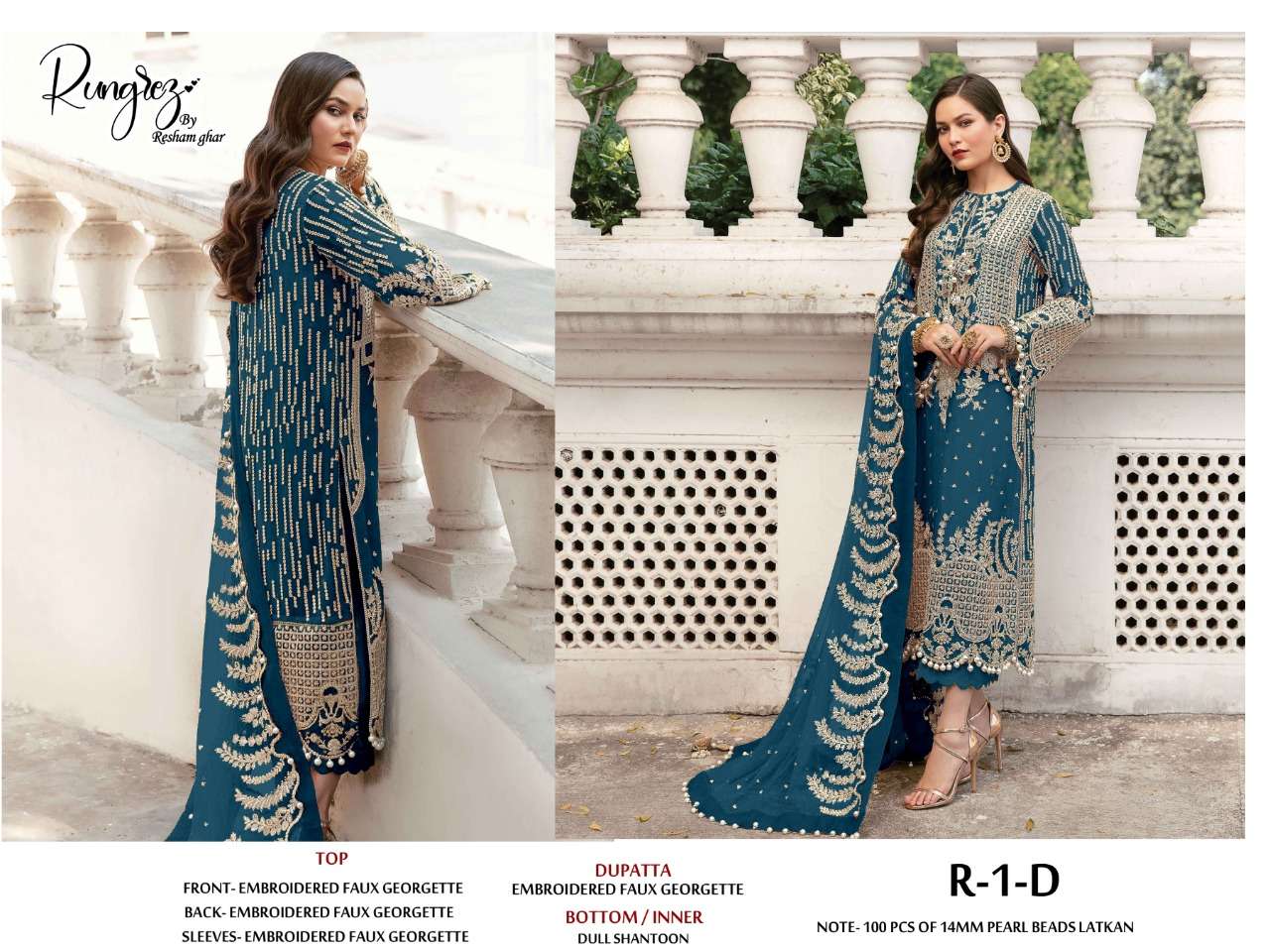 RUNGREZ BY RESHAMGHAR R - 1 COLOURS FRONT & BACK HEAVY WORK Top : GEORGETTE WITH HEAVY EMBROIDERY Dupatta : GEORGETTE WITH HEAVY EMBROIDERY Bottom/Inner : DULL SHANTOON (4.5M) Rate : 1499/-