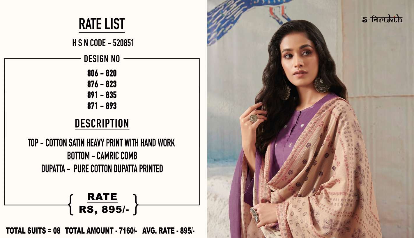 S Nirukth Presents Latest Collection Launched on 12-08-2023. Presenting Beautiful collection of 8 PCS with Unstitched .