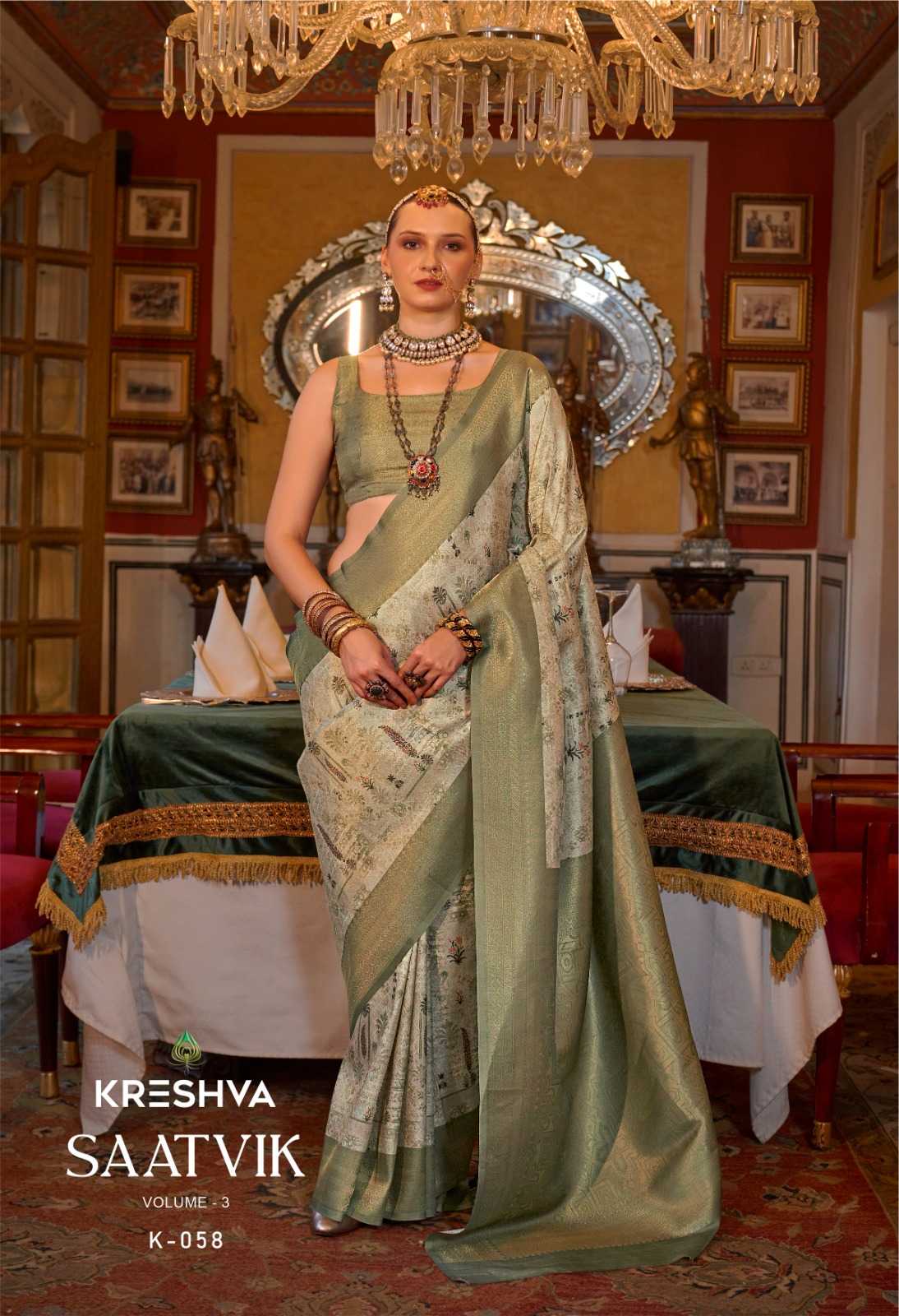 BRAND :KRESHWA CATALOGUE NAME:- SAATVIK-3 SERIES :K-052 TO K-059 FABRIC DETAILS:-︎ TUSSER SILK WITH DIGITAL PRINTED ZARI BORDER SAREE WITH CONTRAST BORDER BLOUSE : ZARI ART SILK BLOUSE RATE:-995/- |