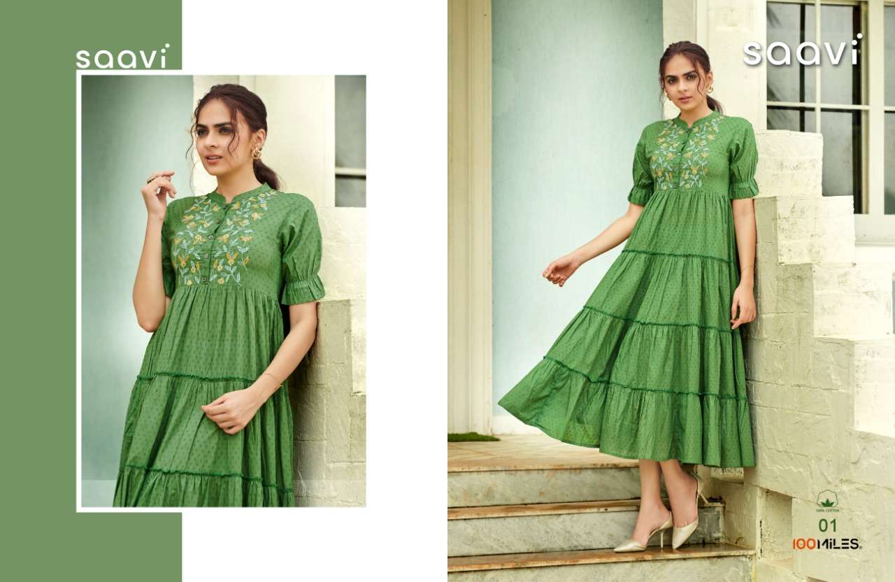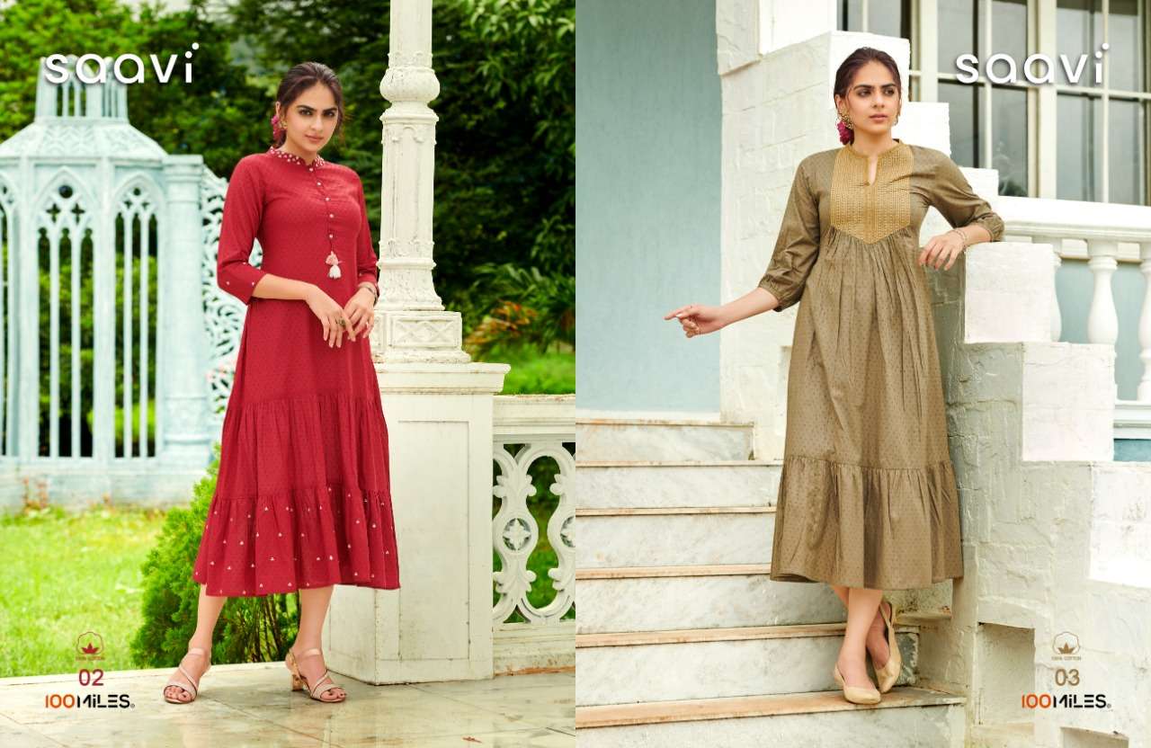 Catalog : SAAVI Style : Pure cotton dobby long dress with embroidery detailing and half inner and with flair gathers. Length: 49”-50” BRAND : 100MILES®️ SIZES : M to 2XL |