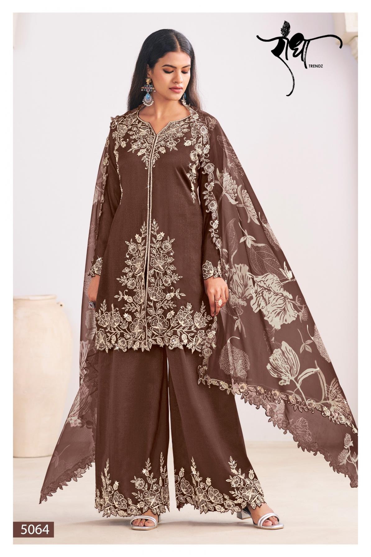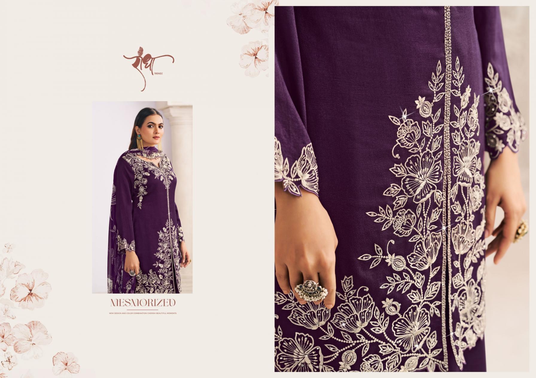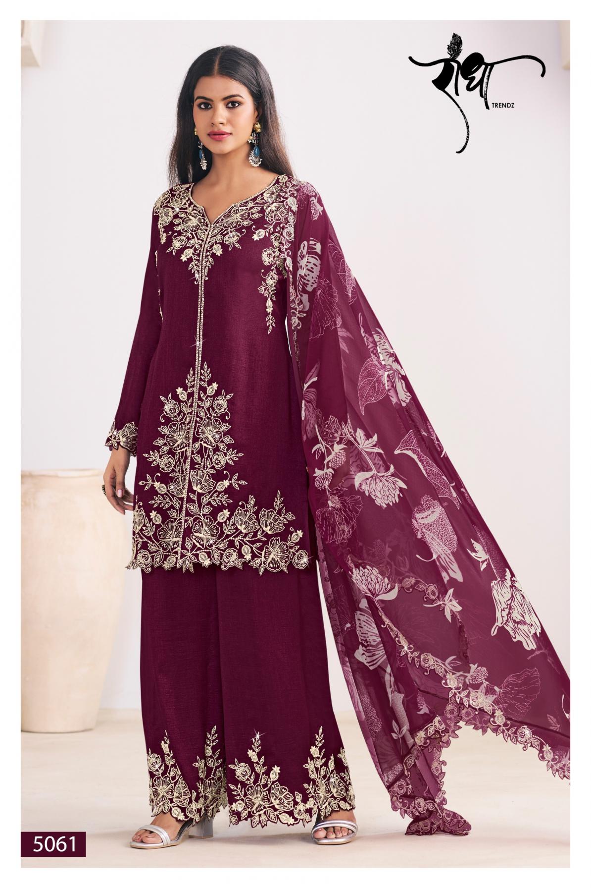 BRAND: RADHA TRENDZ CATLOG TOP: HEAVY PREMIUM SILK WITH HEAVY EMBROIDARY WORK BOTTOM : HEAVY PREMIUM SILK DUPATTA: HEAVY PREMIUM BEMBERG CHIFFON WITH DIGITAL PRINT WITH HEAVY EMBROIDARY WORK RATE: 1795/- NOTE : FREE SIZE STITCHED |