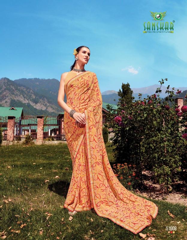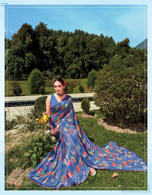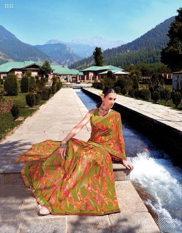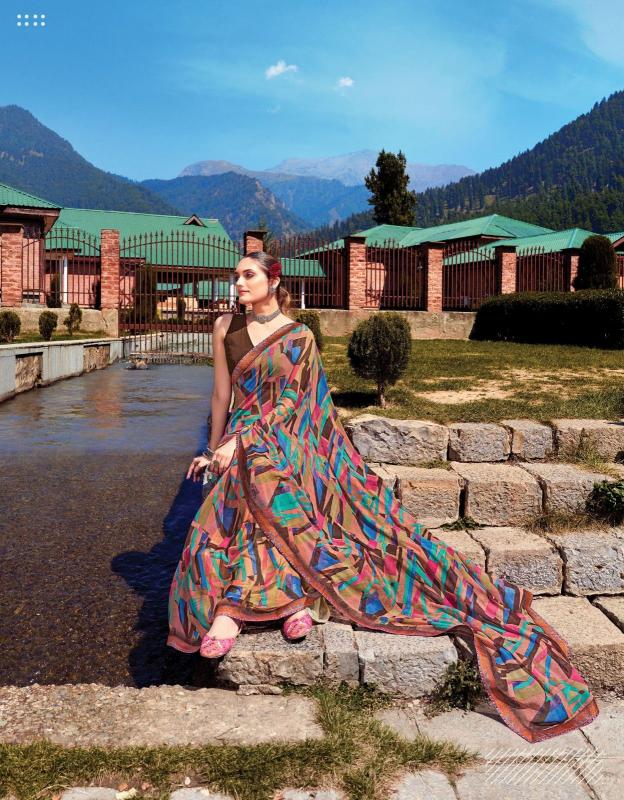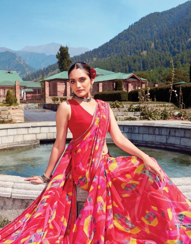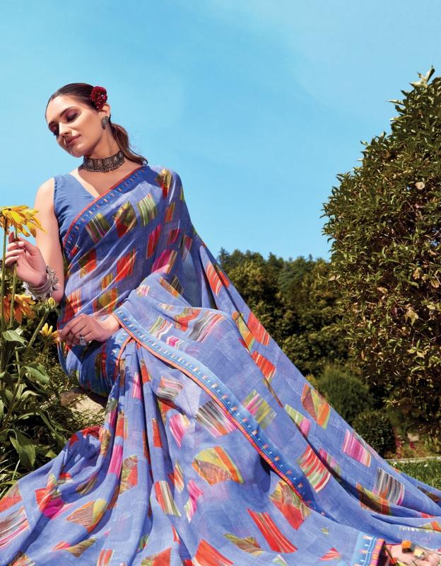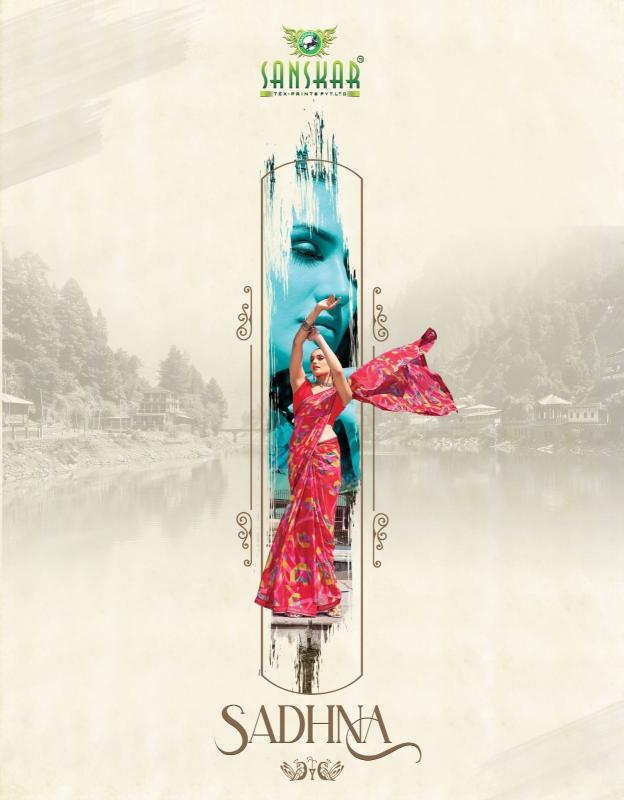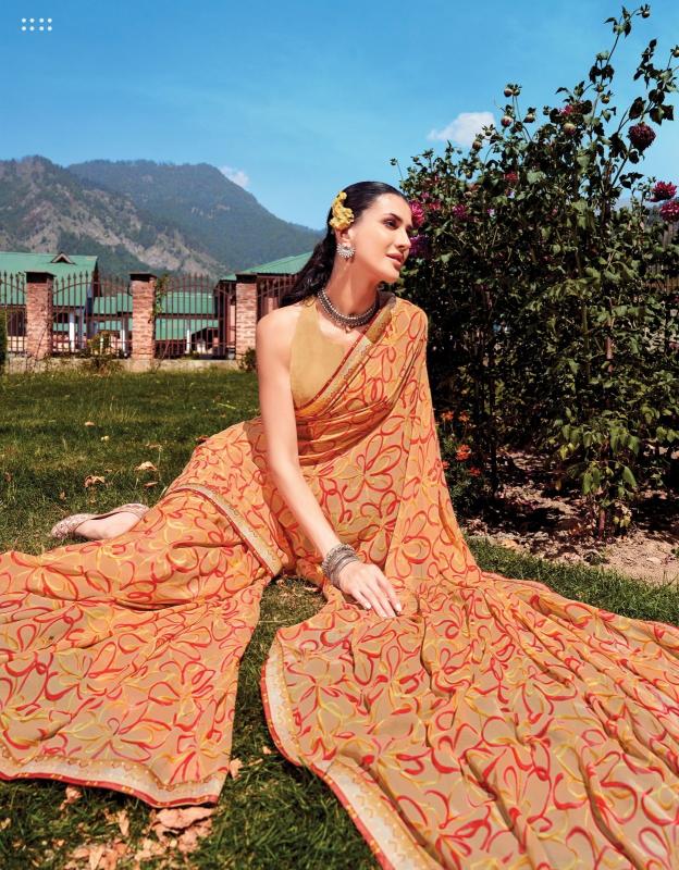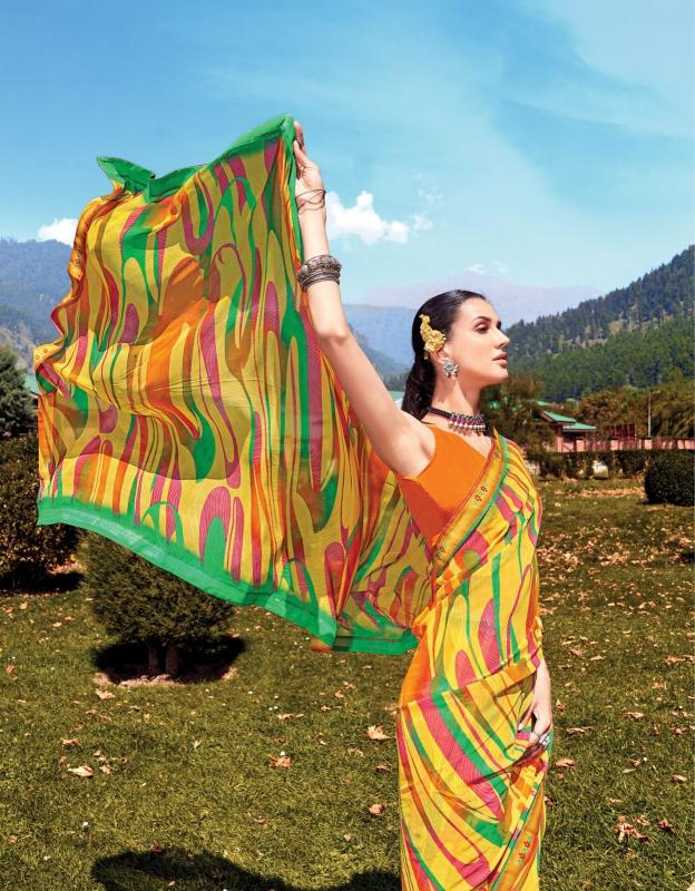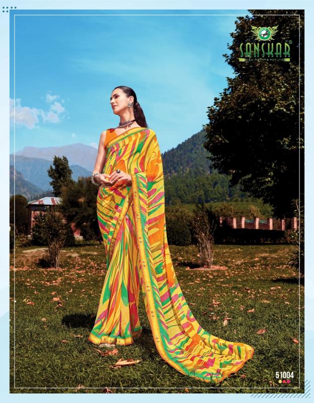 Sanskar Tex Prints Pvt Ltd CATLOUGE- SADHNA Fabric- Bember Georgette with fancy Digital printed border & blouse Qty- 8 dis RATE - 540₹ |