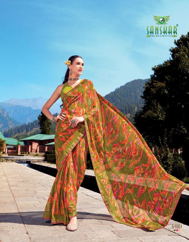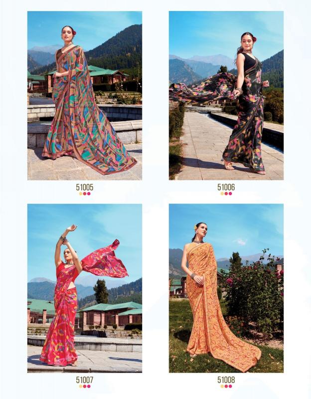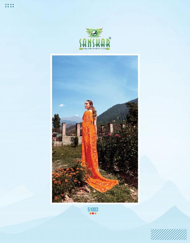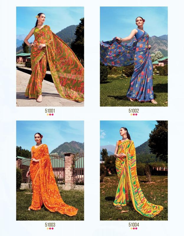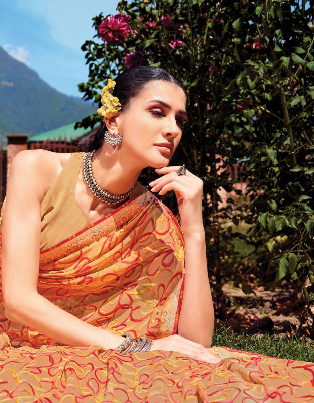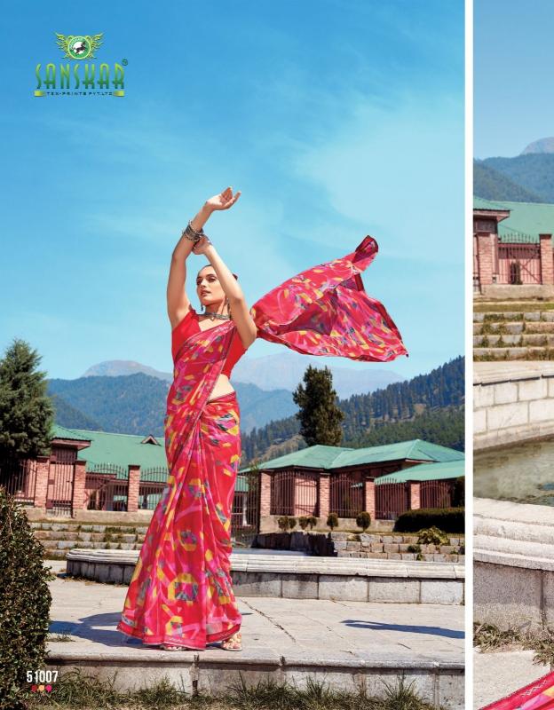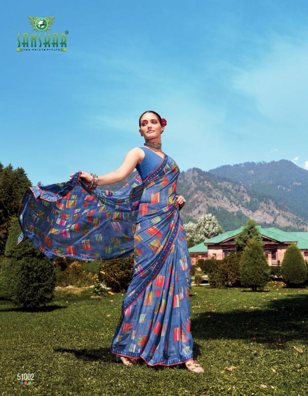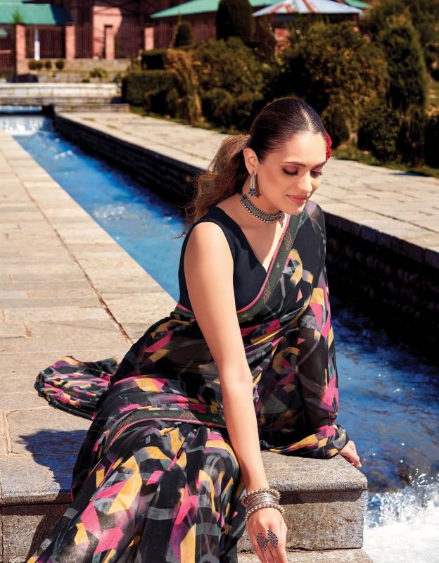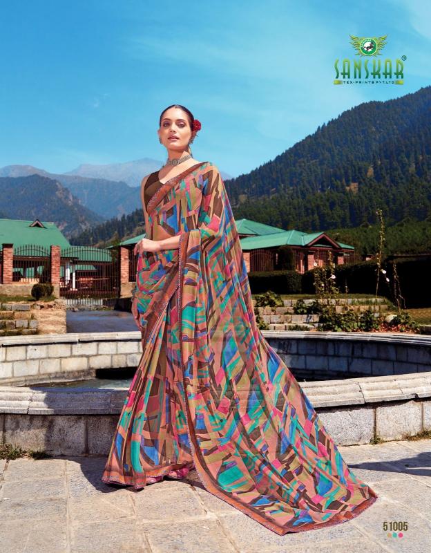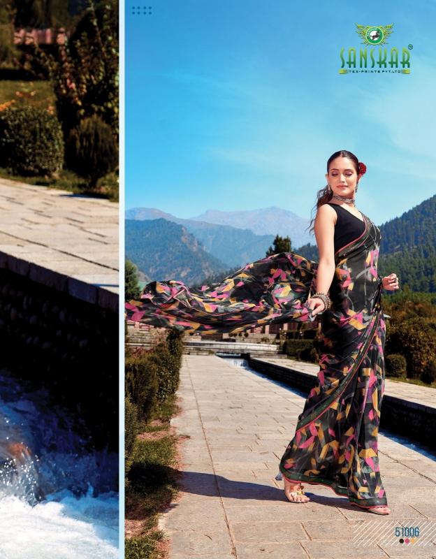 Sanskar Tex Prints Pvt Ltd CATLOUGE- SADHNA Fabric- Bember Georgette with fancy Digital printed border & blouse Qty- 8 dis RATE - 540₹ |