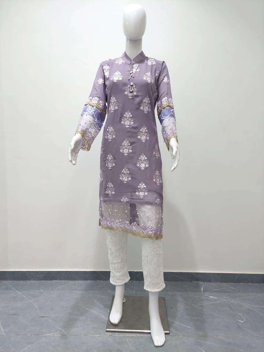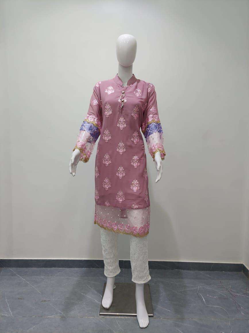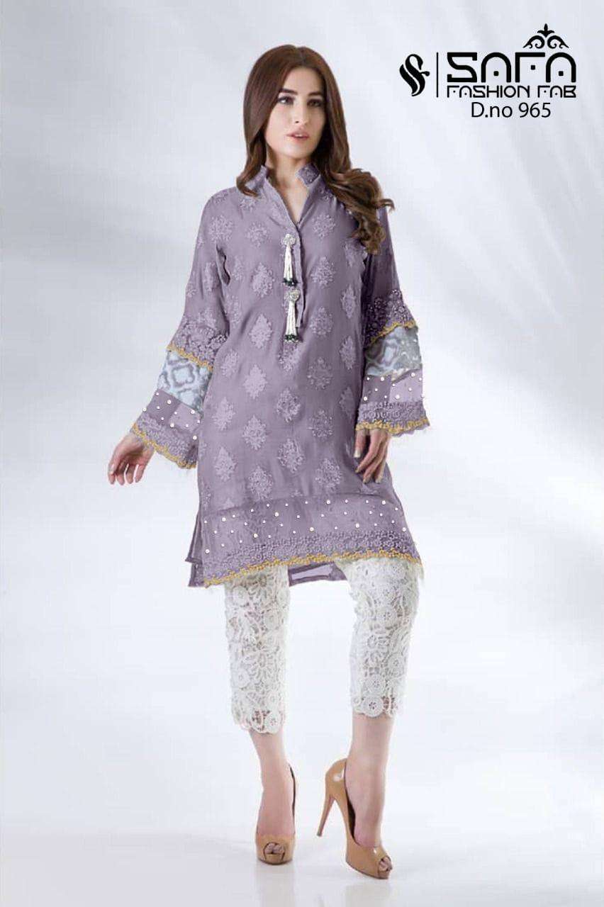 SAFA FASHION FAB  ( D.NO-965) We are Introducing our LUXURY PRET FORMAL WEAR  COLLECTION To Make You Unique and Classy.. With Supirier Quality and Affordable Price  S.F.965 by SAFA FASHION  FAB Description  Designer Embroidered Tunic with Sleeves paired with Designer Cigarette pants Details Top:-Pure gorgette Fabric Bottom :- IMPORTED FABRICS WITH INNER Inner :- pure Santoon Colour 2 colour  Pink.Gray        Size Chart Top xl size chest (42) Bottom xl size (38) Rate 1299/- Full set available      |