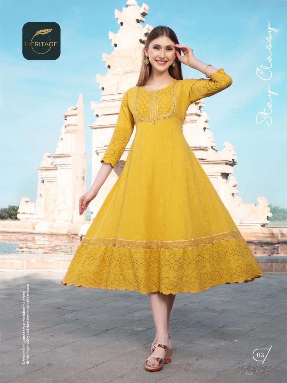 SAHIBA BY HERITAGE PREMIUM SCHIFLI COTTON WITH INNER DESIGNER LONG KURTI WITH SCHIFLI WORK & FULL GHERA WITH INNER WITH EMBROIDERY & GOLD PRINT KALIDAAR KURTI CATALOG WHOLESALER BEST RATE