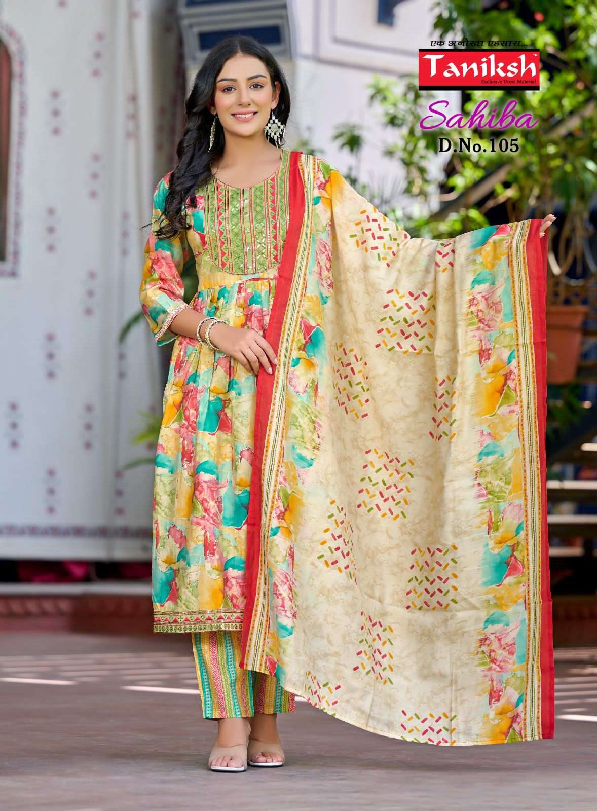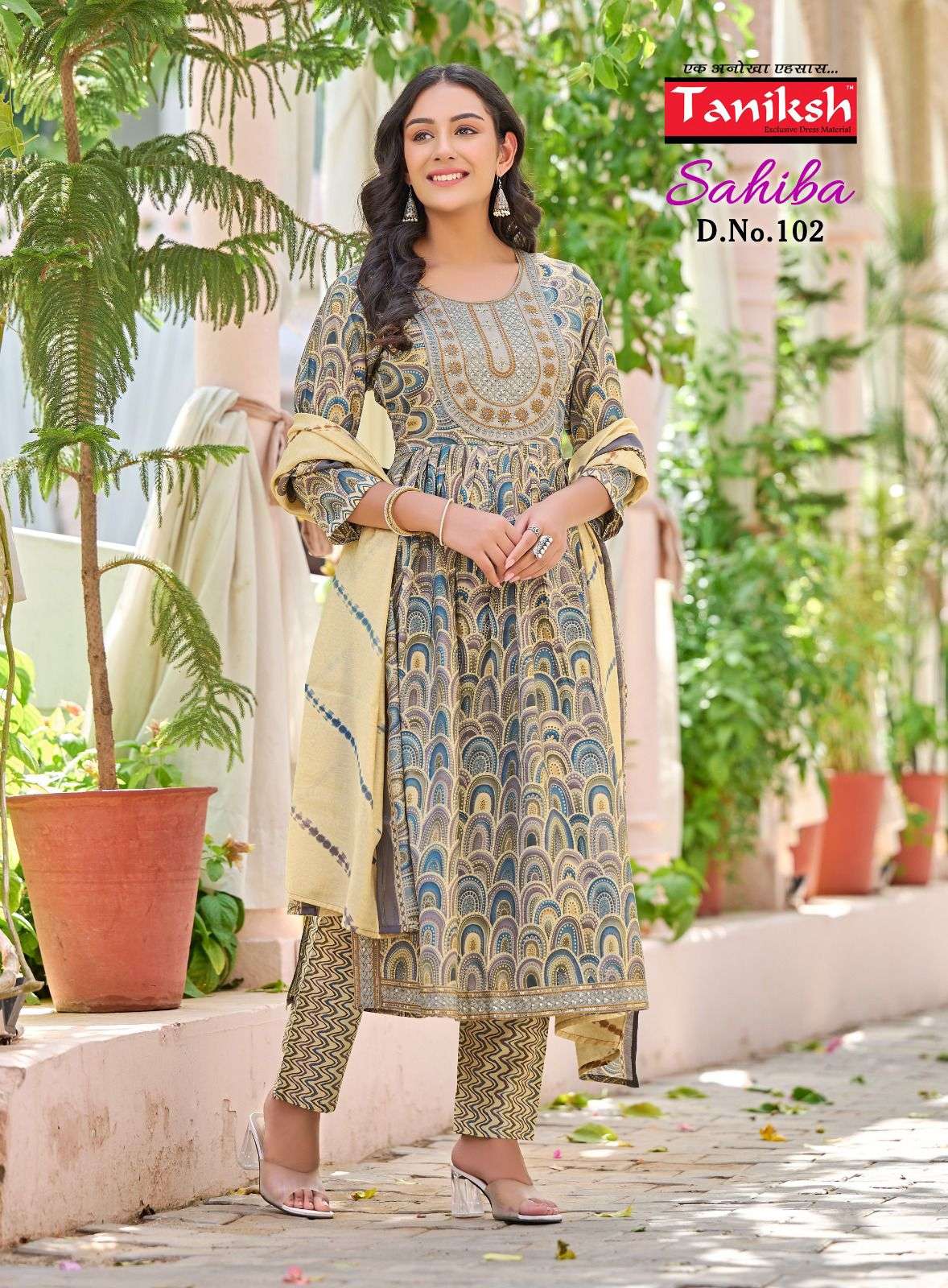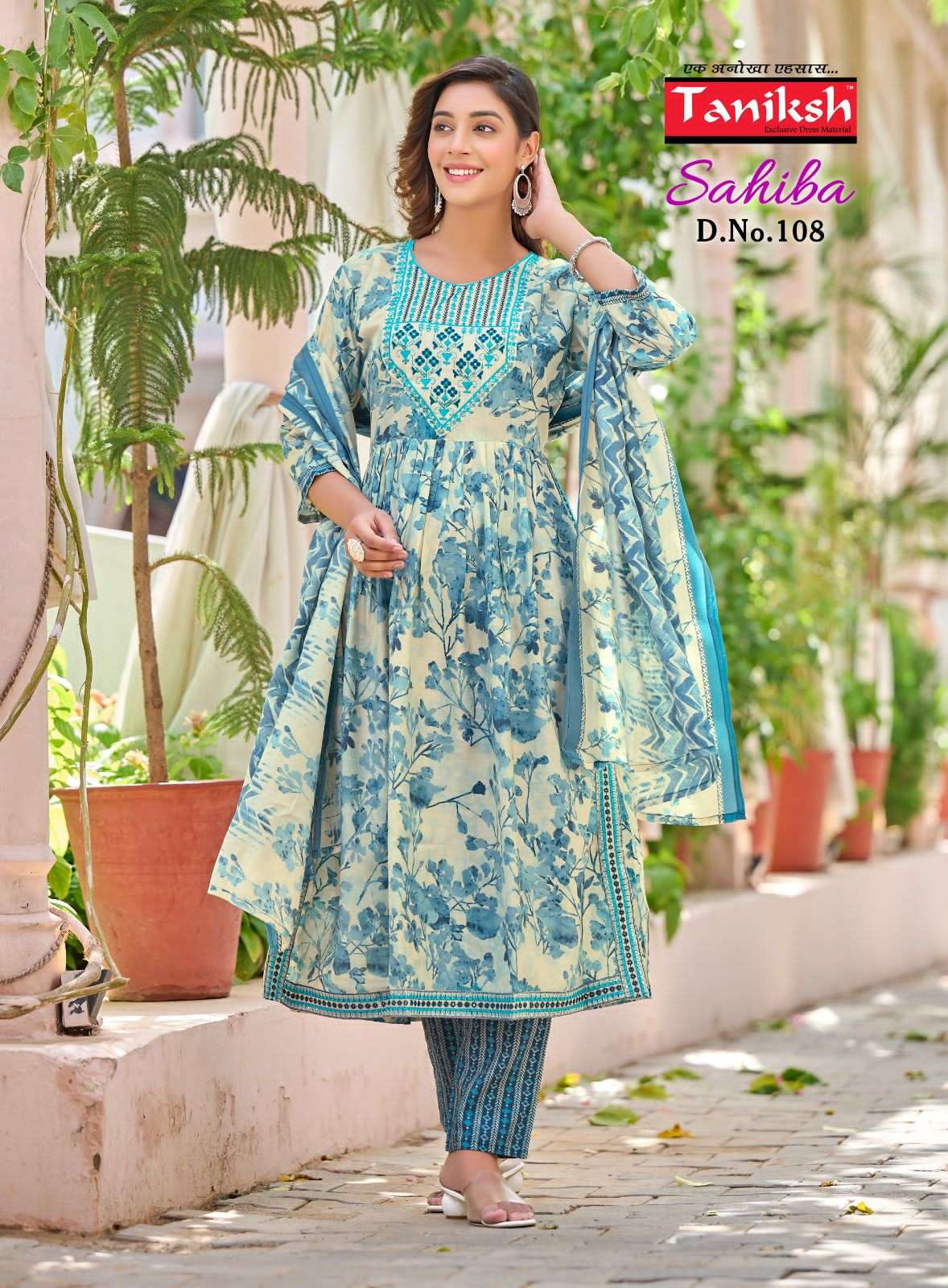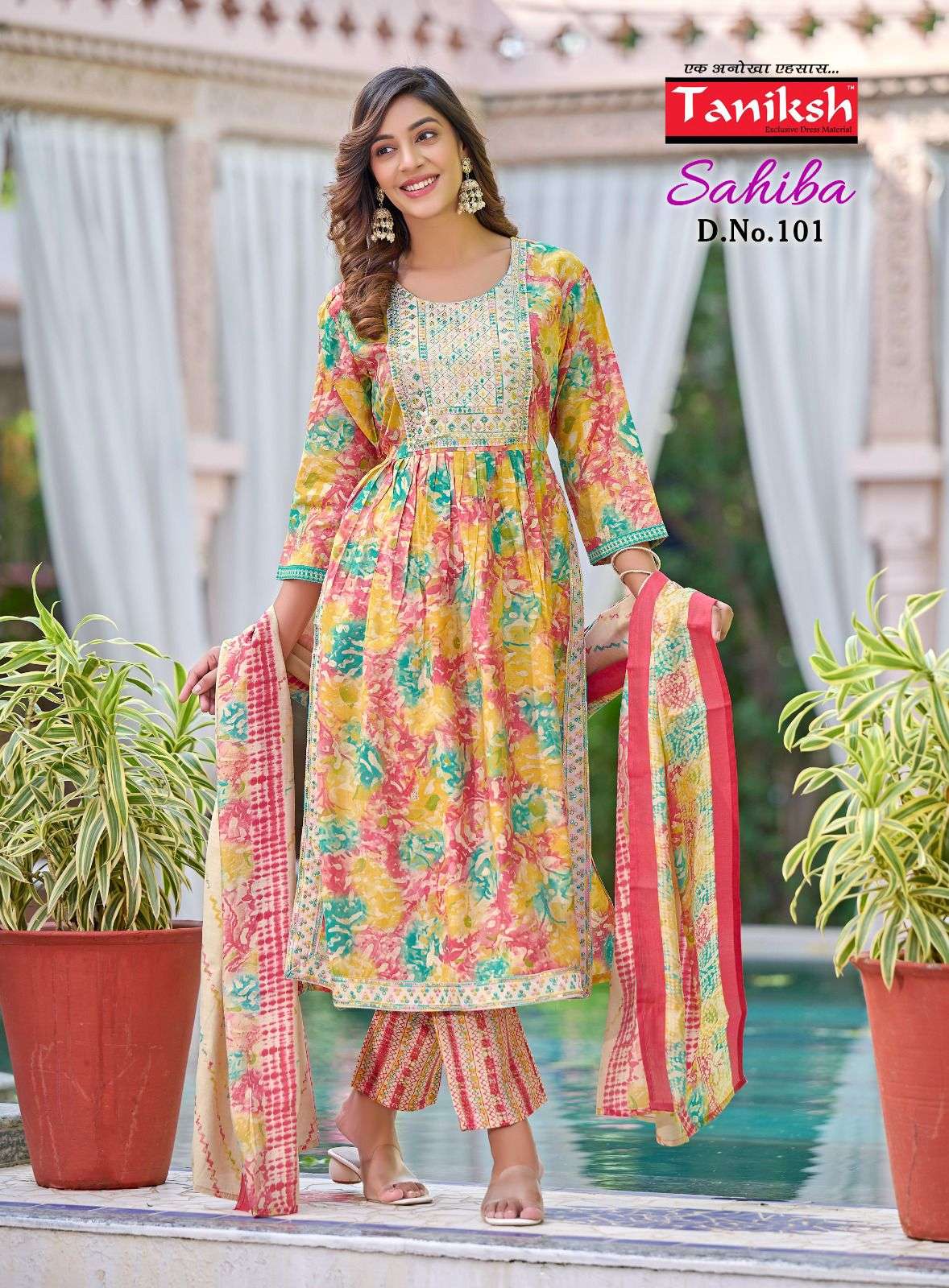 sahiba by taniksh muslin printed fancy nayra style kurti with pant and dupatta