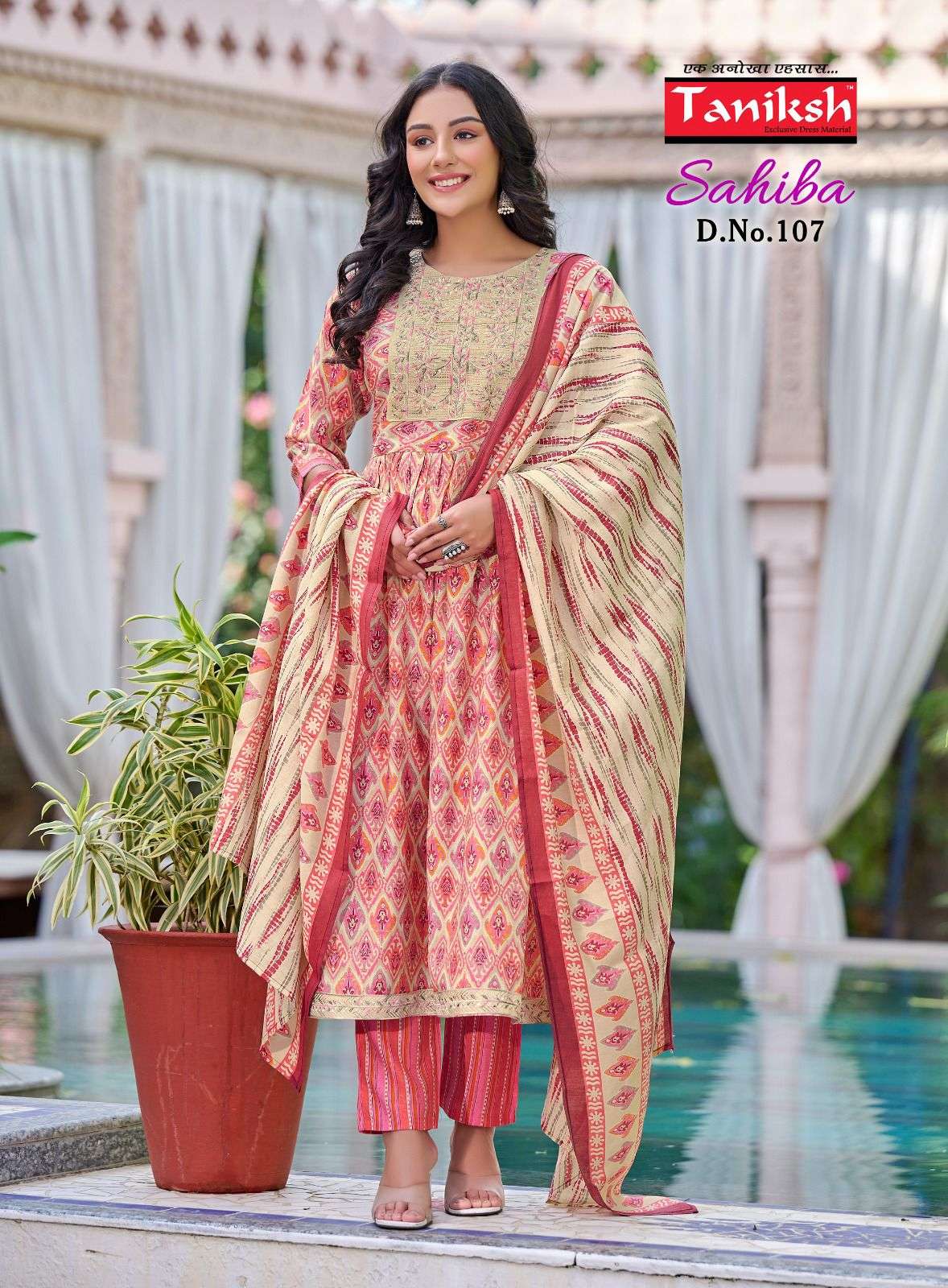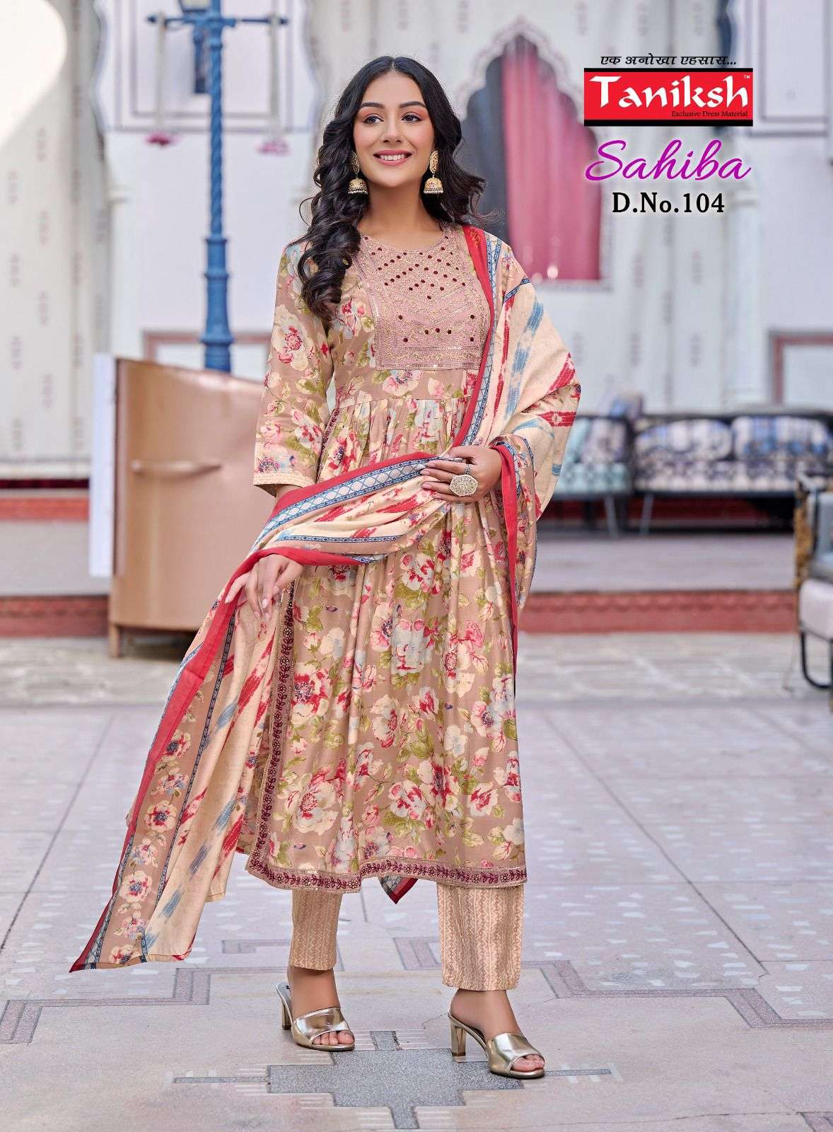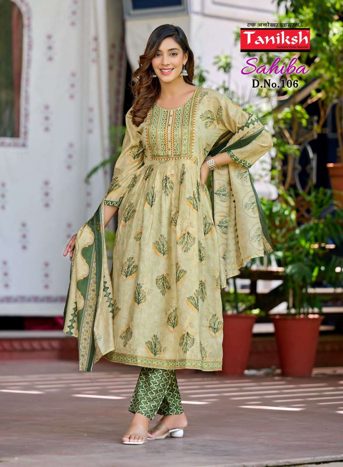 sahiba by taniksh muslin printed fancy nayra style kurti with pant and dupatta