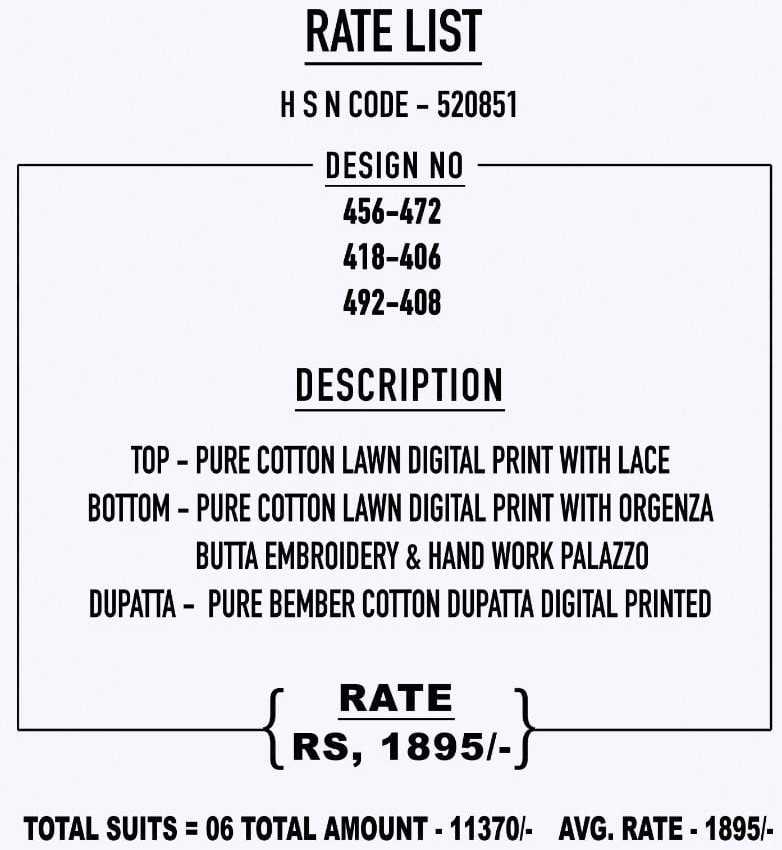 SAHIBA TOP - PURE COTTON LAWN DIGITAL PRINT WITH LACE BOTTOM - PURE COTTON LAWN DIGITAL PRINT WITH ORGENZA DUPATTA - PURE BEMBER COTTON DUPATTA DIGITAL PRINTED RATE-1895/- per pcs GST EXTRA Set to set |