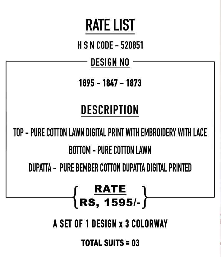 SAHIBA TOP - PURE COTTON LAWN DIGITAL PRINT WITH EMBROIDERY WITH LACE BOTTOM - PURE COTTON LAWN DUPATTA - PURE BEMBER COTTON DUPATTA DIGITAL PRINTED RATE: |