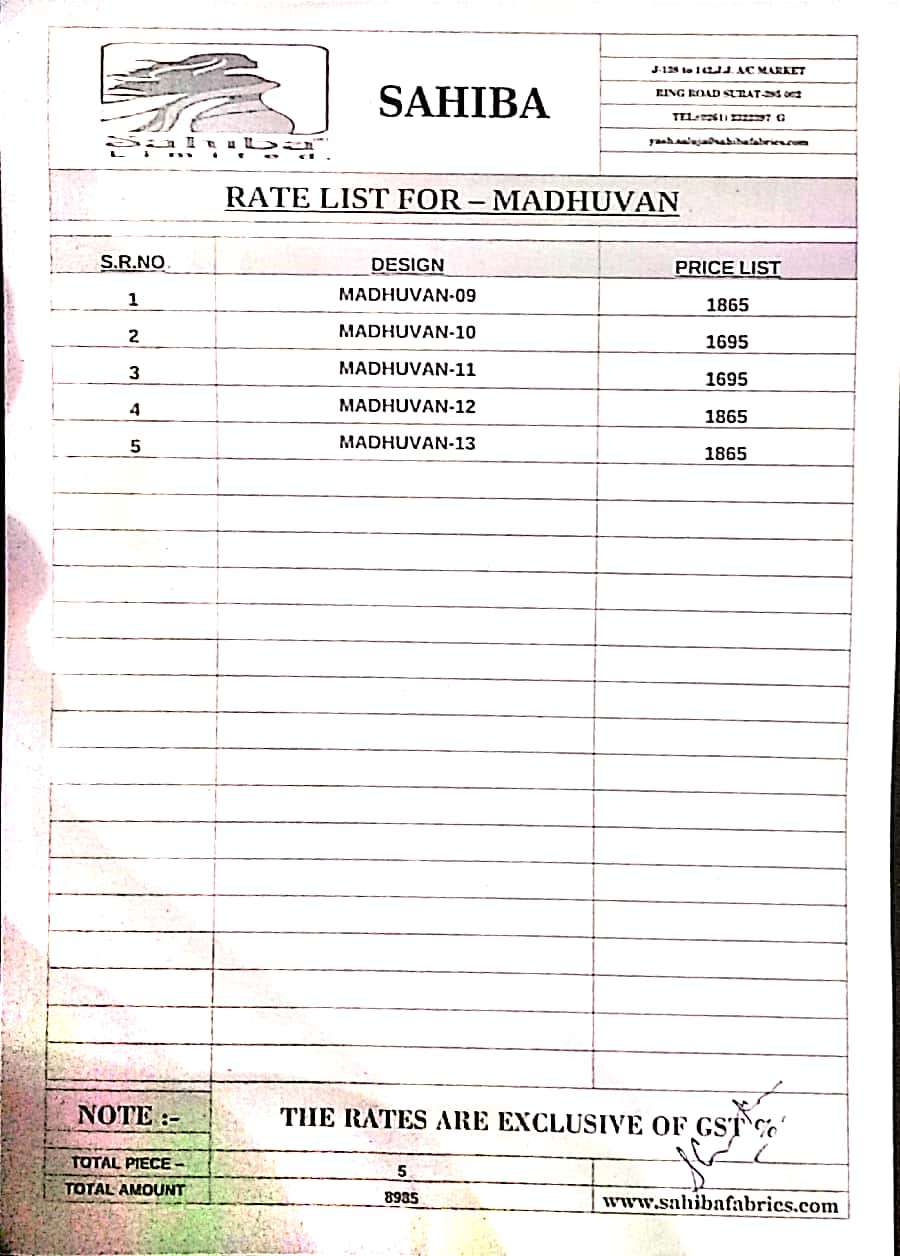 Brand - Sahiba . Catlog name - Madhuvan . Set to set. Delivery 3-4 days PRICE LIST HAS ATTACHED |