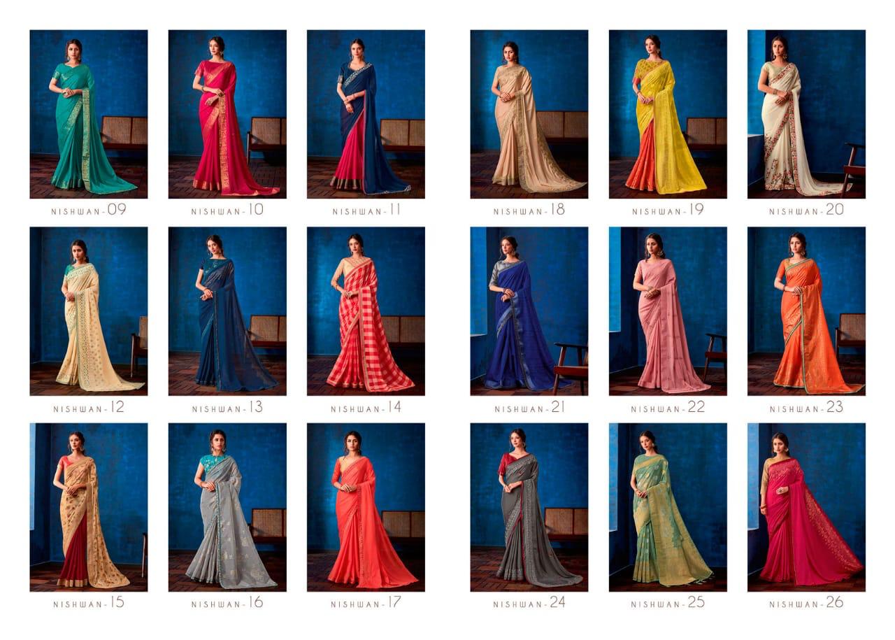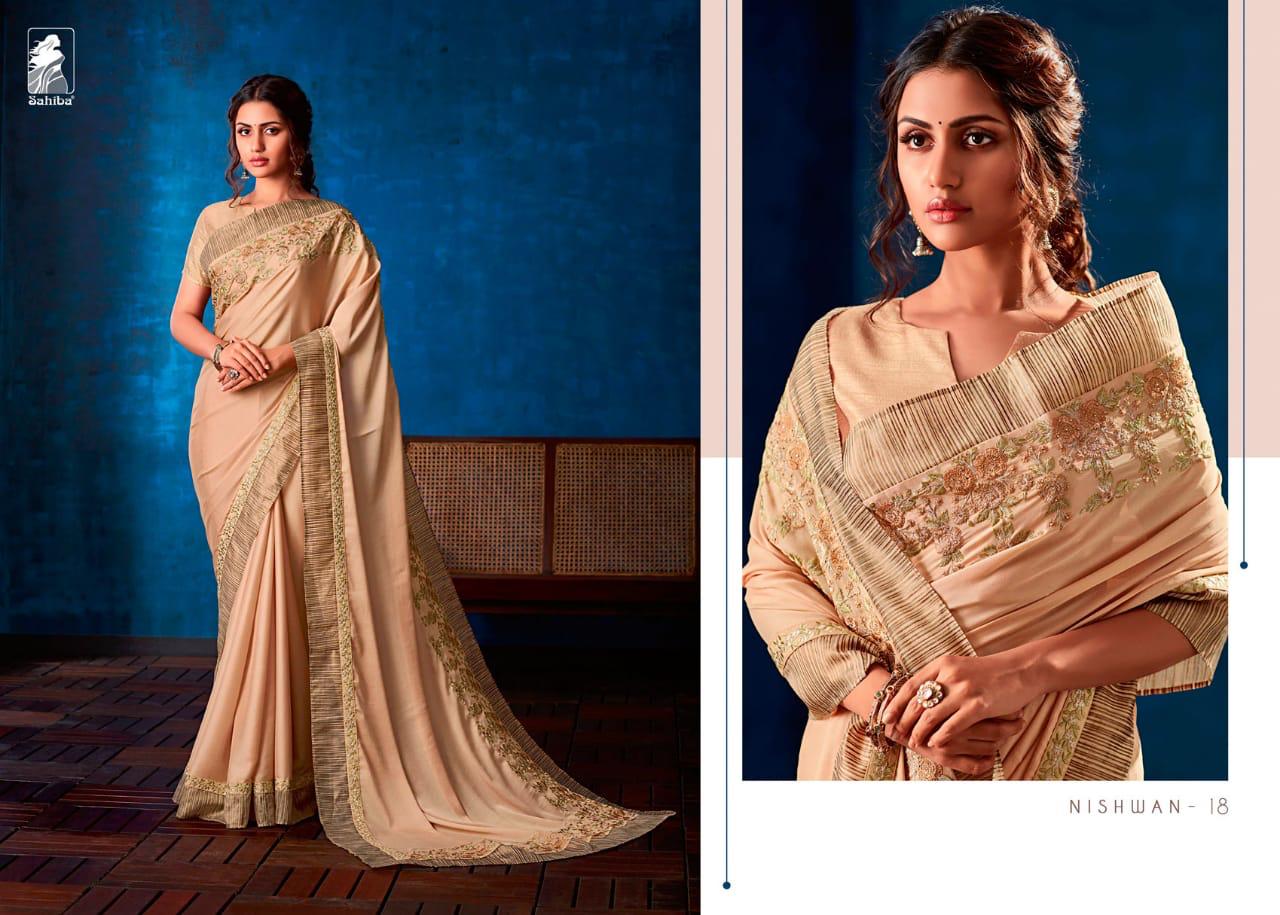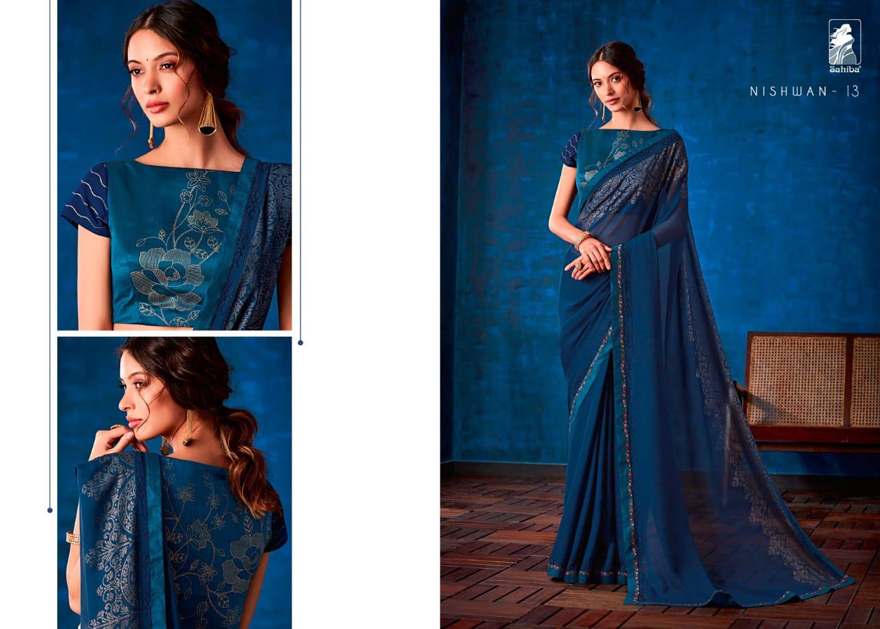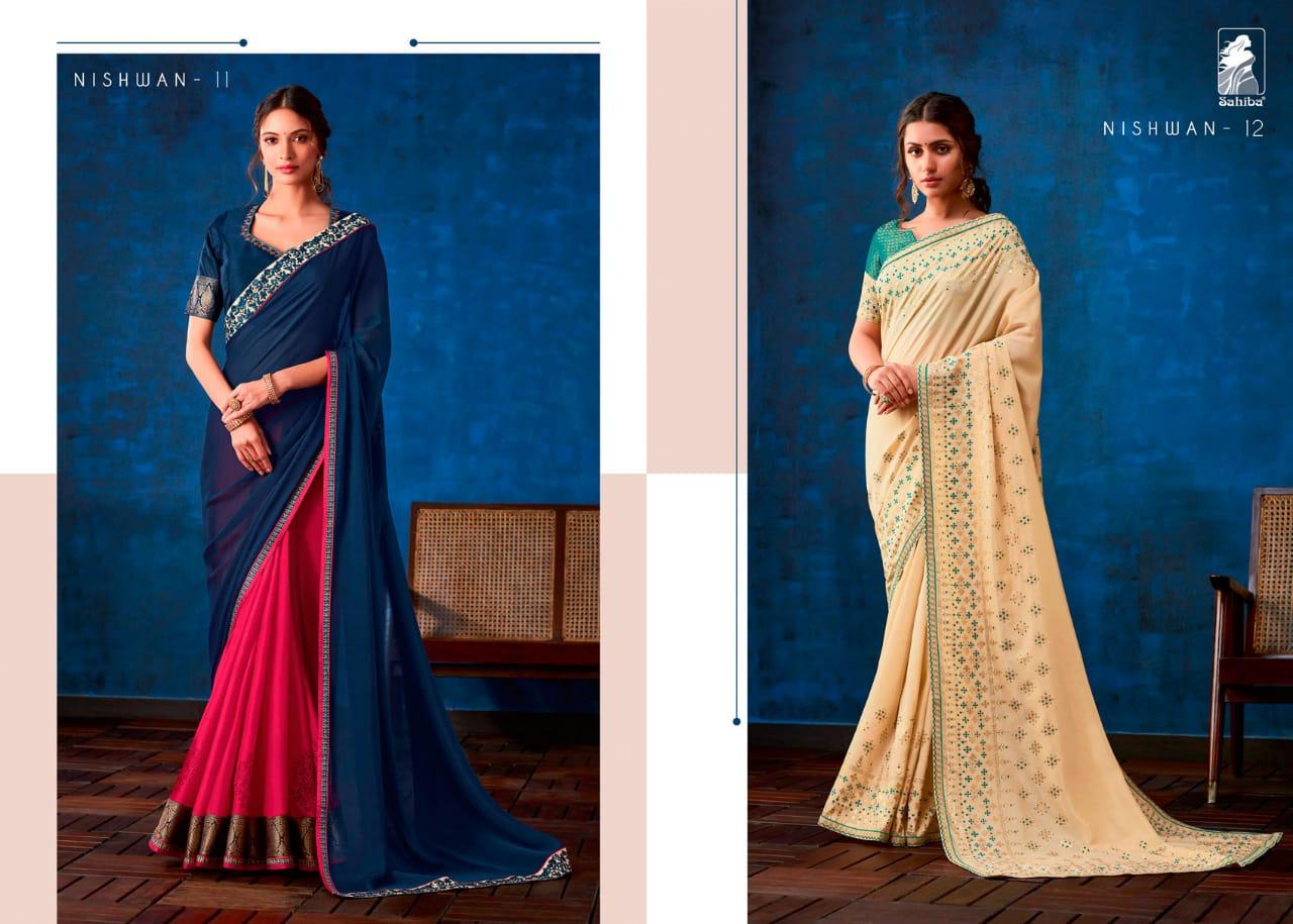 Brand- Sahiba Catlogue- Nishwan Fabric- *Fancy georget with fancy lace border and fancy blouse * Rate- AVERAGE RATE 1326₹ Pc ~ 18 GST- 5% Delivery- 2-3 Days |