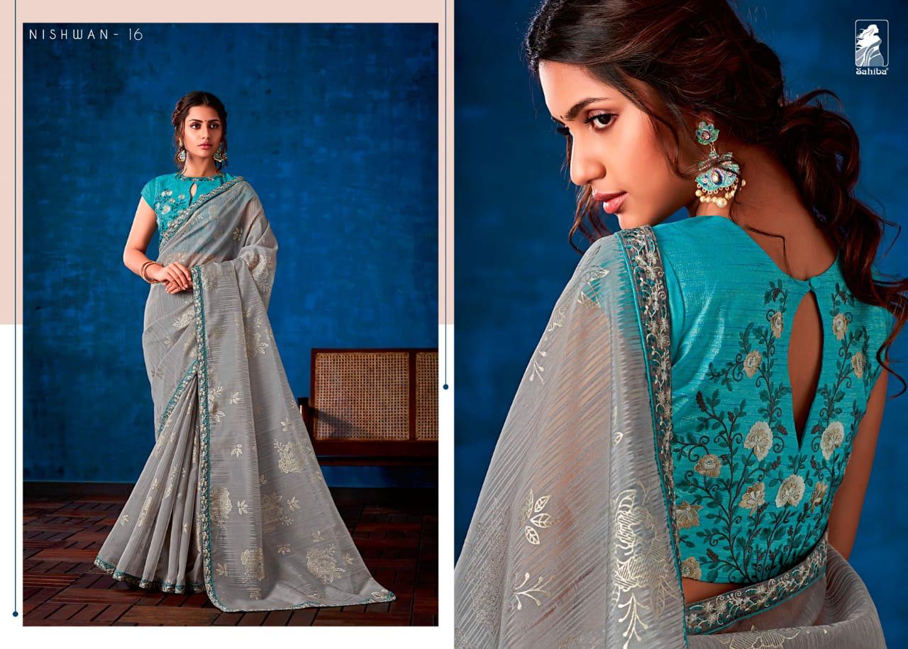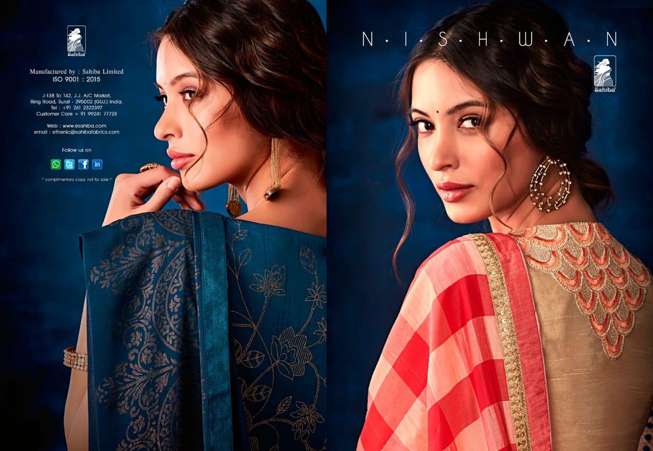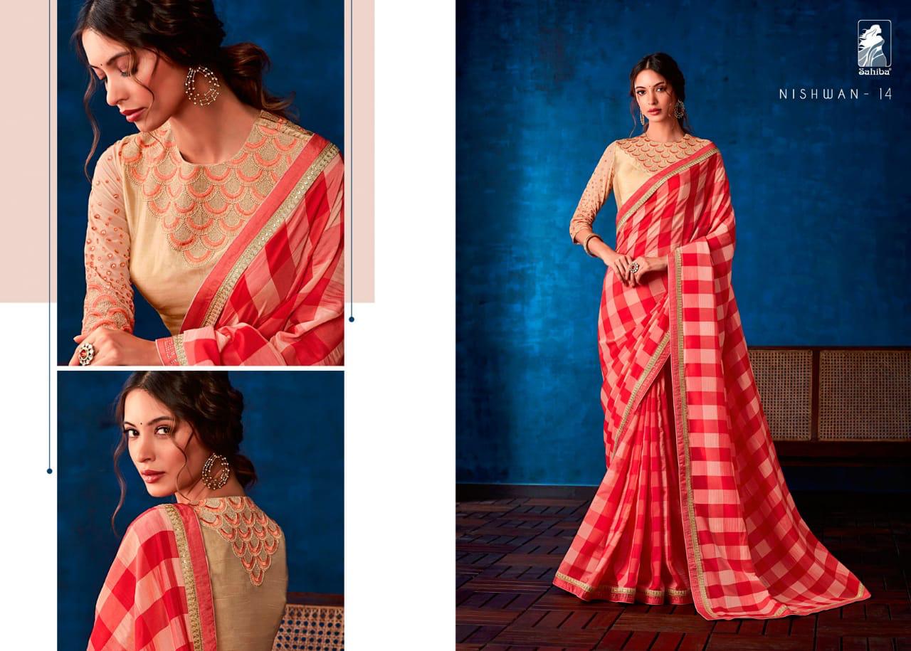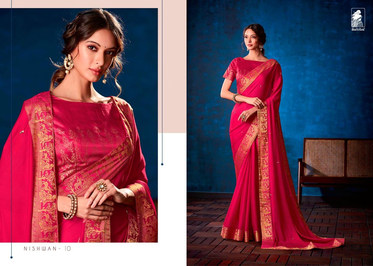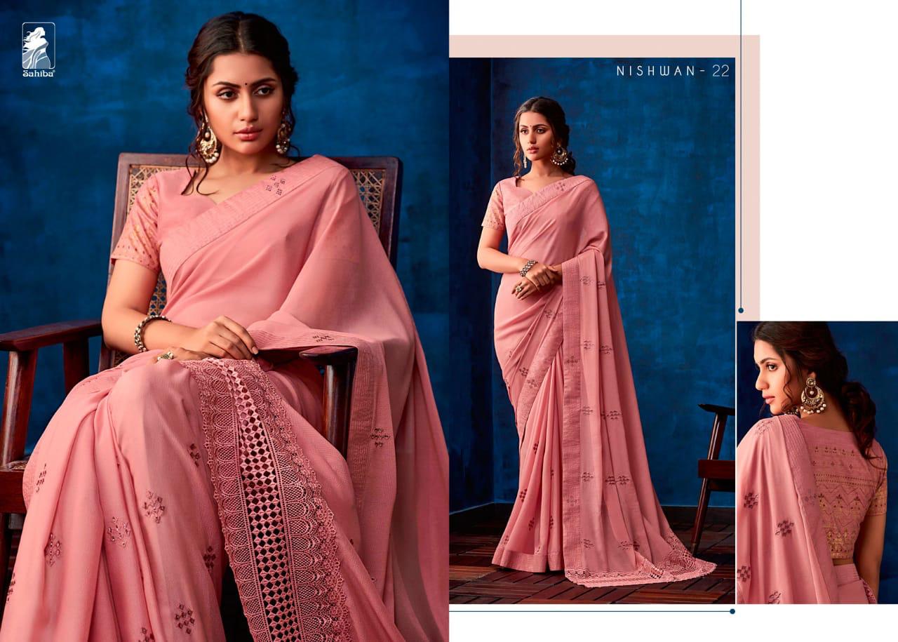 Brand- Sahiba Catlogue- Nishwan Fabric- *Fancy georget with fancy lace border and fancy blouse * Rate- AVERAGE RATE 1326₹ Pc ~ 18 GST- 5% Delivery- 2-3 Days |