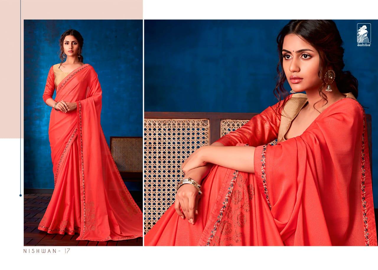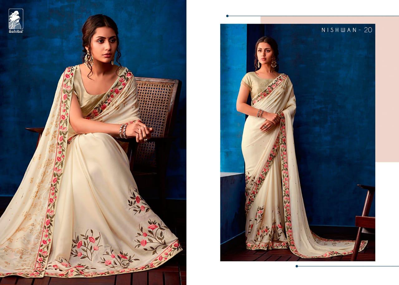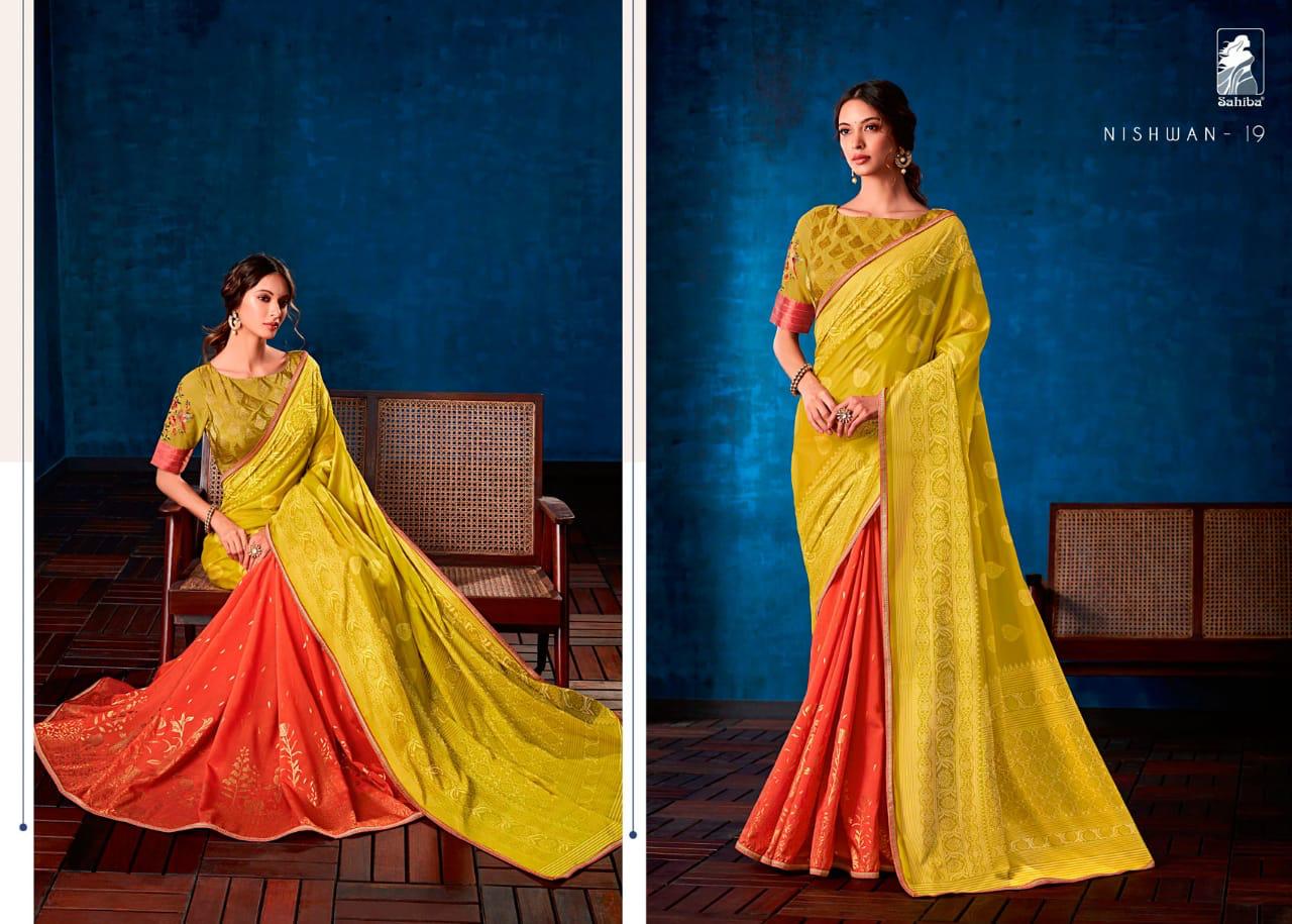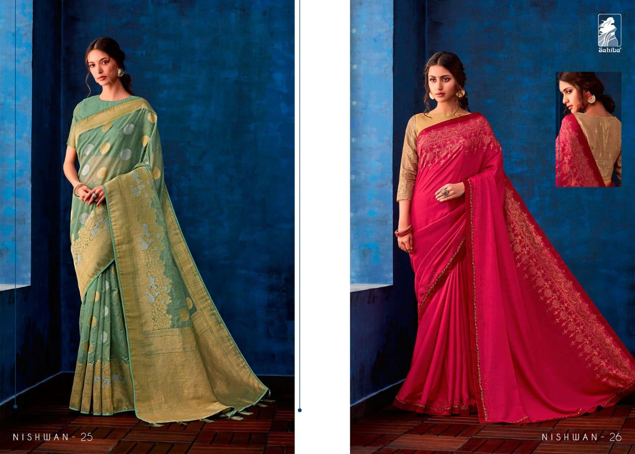 Brand- Sahiba Catlogue- Nishwan Fabric- *Fancy georget with fancy lace border and fancy blouse * Rate- AVERAGE RATE 1326₹ Pc ~ 18 GST- 5% Delivery- 2-3 Days |