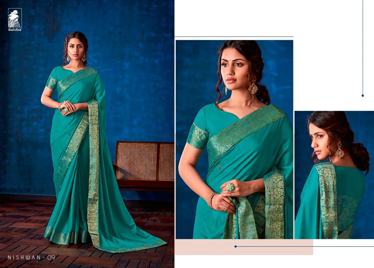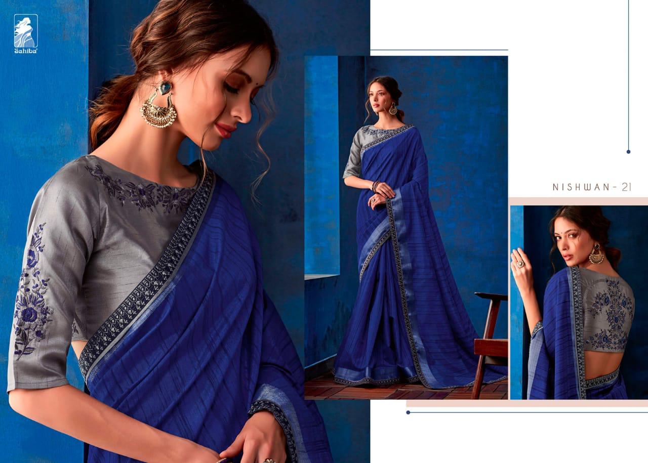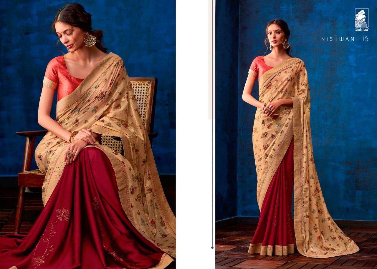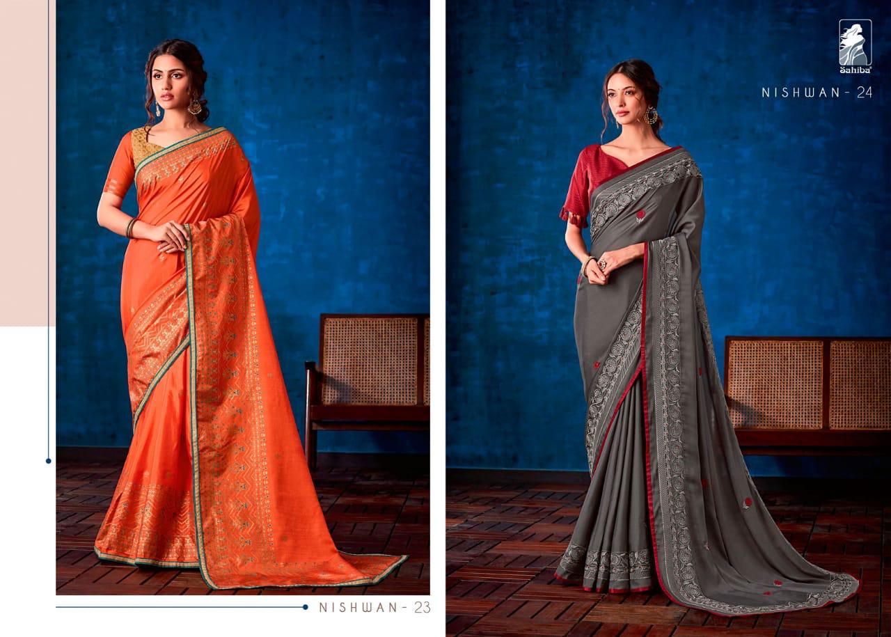 Brand- Sahiba Catlogue- Nishwan Fabric- *Fancy georget with fancy lace border and fancy blouse * Rate- AVERAGE RATE 1326₹ Pc ~ 18 GST- 5% Delivery- 2-3 Days |
