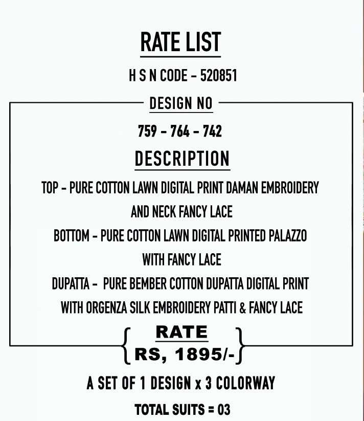 SAHIBA TOP - PURE COTTON LAWN DIGITAL PRINT DAMAN EMBROIDERY BOTTOM - PURE COTTON LAWN DIGITAL PRINTED PALAZZO DUPATTA - PURE BEMBER COTTON DUPATTA DIGITAL PRINT WITH ORGENZA SILK EMBROIDERY PATTI & FANCY LACE RATE: |