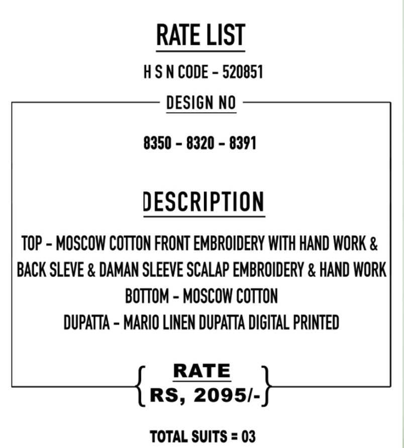 SAHIBA TOP - MOSCOW COTTON FRONT EMBROIDERY WITH HAND WORK & BACK SLEVE & DAMAN SLEEVE SCALAP EMBROIDERY & HAND WORK BOTTOM - MOSCOW COTTON DUPATTA - MARIO LINEN DUPATTA DIGITAL PRINTED RATE: GST EXTRA Set to set |