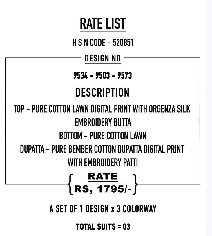 SAHIBA TOP - PURE COTTON LAWN DIGITAL PRINT WITH ORGENZA SILK BOTTOM - PURE COTTON LAWN DUPATTA - PURE BEMBER COTTON DUPATTA DIGITAL PRINT RATE: |