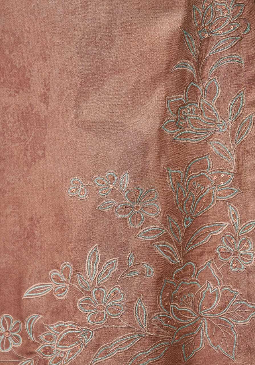 SAHIBA TOP - STAPLE TWILL DIGITAL PRINT WITH EMBROIDERY AND HAND WORK BOTTOM - STAPLE TWILL DUPATTA - PASHMINA TWILL DIGITAL PRINTED DUPATTA AND ORGANZA SILK DYED PATTI WITH EMBROIDERY RATE: |
