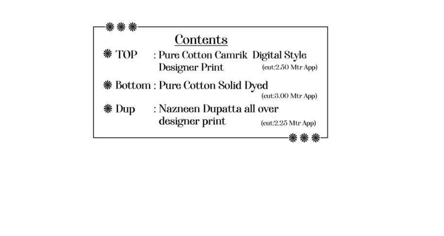 👖 Bottom: Pure Cotton Solid Dyed; Cut: 3.00 mts Dupatta: Nazneen Dupatta all over designer print; Cut: 2.25 mts |