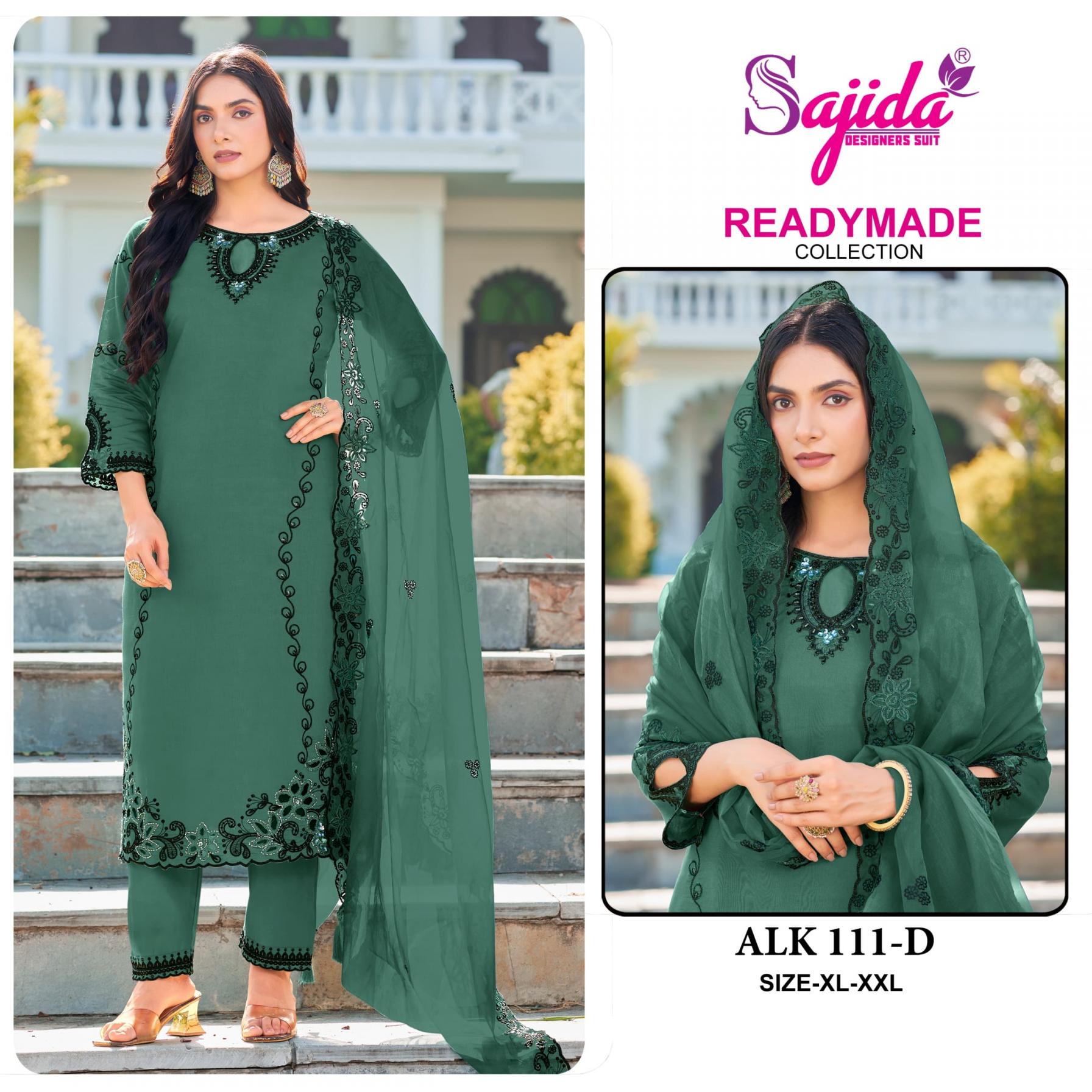 hello SAJIDA DESIGNER SUIT*BY *lounching new style leser work dress *READYMADE COLLECTION ALK - 111-A-B-C-D Top - RAGA ROMAN SILK WITH HEVAY EMBROIDERY WITH KHATLI WORK Bottom - RAGA ROMAN SILK WITH WORK Duptta - ORGANZA WITH WORK WITH LATKAN Rate - 1395/-
