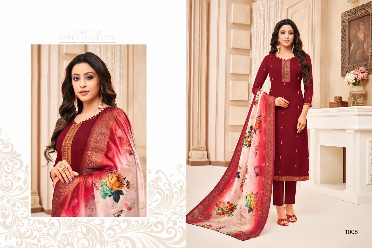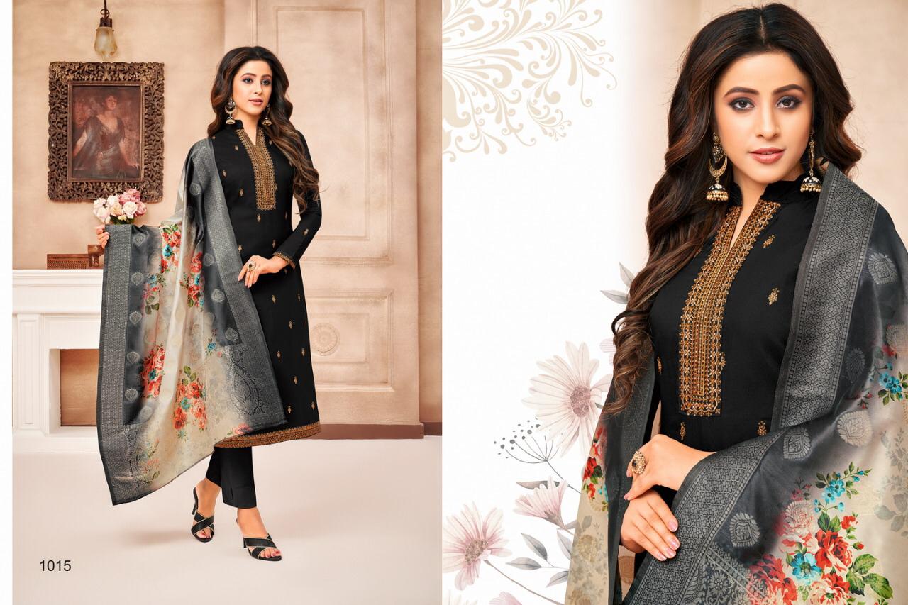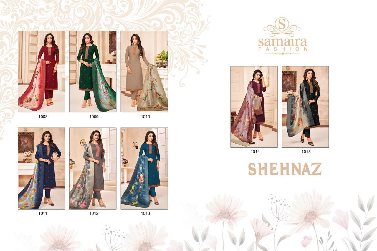 "SAMAIRA"_ BRAND CREATED BY YOU..... âÂÂ*FANTASTIC "*collection of.......8 designs....... ..." * SHEHNAZ "... BRAND CREATED BY YOU..... Fabric Details:- Top : - Maslin SILK WITH EMBRODARY WORK ... BOTTOM :- heavy dull santoon.... Dup. : - PURE JAQARD Digital banarsi dup .... price-: 999/â + G.s.t* Set to set . Delivery 4-5 days |