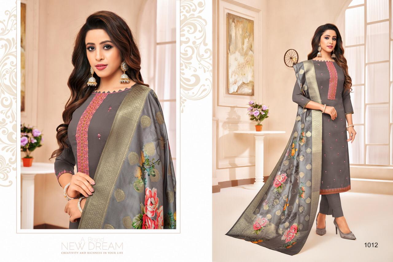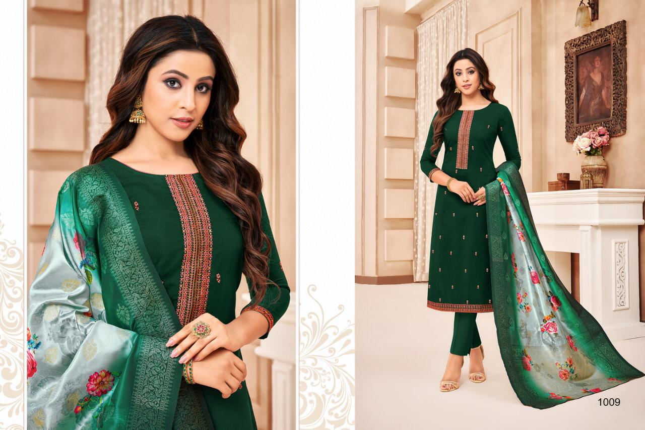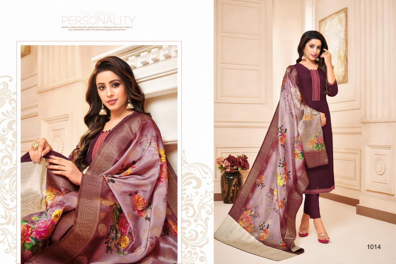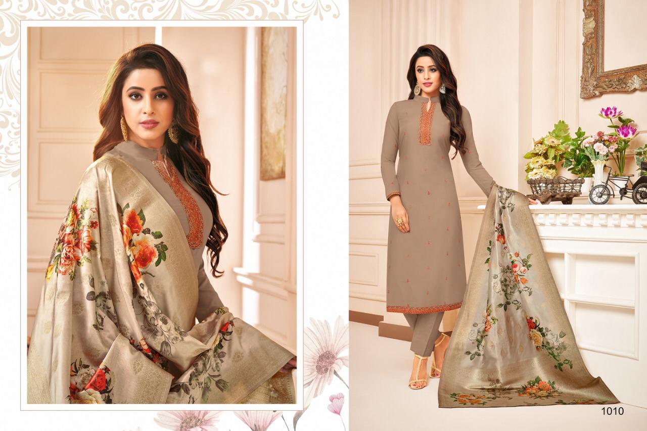"SAMAIRA"_ BRAND CREATED BY YOU..... âÂÂ*FANTASTIC "*collection of.......8 designs....... ..." * SHEHNAZ "... BRAND CREATED BY YOU..... Fabric Details:- Top : - Maslin SILK WITH EMBRODARY WORK ... BOTTOM :- heavy dull santoon.... Dup. : - PURE JAQARD Digital banarsi dup .... price-: 999/â + G.s.t* Set to set . Delivery 4-5 days |