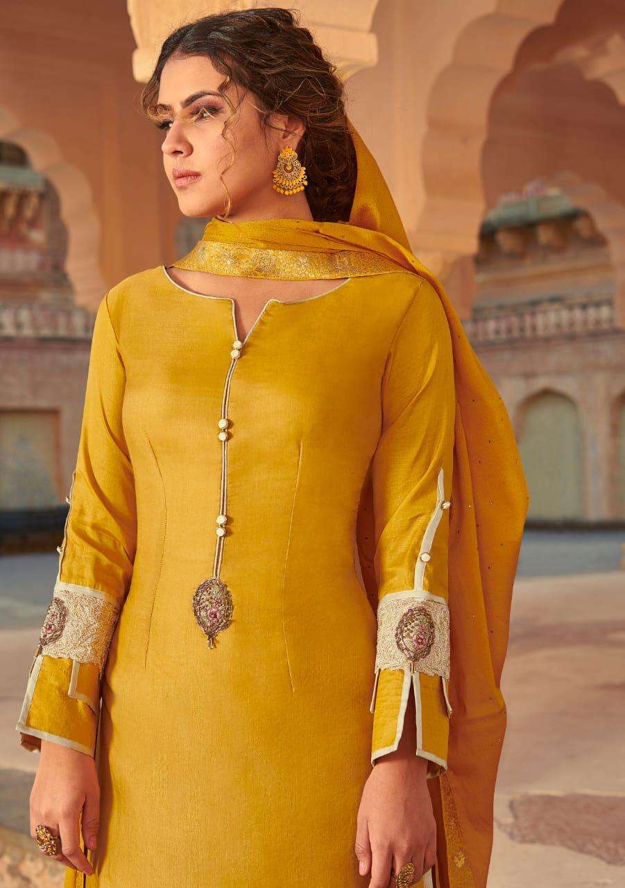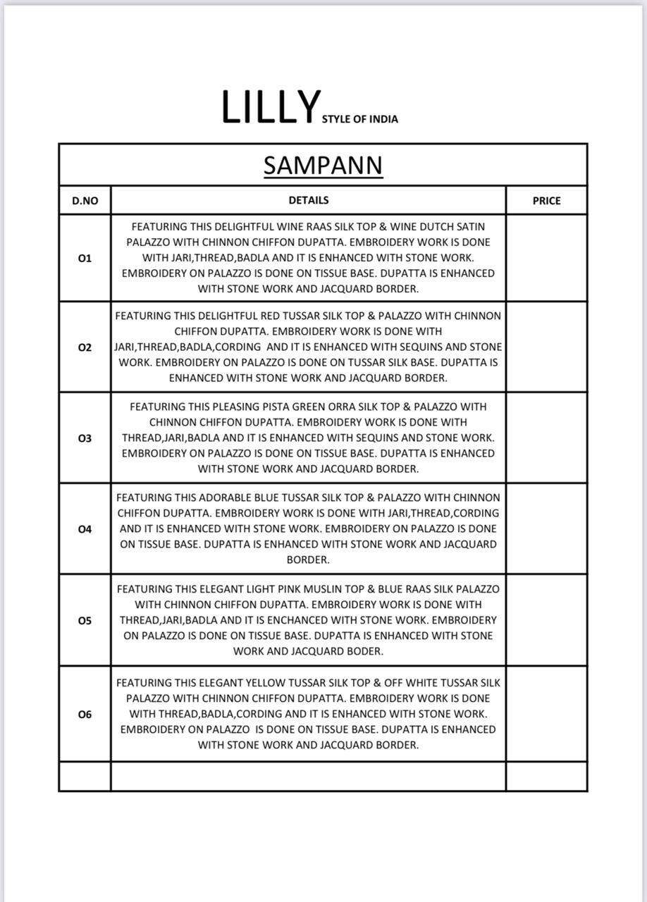 BRAND :- LILLY Style - Of india Dress materials catlouge 6 beautiful Design TOP :- tusar muslin Fabrics with thread, badla , cording nd enhance with stone work BOTTOM :- Embroidery work in plazo with extra edition DUPPATA :- Enhance with stone work and Jacquard border PCS :- 6 PRICE :-. 985/- |