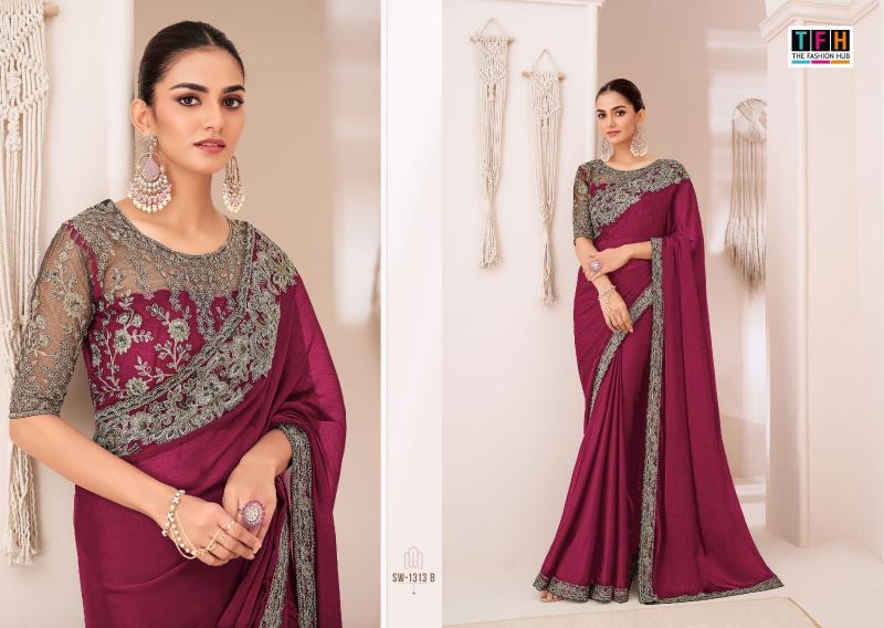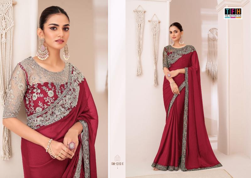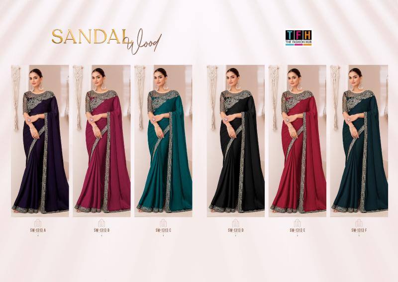 BRAND :TFH CATALOG NAME : SANDAL WOOD 1313 HIT COLOUR SERIES : 1313A TO 1313F SAREE FABRIC : GEORGETTE CHIFFON SAREE WITH EMBROIDERY LACE WORK BLOUSE : ART SILK WITH EMBROIDERY WORK NET BLOUSE PRICE LIST: 1883+5%GST OCCASION : PARTY WEAR |