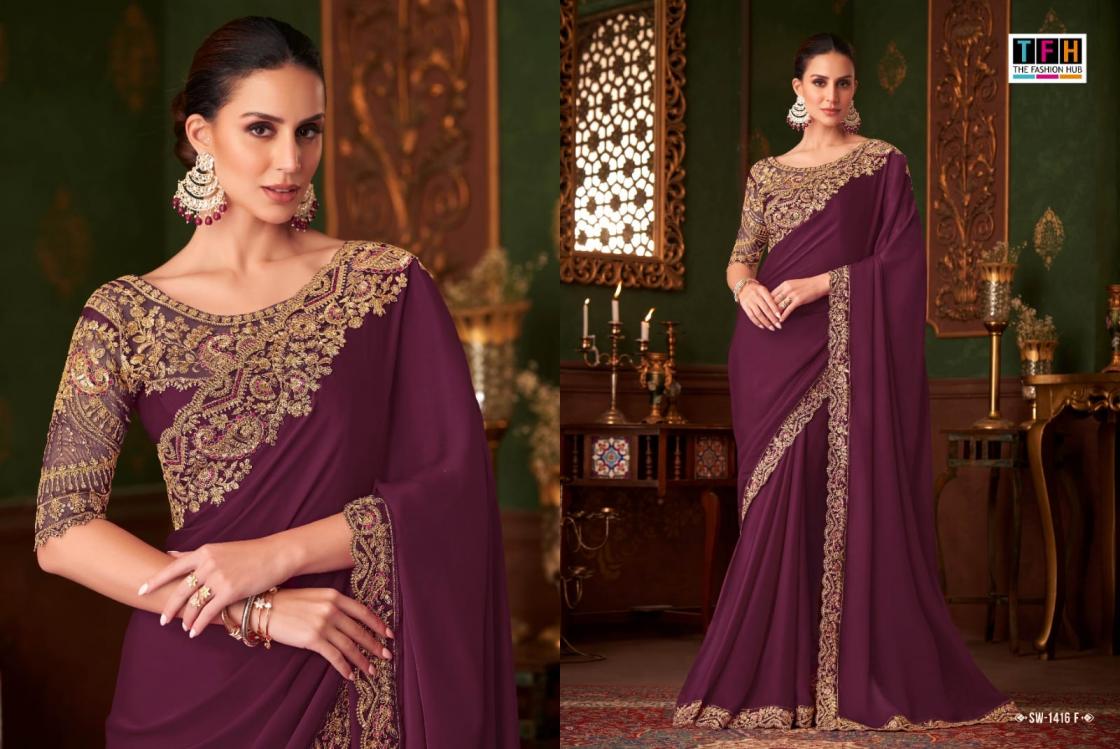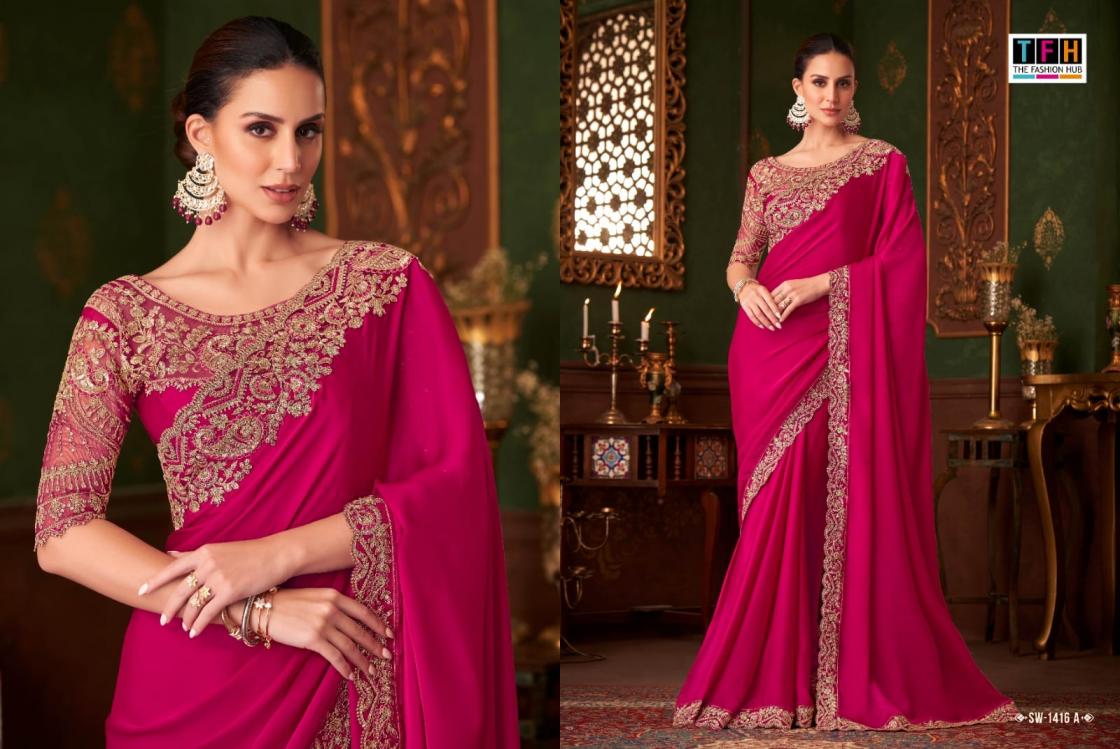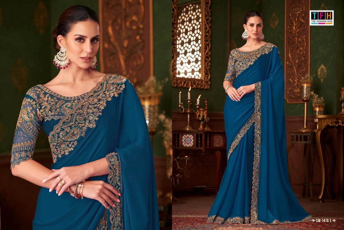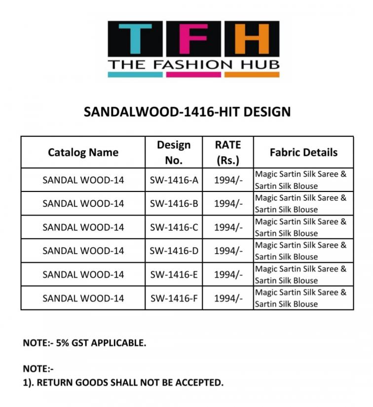 Brand : Tfh Catalog name : Sandal Wood 1416 Hit Series : 1416 To 1416F Colours Saree fabric : Attached with list Blouse : Attached with list Price list: Attached with list 5% Gst Occasion : Party wear, Festival Wear |