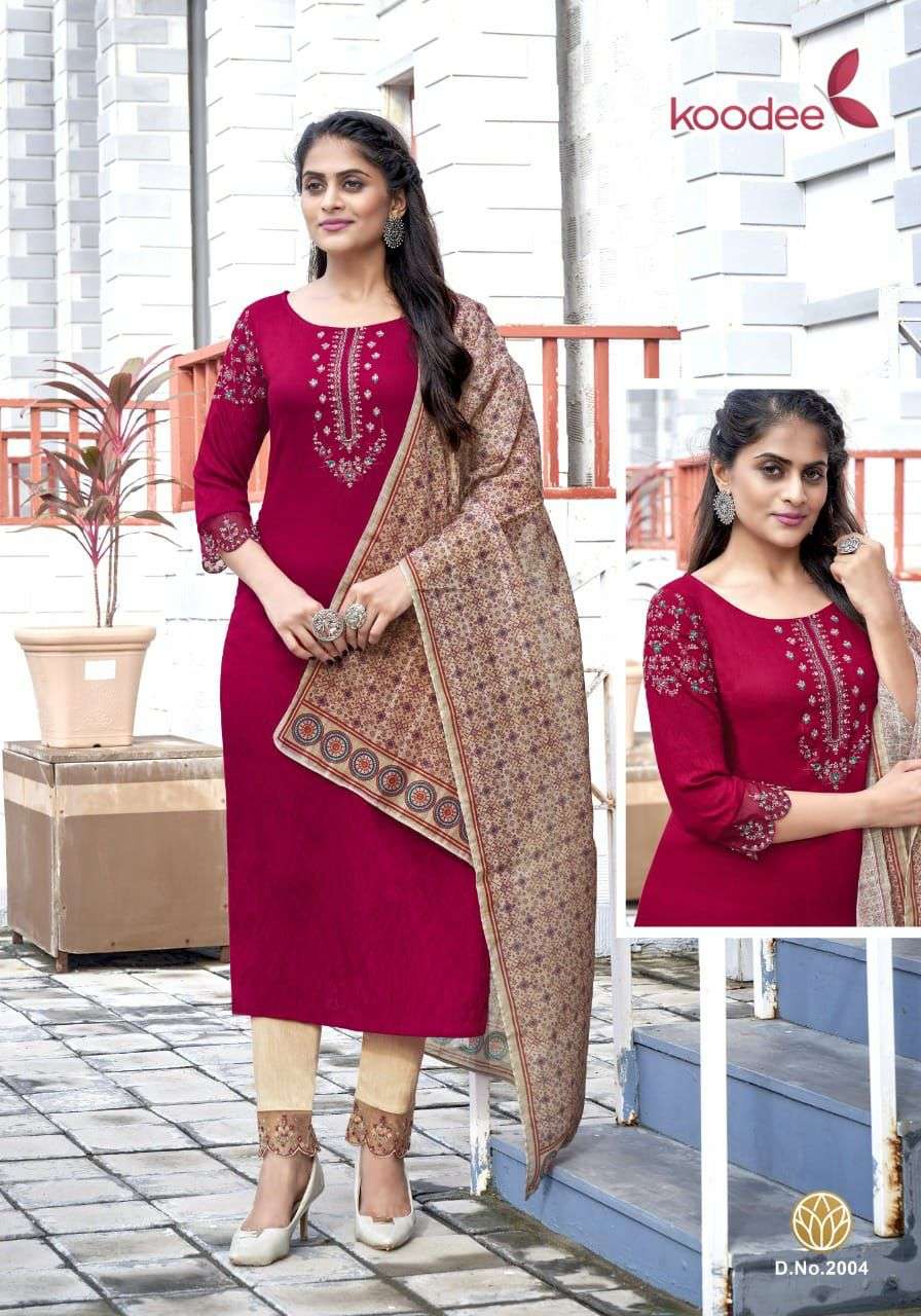 Such a comfy Kurti Pant With Dupatta Sets! Brand Name : KOODEE Catalog : Sandhya Vol 2 Designs : 6 Fabric:- Top:- Pure Nylon Viscose With 3D Weaving Bottom :- Cotton Slub Lycra With Embroidery Work Duppata :- Nylon Viscose Weaving Sequence With Digital Print Work: Embroidery + Khatli Work Size : S(36),M(38), L(40), XL(42), 2XL(44), 3XL(46) Dispatching :- 3 to 4 days  Rate :- 1195 + 5% gst Set to set |