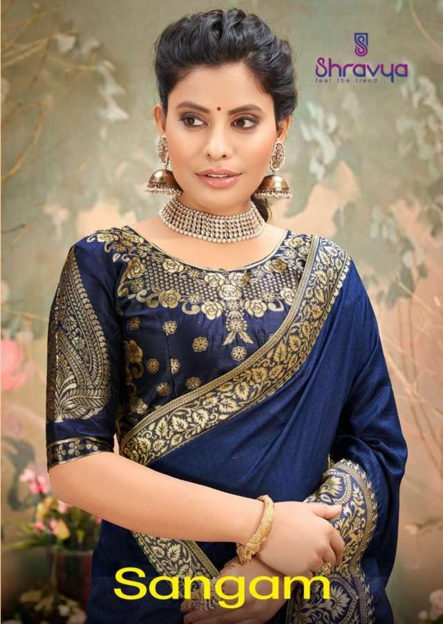 SANGAM Item name : SANGAM Brand name : Shravya fashion No. Of design : 8 colour Fabric : DOLLA SILK WITH FANCY COLOUR MATCHING ALONGWITH HEAVY JACQUARD BORDER AND BLOUSE Packing : Set to set Rate-390/- |