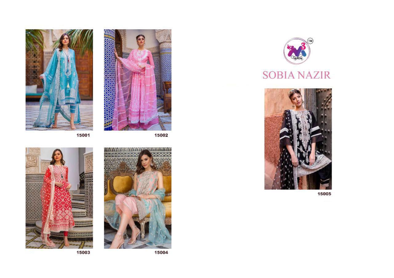 Today SANIYA TRENDZé︠hitting market again with exclusively trending series of pakistani catlogs SOBIA NAZIR lawn collection Premium collection Fabric details picture Top: Pure cotton with embroidery Bottom: semi lawn Dupatta: butterfly net with embroidery Price : 1050/-+ 5%GST â¤ï¸Â5pc Set to set. Delivery 6-7 days |