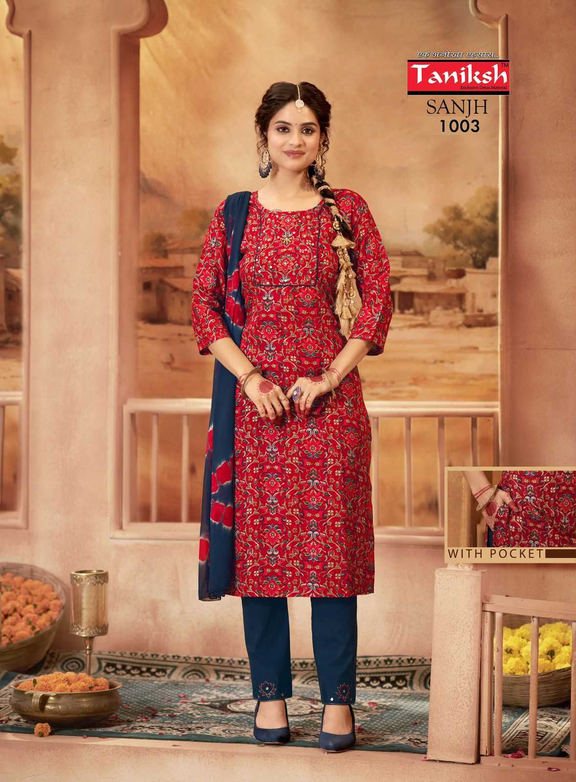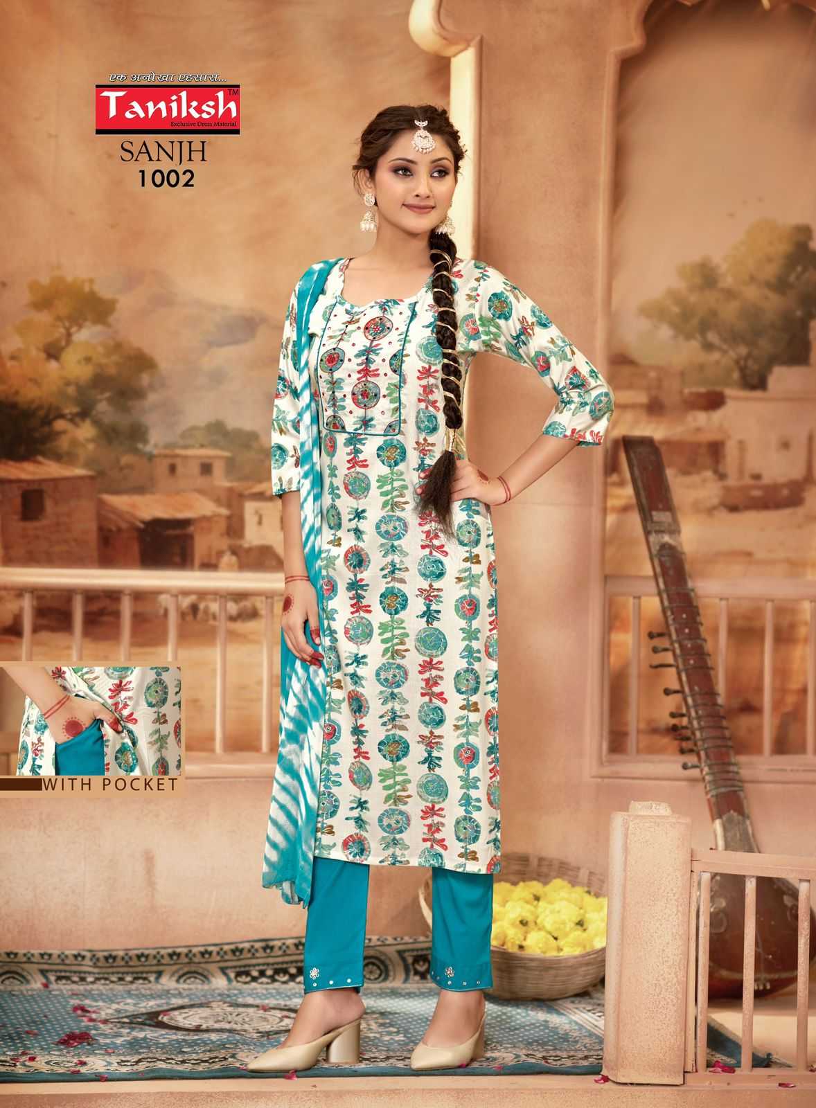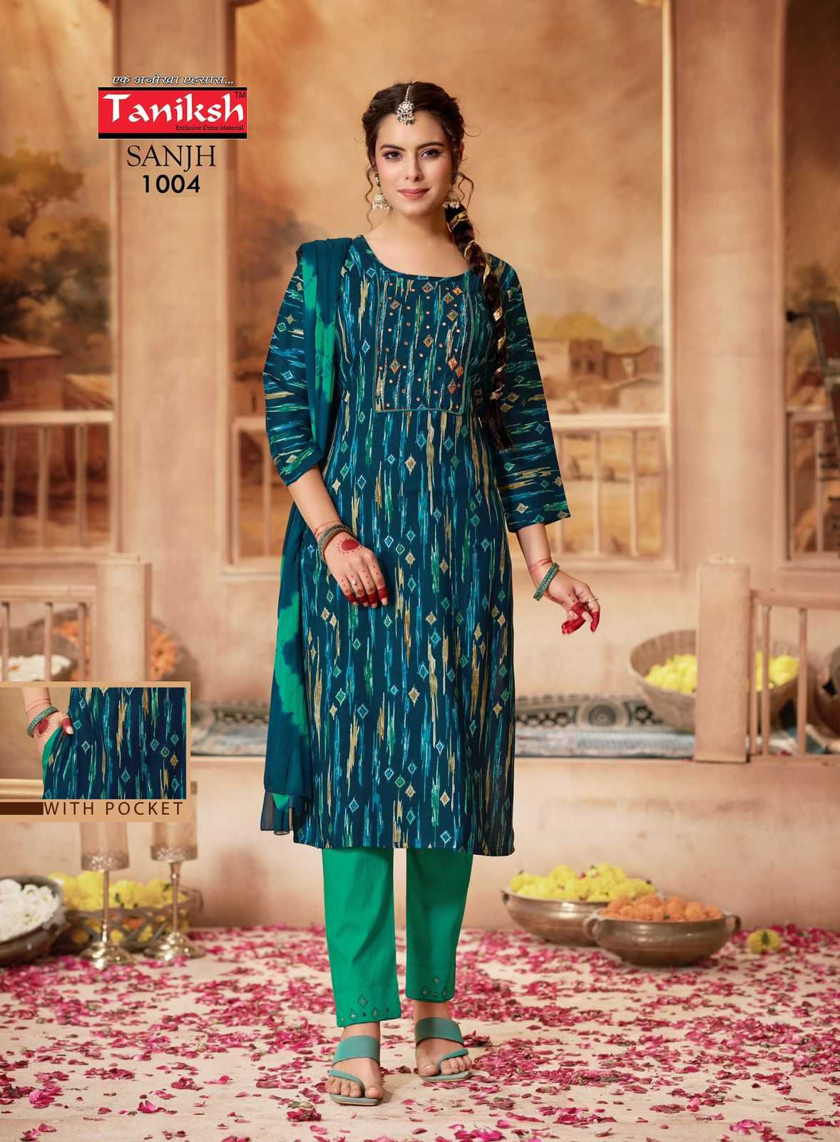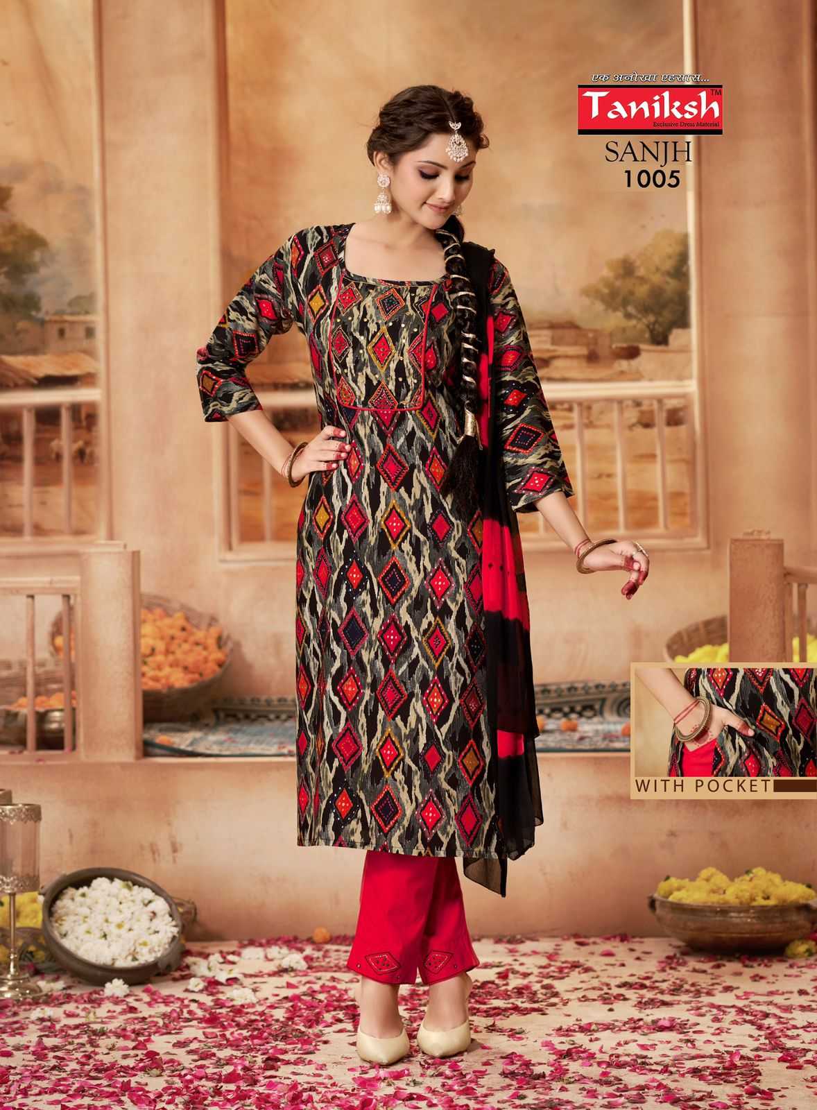 sanjh vol 1 by taniksh readymade fancy rayon foil print big size salwar suit festival collection