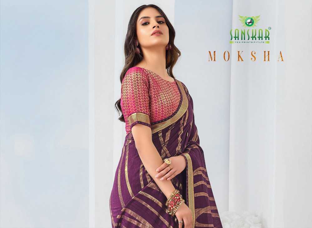 New launching CATLOUGE-MOKSHA Fabric-Moksha Foil Print With banarasi sirowski. Border & blouse Rate - 775/- |