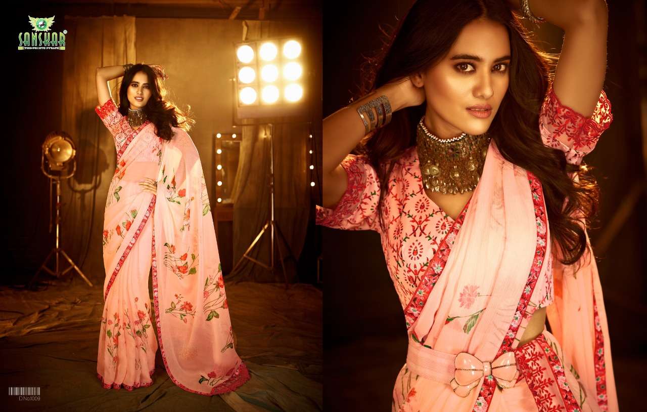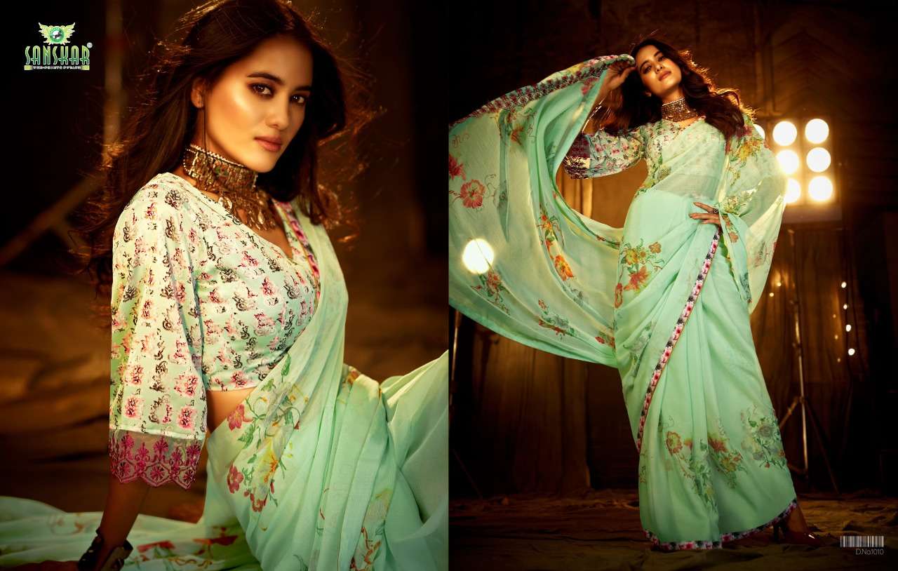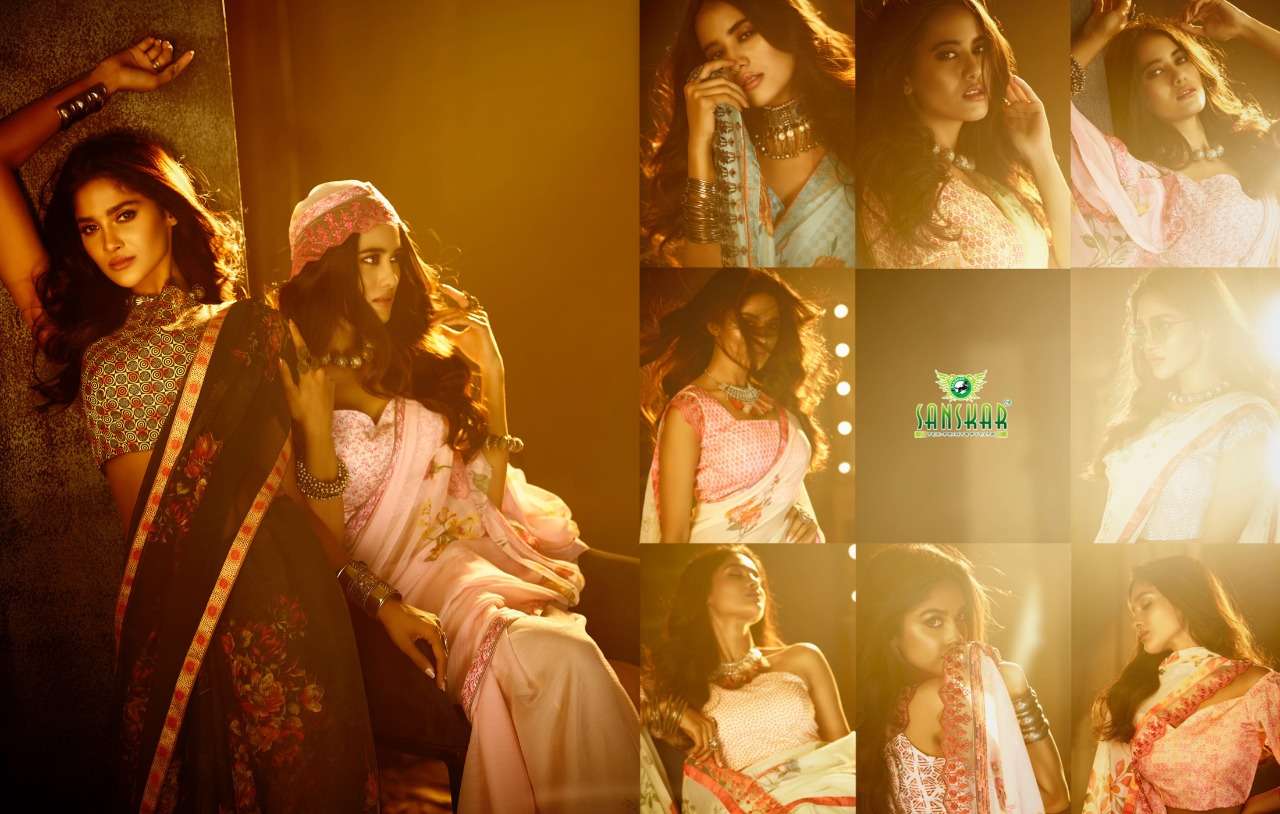 New launching Sanskar tex prints pvt. ltd. CATLOUGE- CRAZY Fabric- pure chiffon embroidery work blouse with digital border Qty- 12 dis RATE - 595₹ _Special fany pure chiffon Catalogue!!_ Ready to Dispatch |