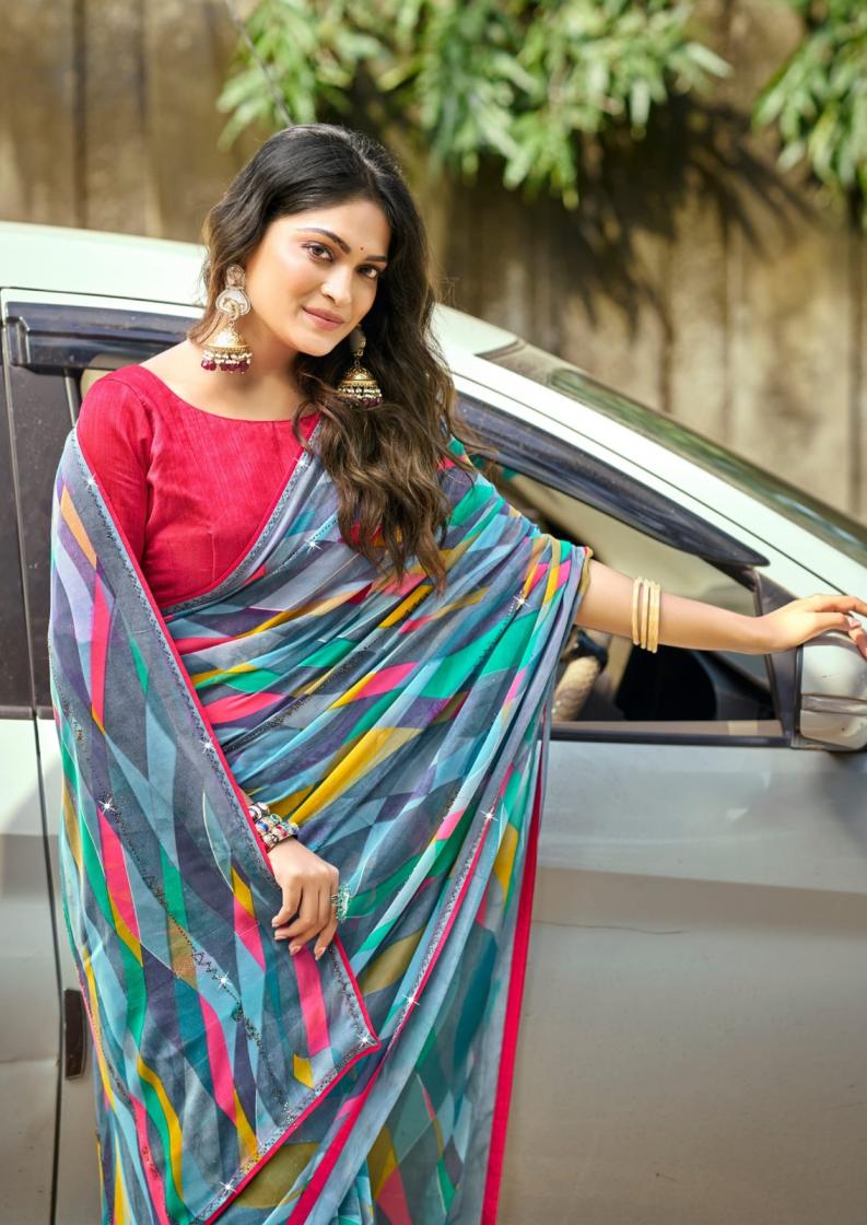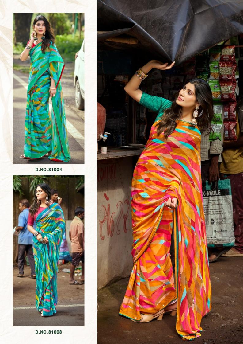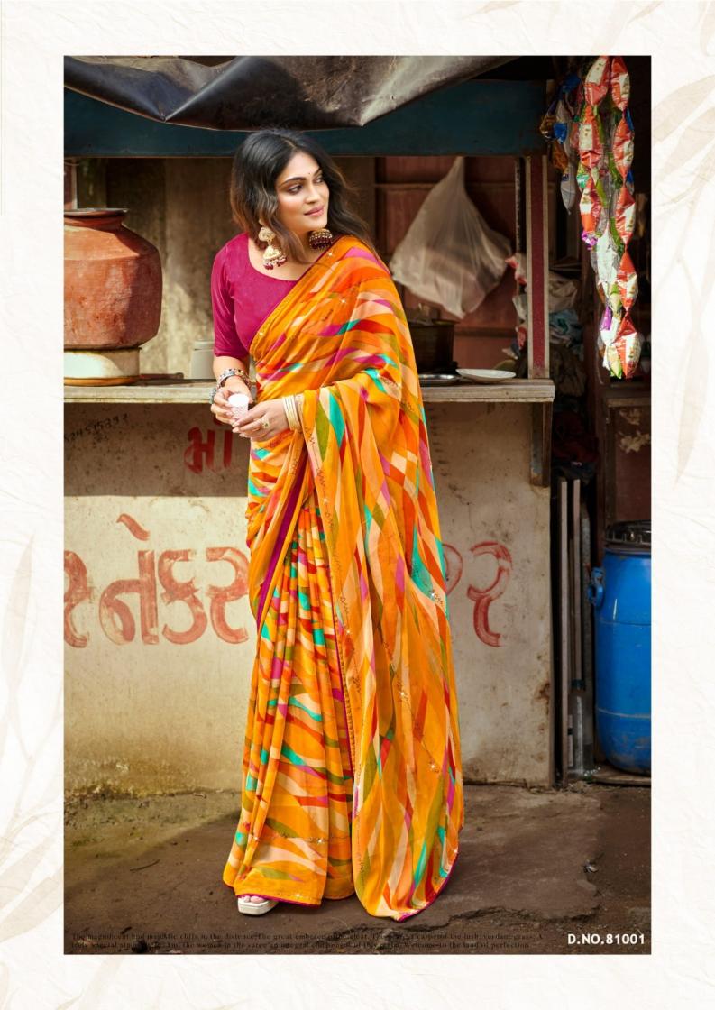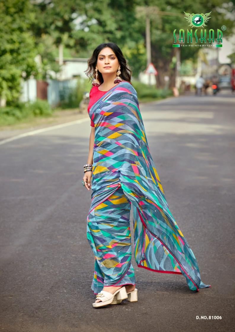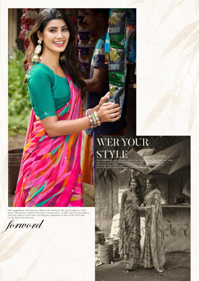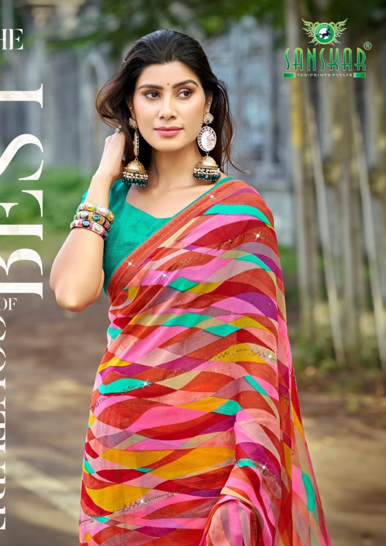 Sanskar Tex Prints Pvt Ltd CATLOUGE- Kalikar Fabric- Pure Wehttiless Fancy Print with Sirogi Work fancye🪡 border & blouse Qty- 8dis RATE - 630₹ +gst _Special New addition pure bamber georgette Catalogue!!_ |