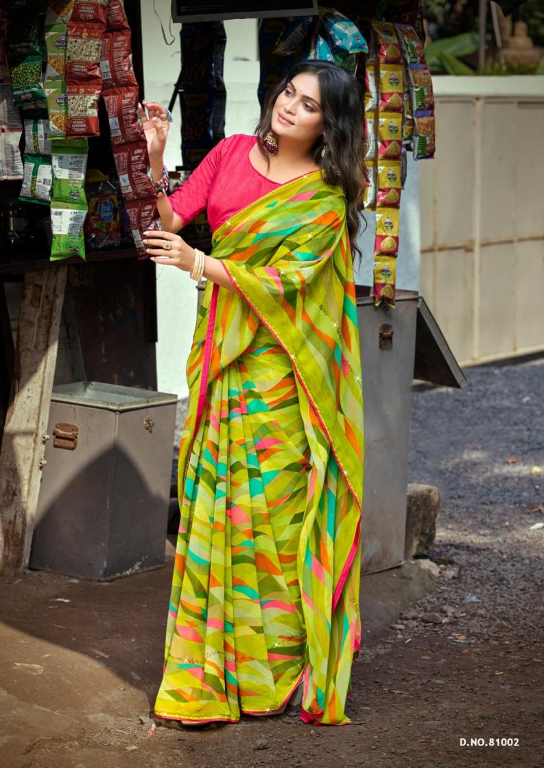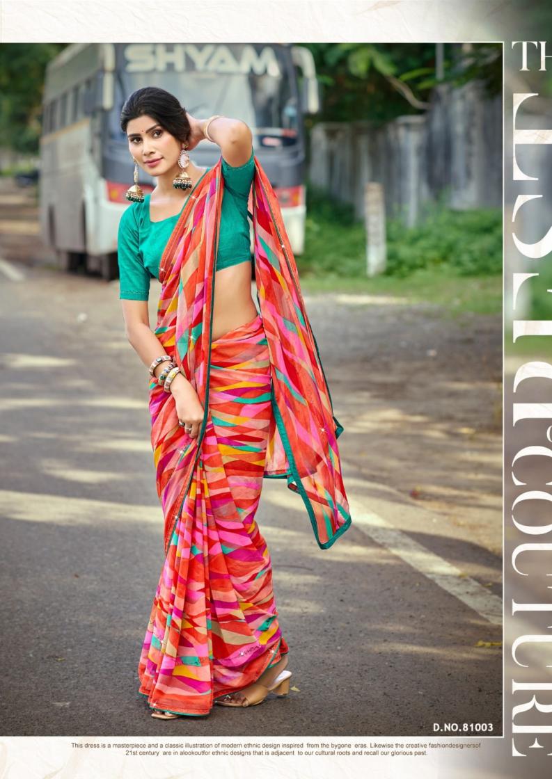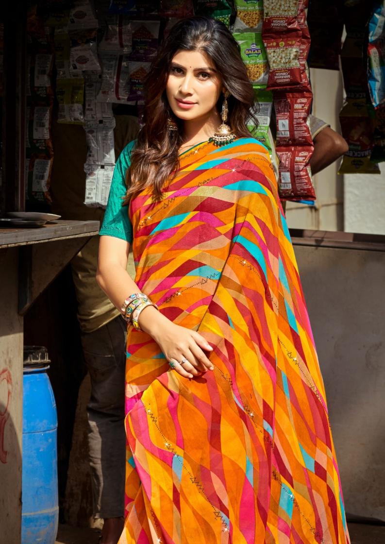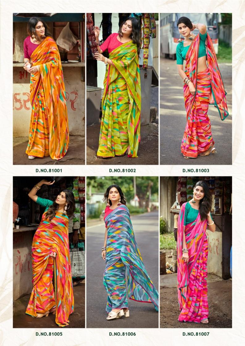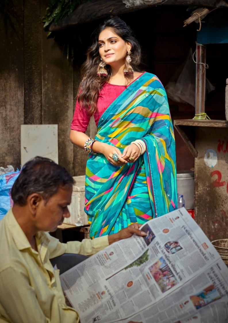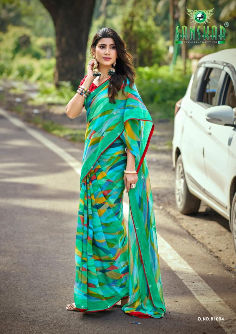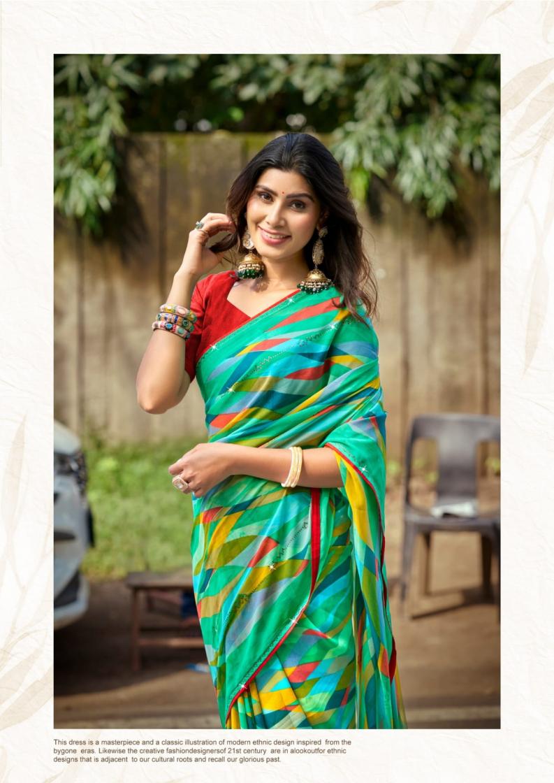 Sanskar Tex Prints Pvt Ltd CATLOUGE- Kalikar Fabric- Pure Wehttiless Fancy Print with Sirogi Work fancye🪡 border & blouse Qty- 8dis RATE - 630₹ +gst _Special New addition pure bamber georgette Catalogue!!_ |