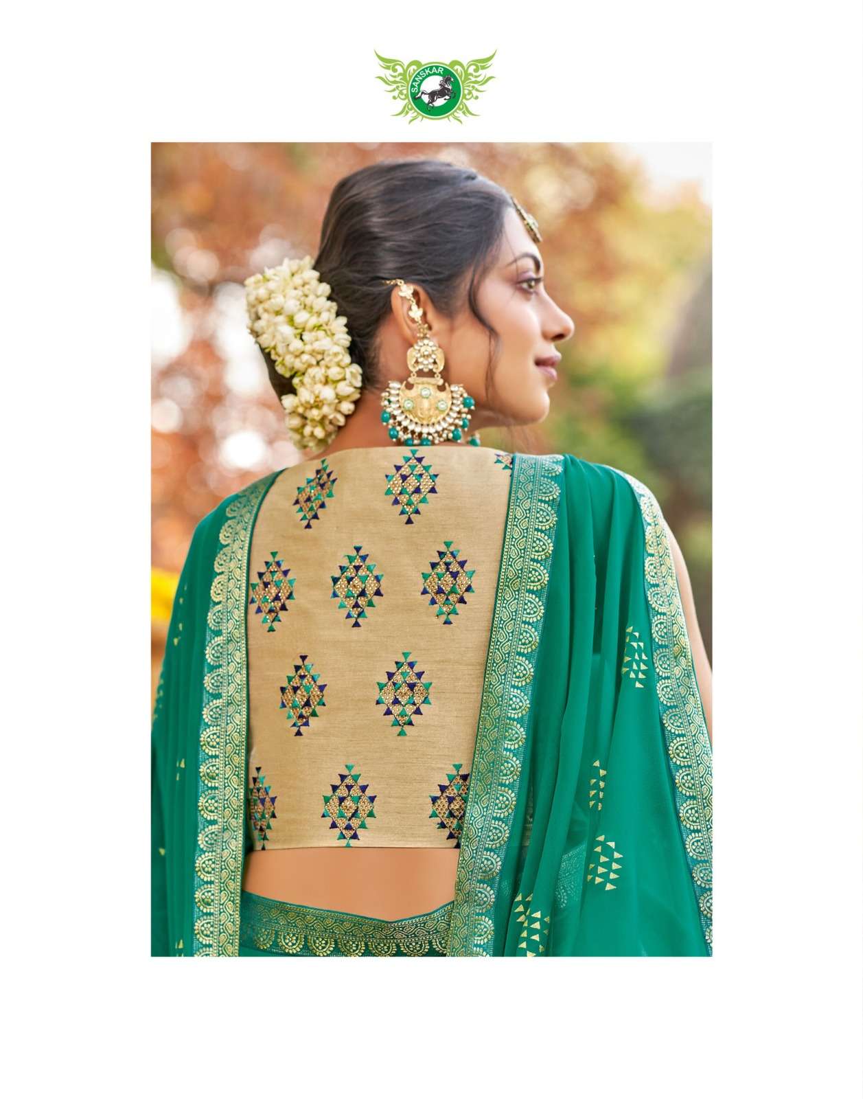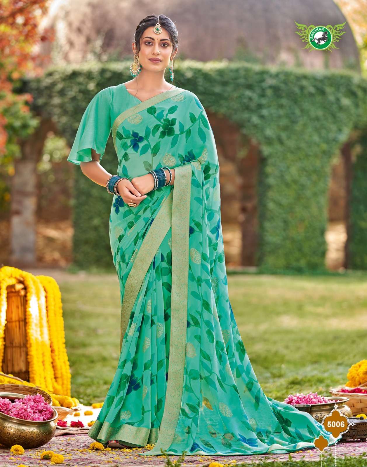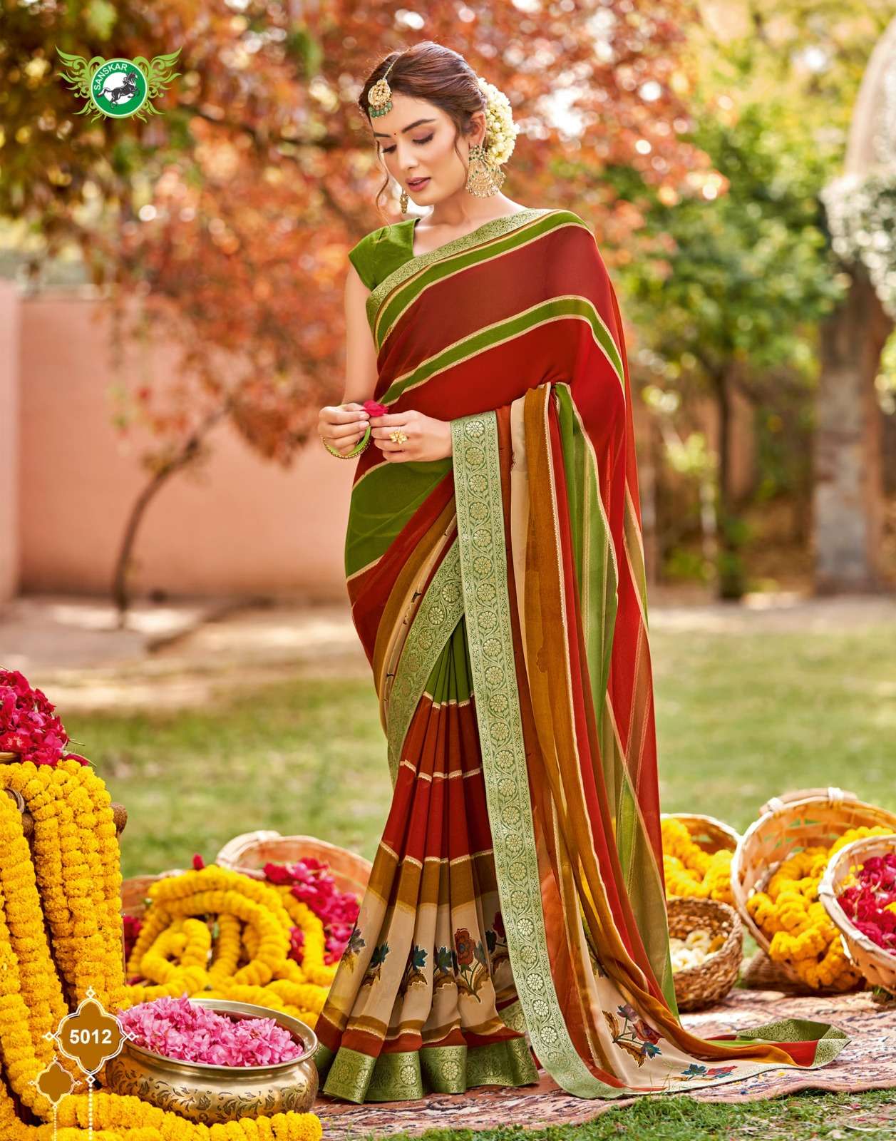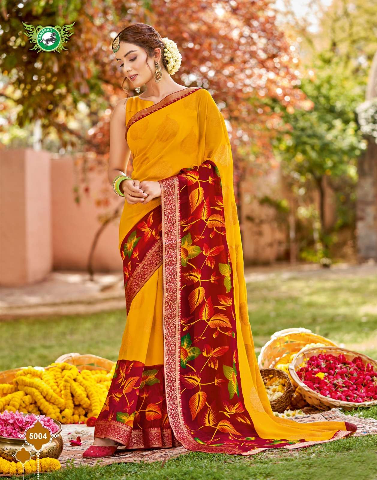 Sanskar Tex print pvt ltd CATLOUGE- Kesar Kasturi Fabric- Georgette ivory with fancy print with value addition work blouse Qty- 12 dis RATE - 595/- |
