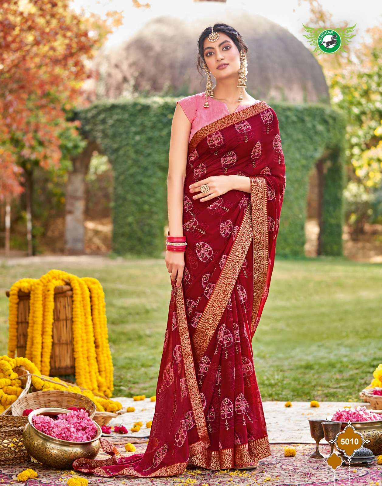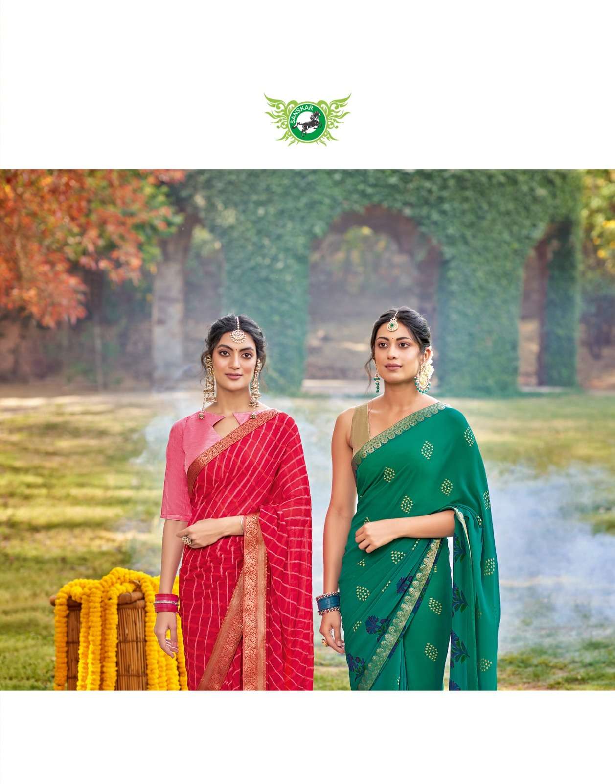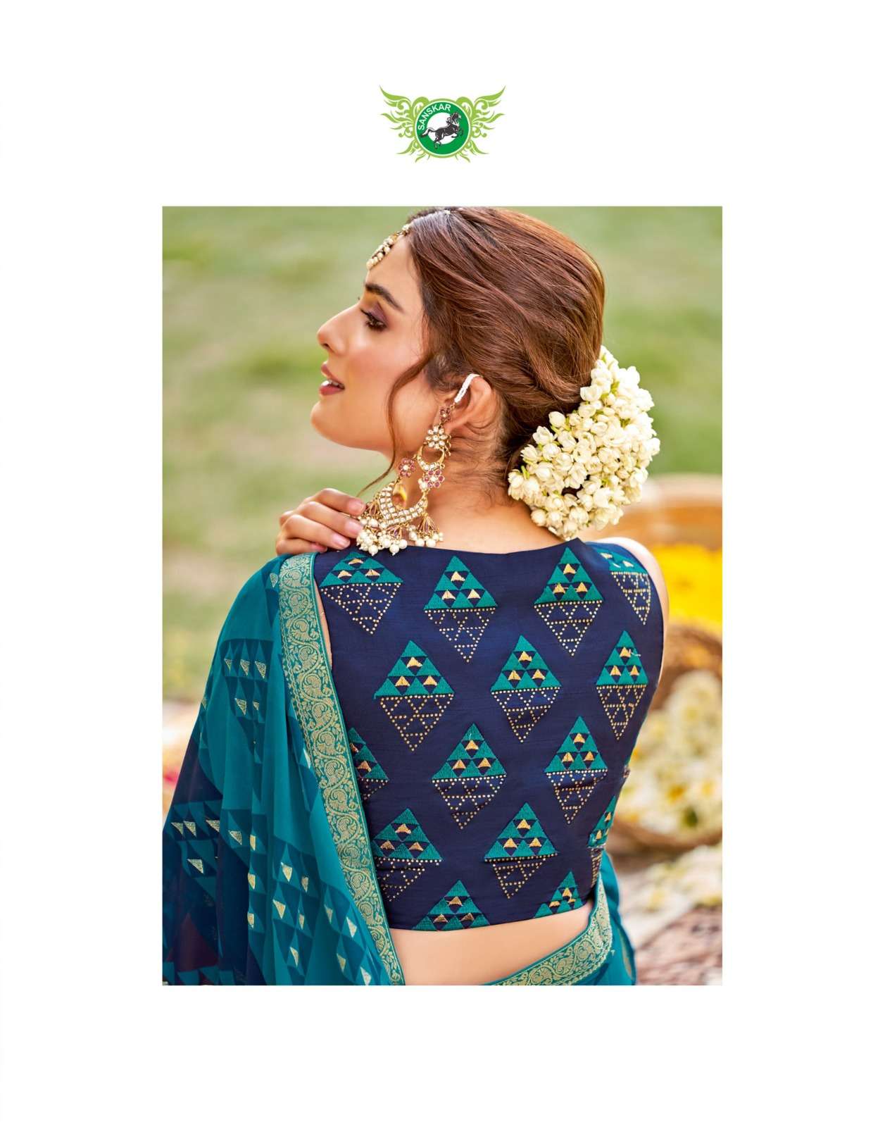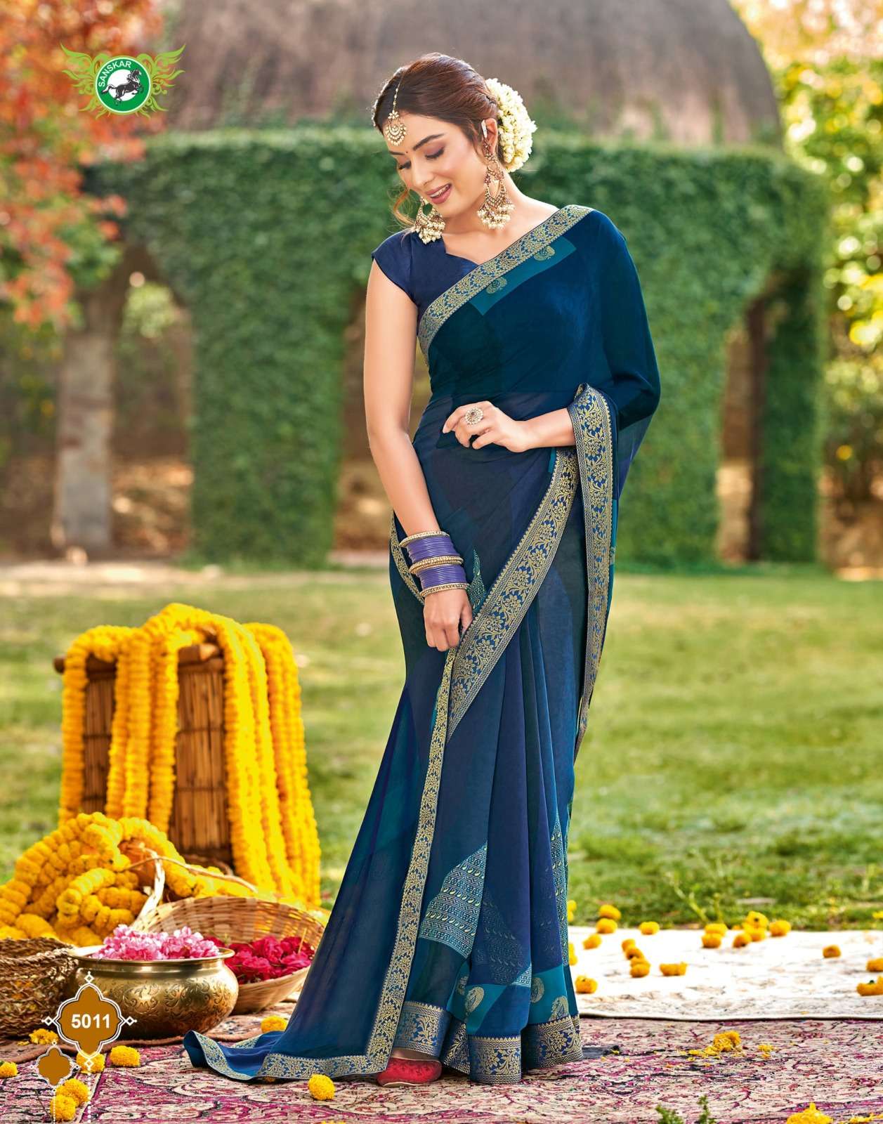 Sanskar Tex print pvt ltd CATLOUGE- Kesar Kasturi Fabric- Georgette ivory with fancy print with value addition work blouse Qty- 12 dis RATE - 595/- |