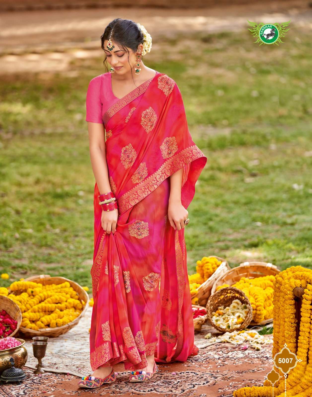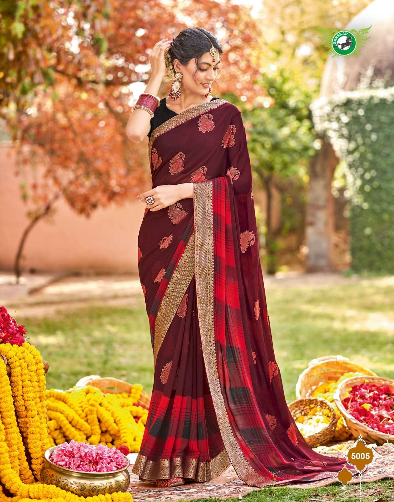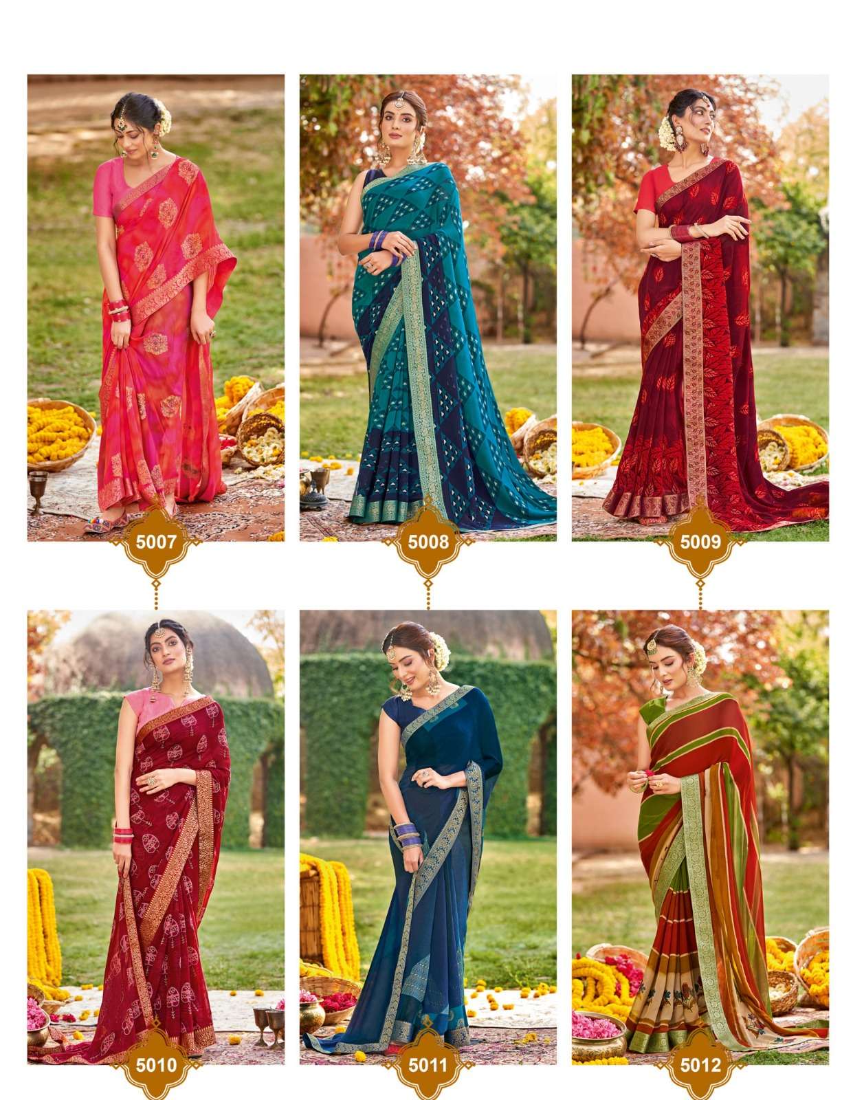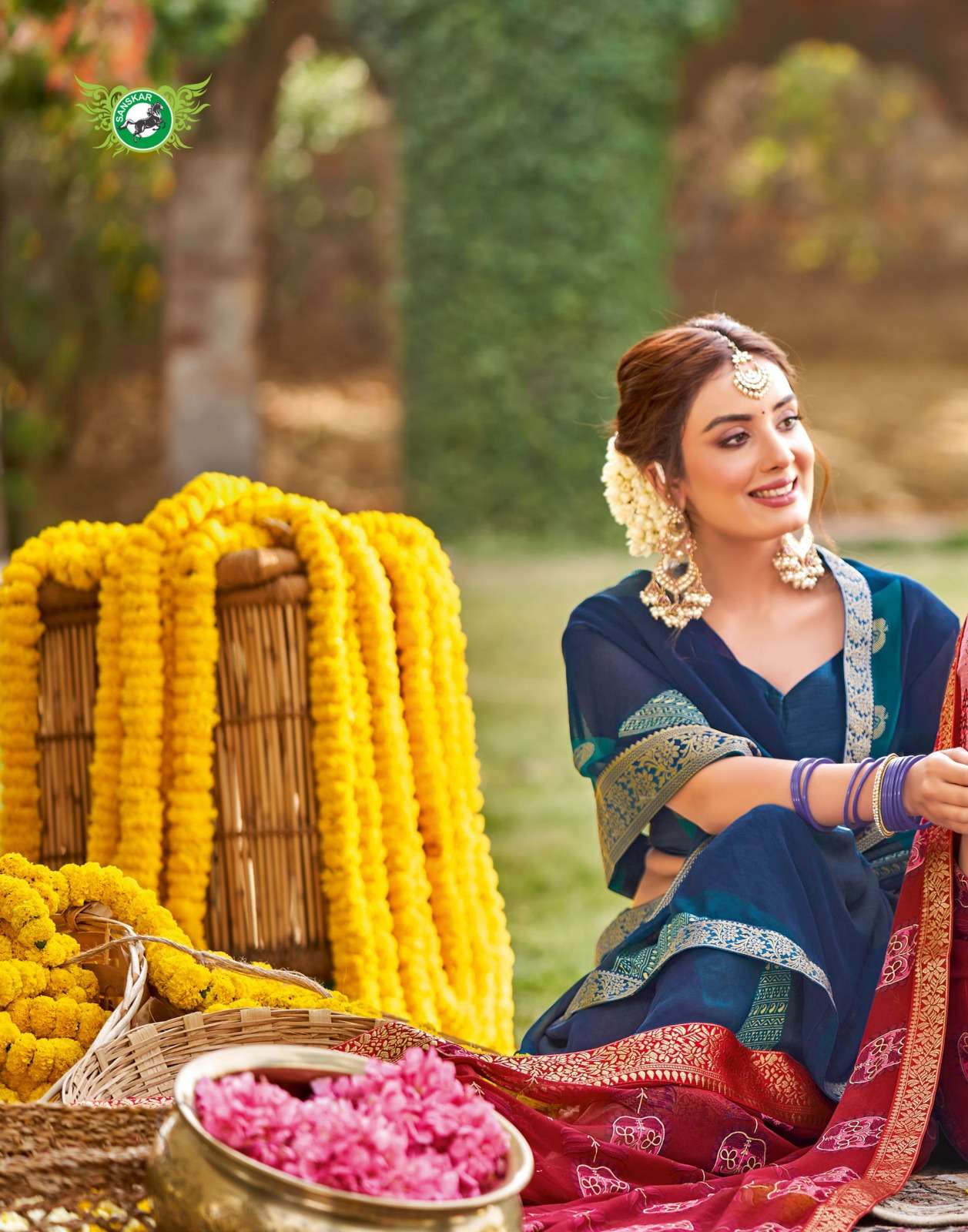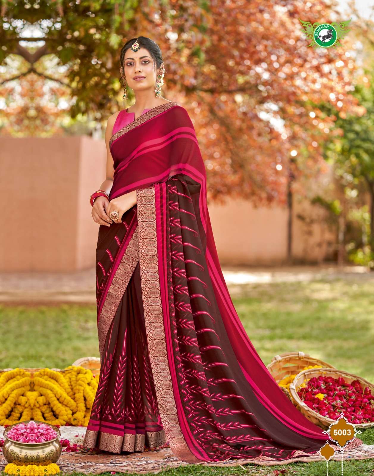 Sanskar Tex print pvt ltd CATLOUGE- Kesar Kasturi Fabric- Georgette ivory with fancy print with value addition work blouse Qty- 12 dis RATE - 595/- |