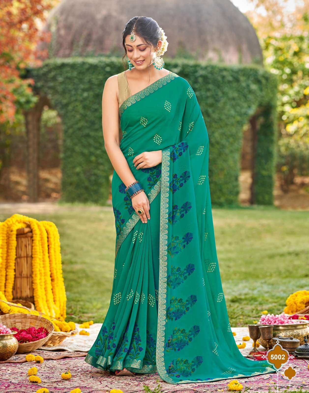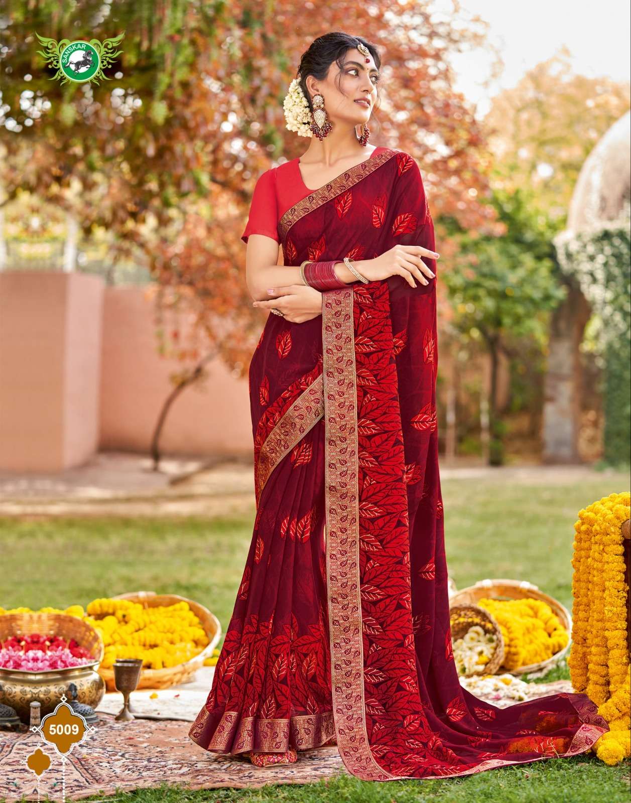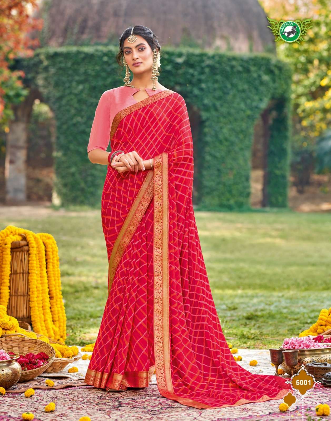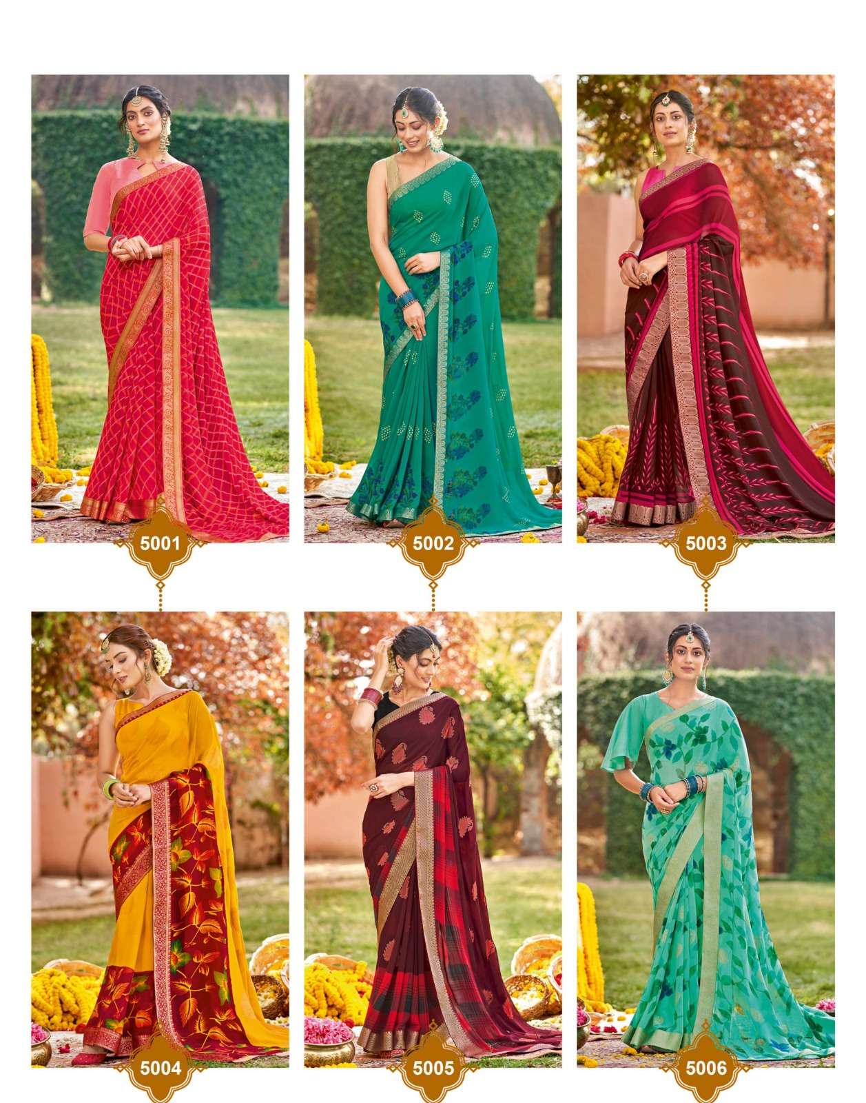 Sanskar Tex print pvt ltd CATLOUGE- Kesar Kasturi Fabric- Georgette ivory with fancy print with value addition work blouse Qty- 12 dis RATE - 595/- |
