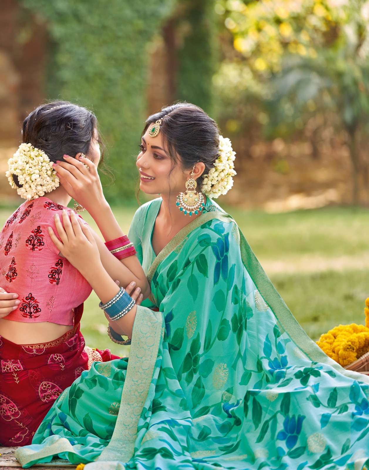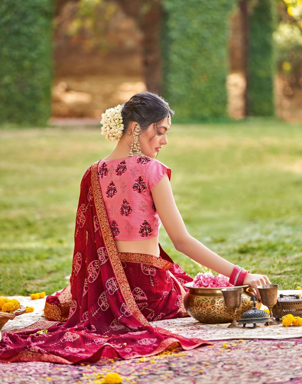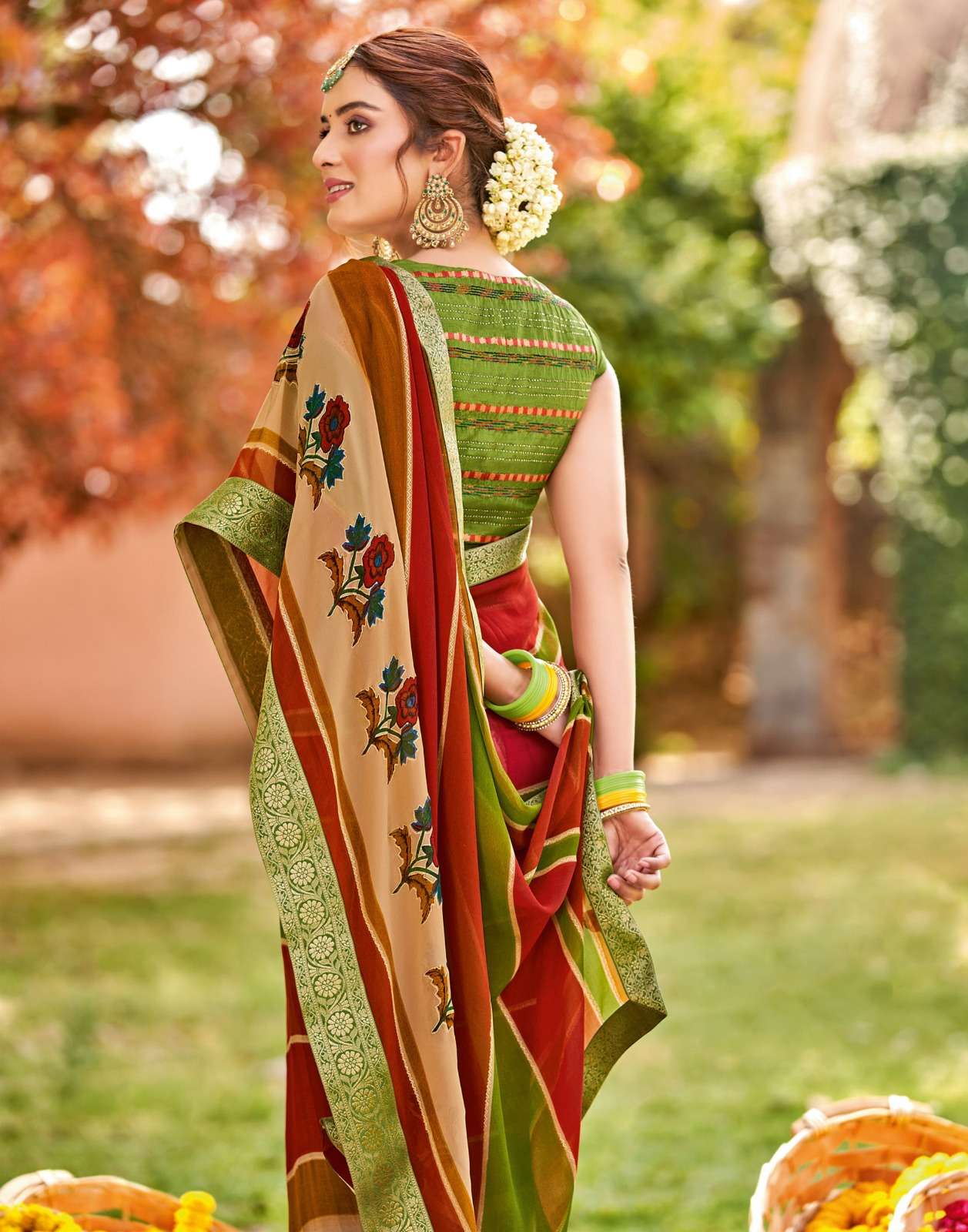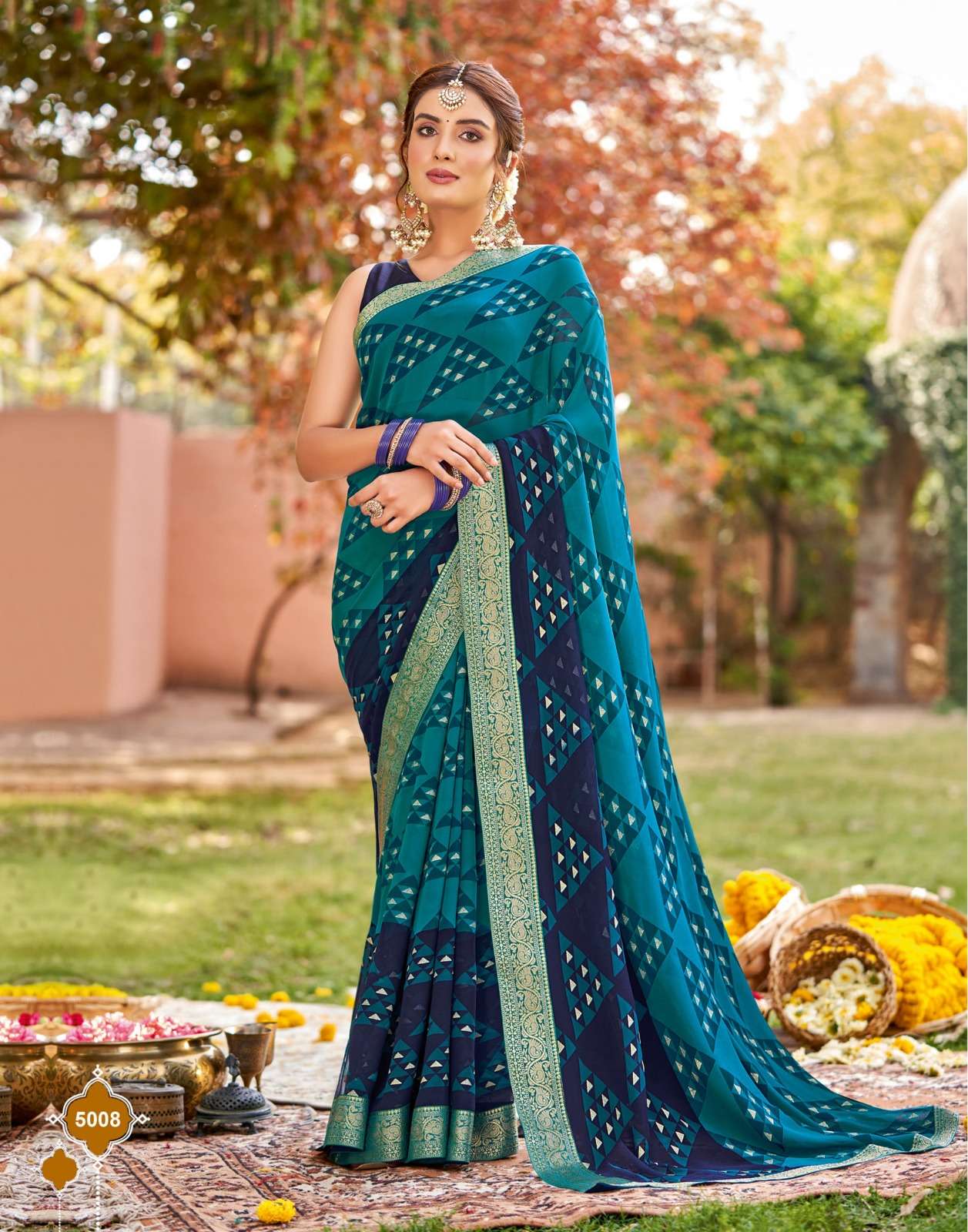 Sanskar Tex print pvt ltd CATLOUGE- Kesar Kasturi Fabric- Georgette ivory with fancy print with value addition work blouse Qty- 12 dis RATE - 595/- |