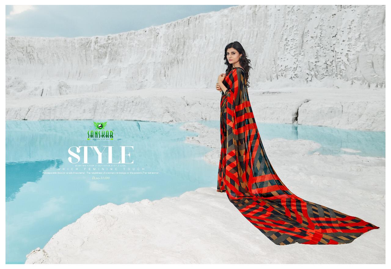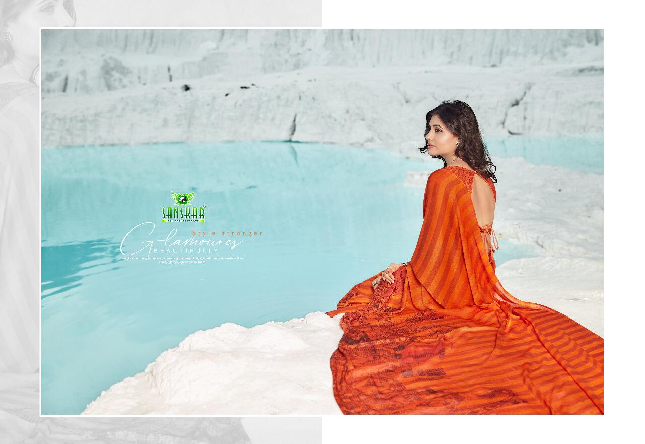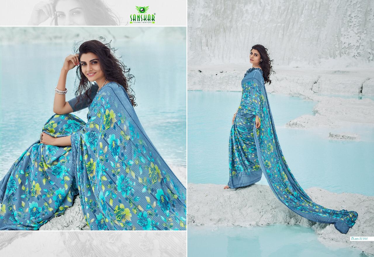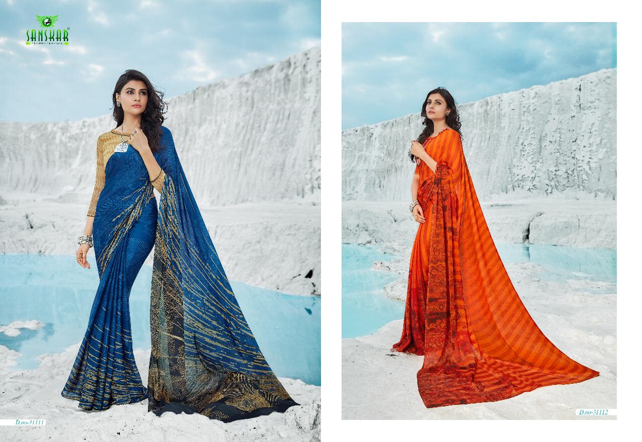 Sanskar Tex Print Sunehri Moss Chiffon Casual Wear Saree Wholesale Exporter