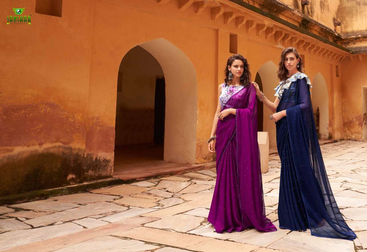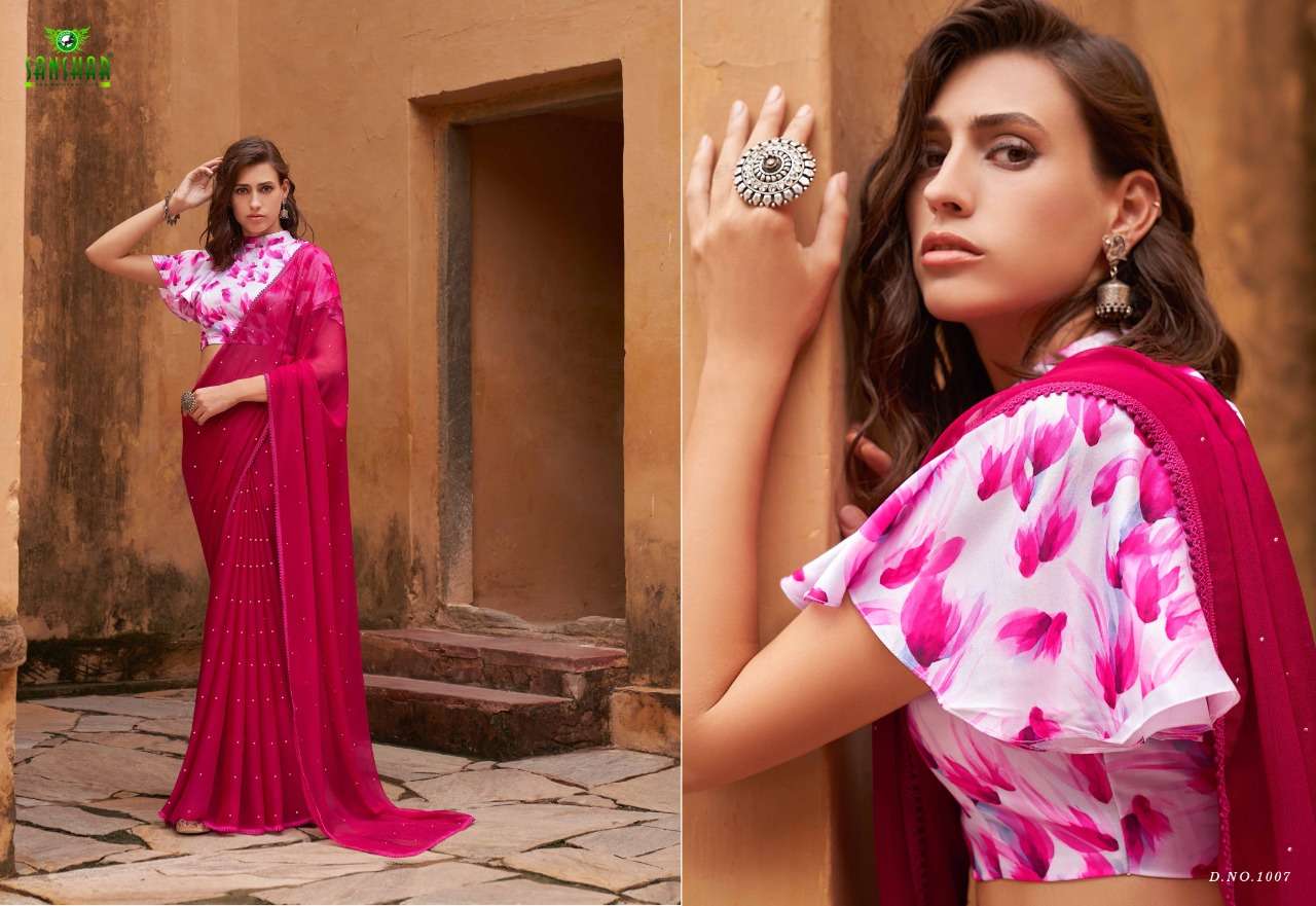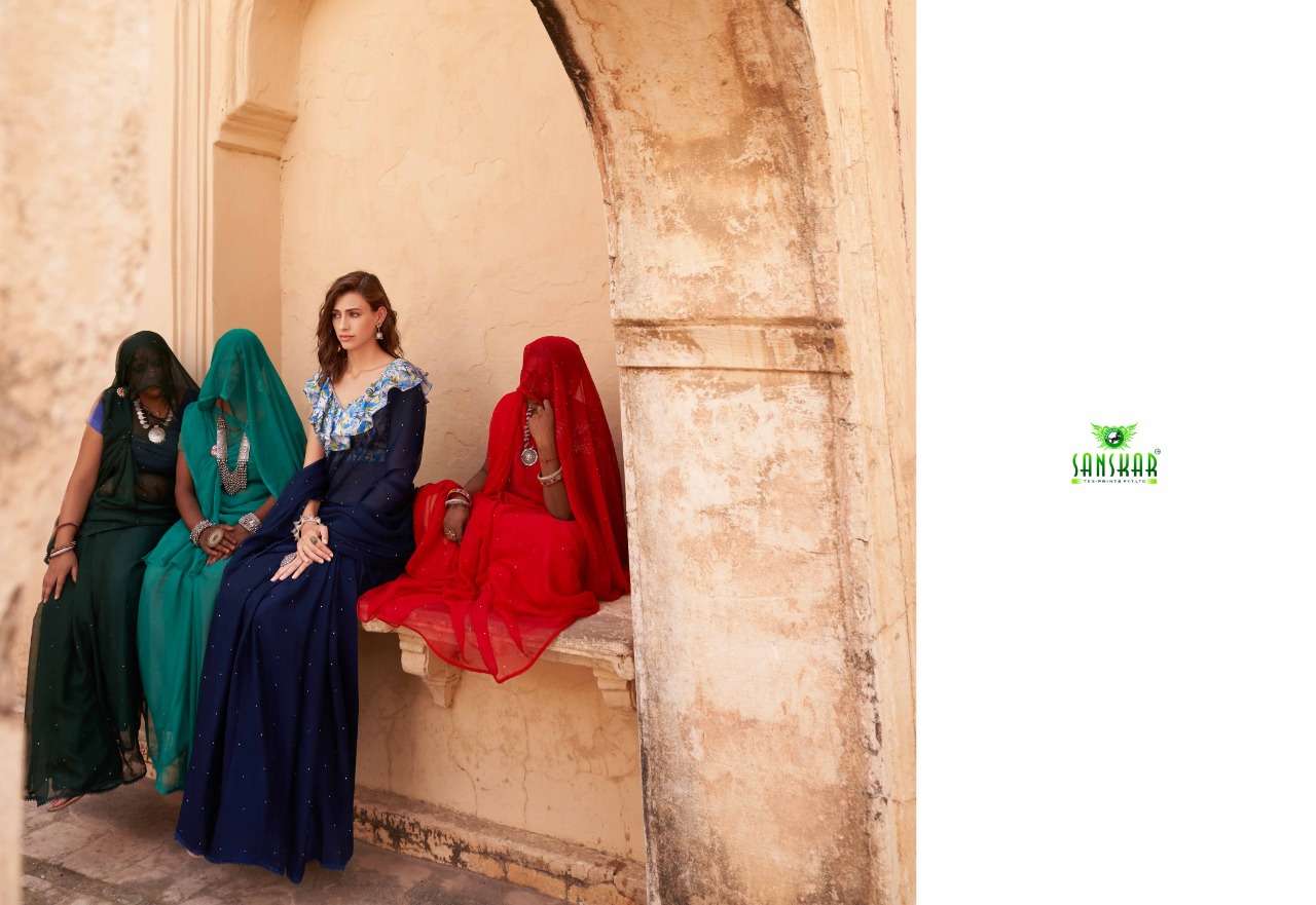New launching Sanskar tex prints pvt. ltd. Catalouge-manchali Fabric—40 gram bember chiffon with hand work embroidered border & digtal blouse Qty—8 dig— Rate—645₹ special fany edition work catlouge |