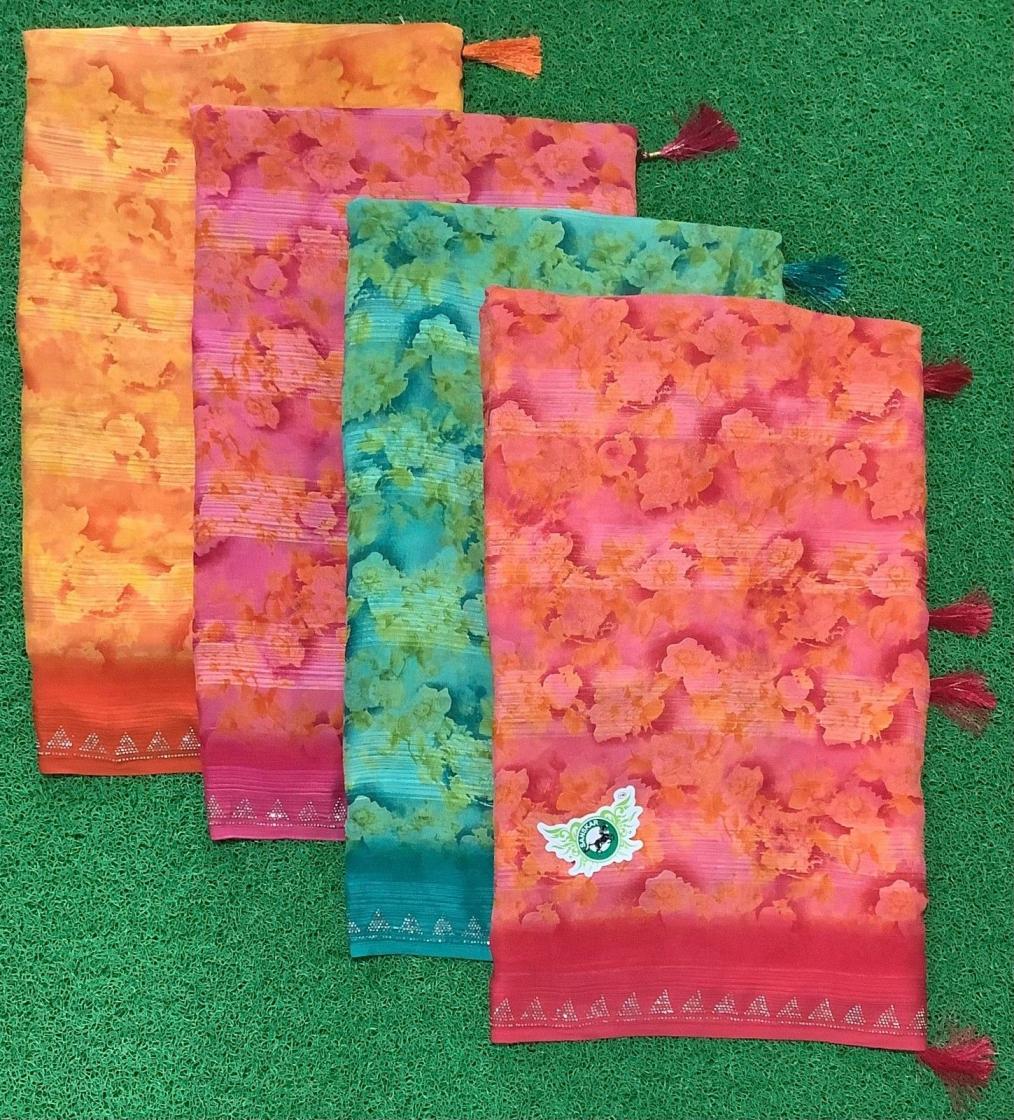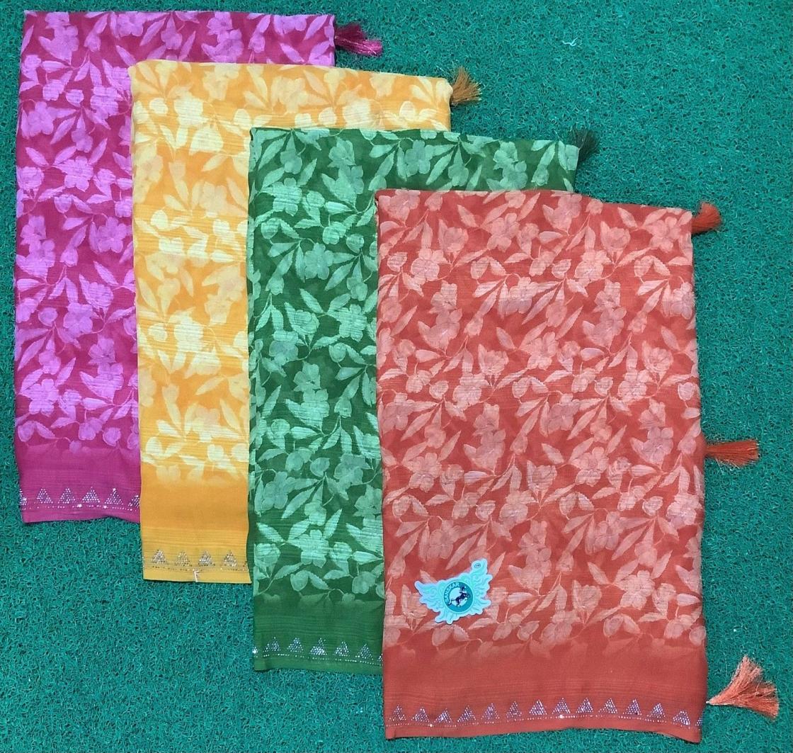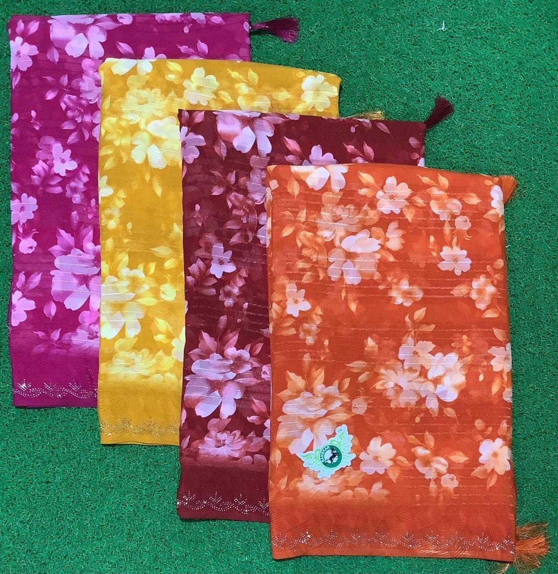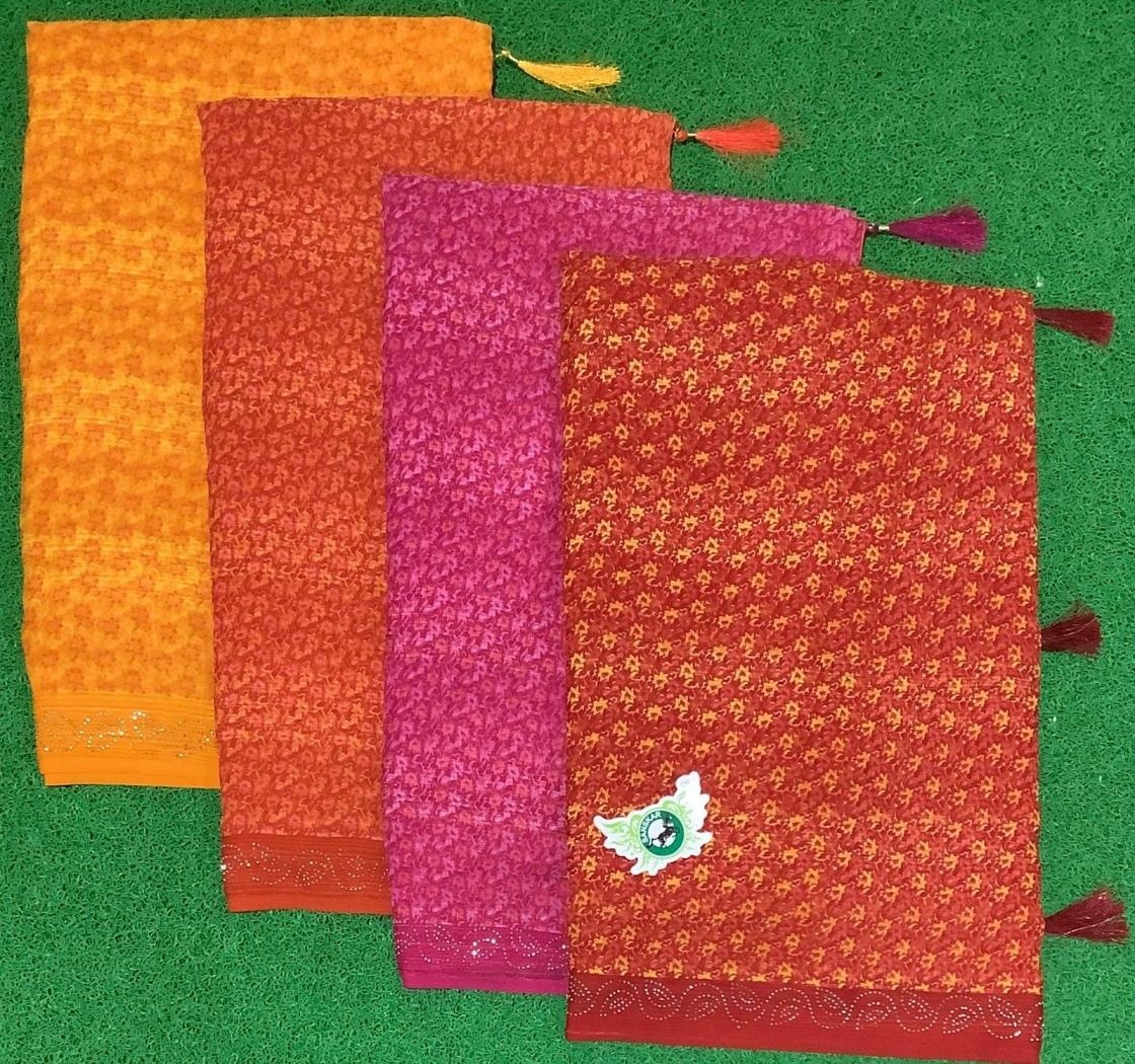 SANSKAR TEX PRINTS PVT LTD CATLOUGE= NECKLACE Fabric- Silk fab. With necklace border & Discharge print with blouse 🪡 Qty- 4 colour matching(Designs Available) RATE - 700₹ Min 5 design order |