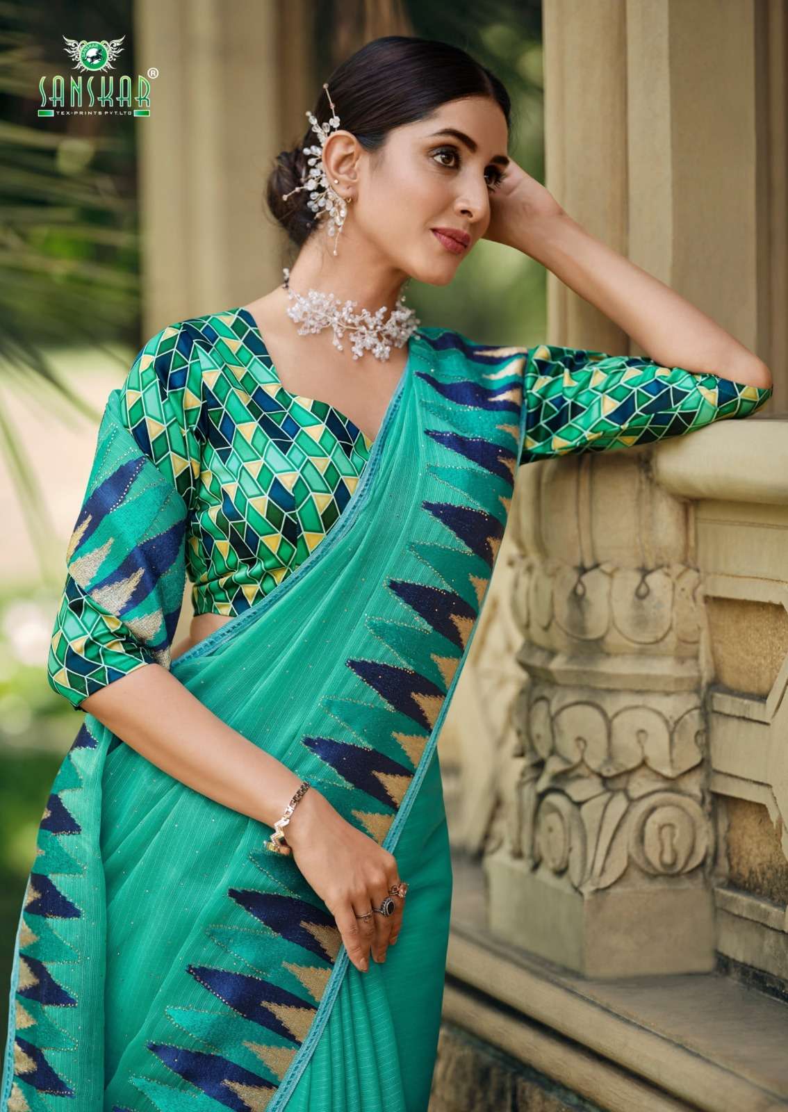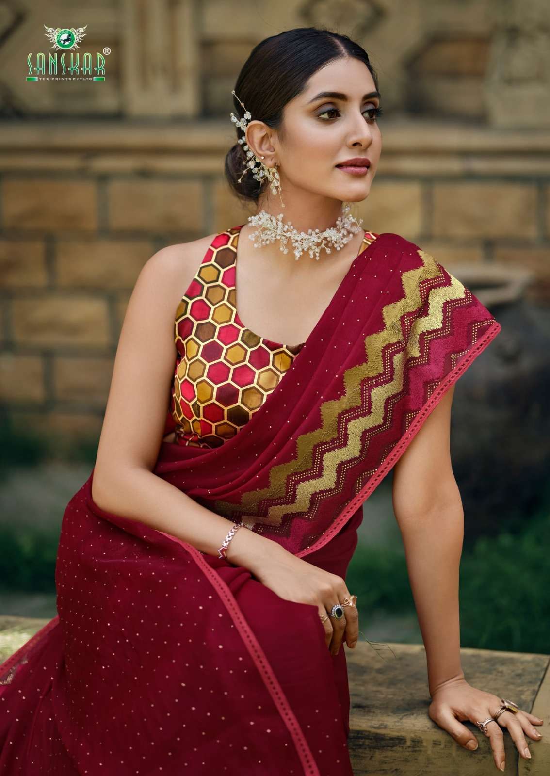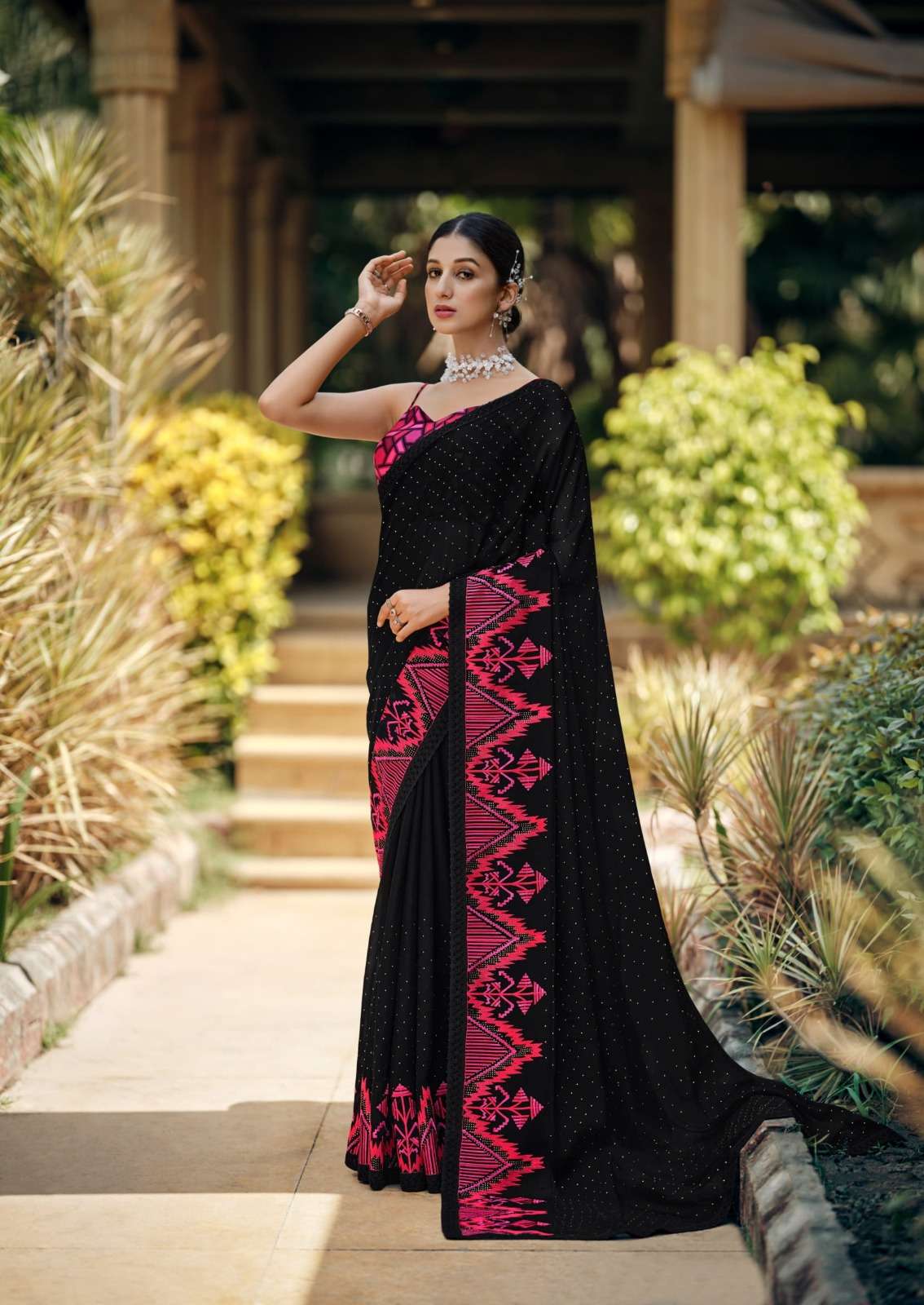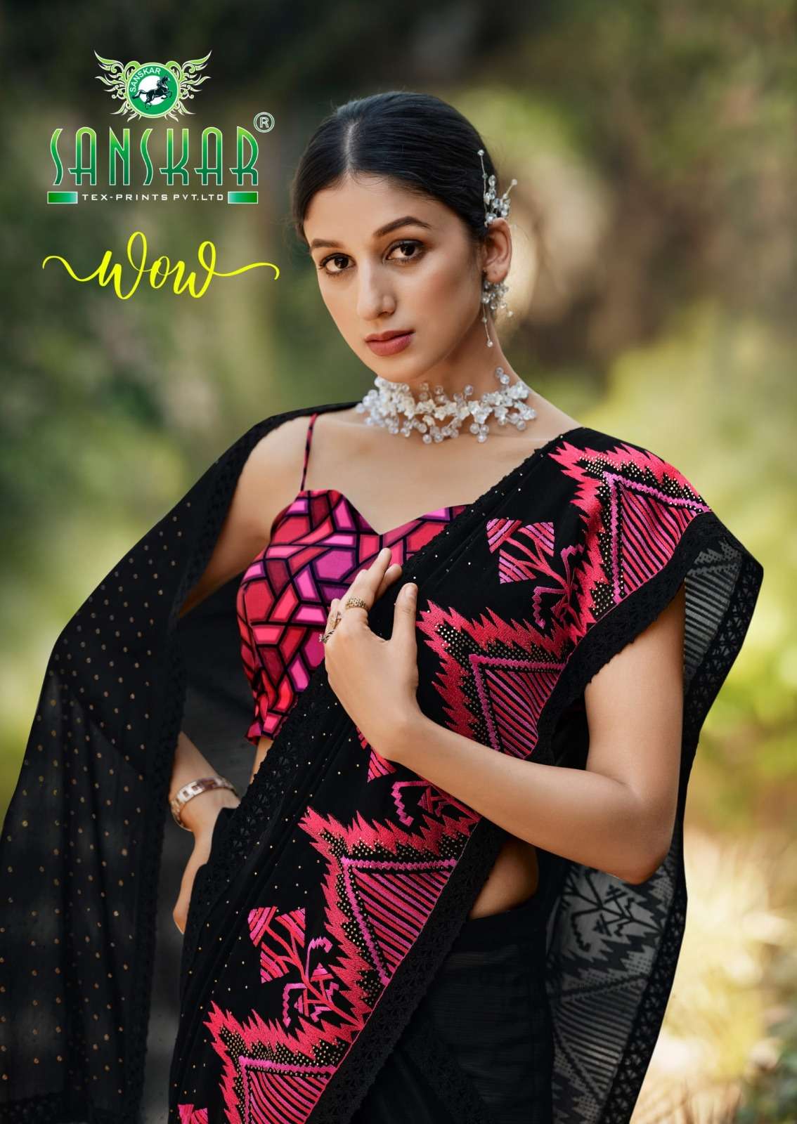 Sanskar Tex prints pvt. ltd. CATLOUGE- WOW Fabric- Simmer Georgette chiffon with embroidery 🪡 thread 🧵 work full saree sirowski work border & Digital blouse Qty- 8 dis RATE - 1155₹ |