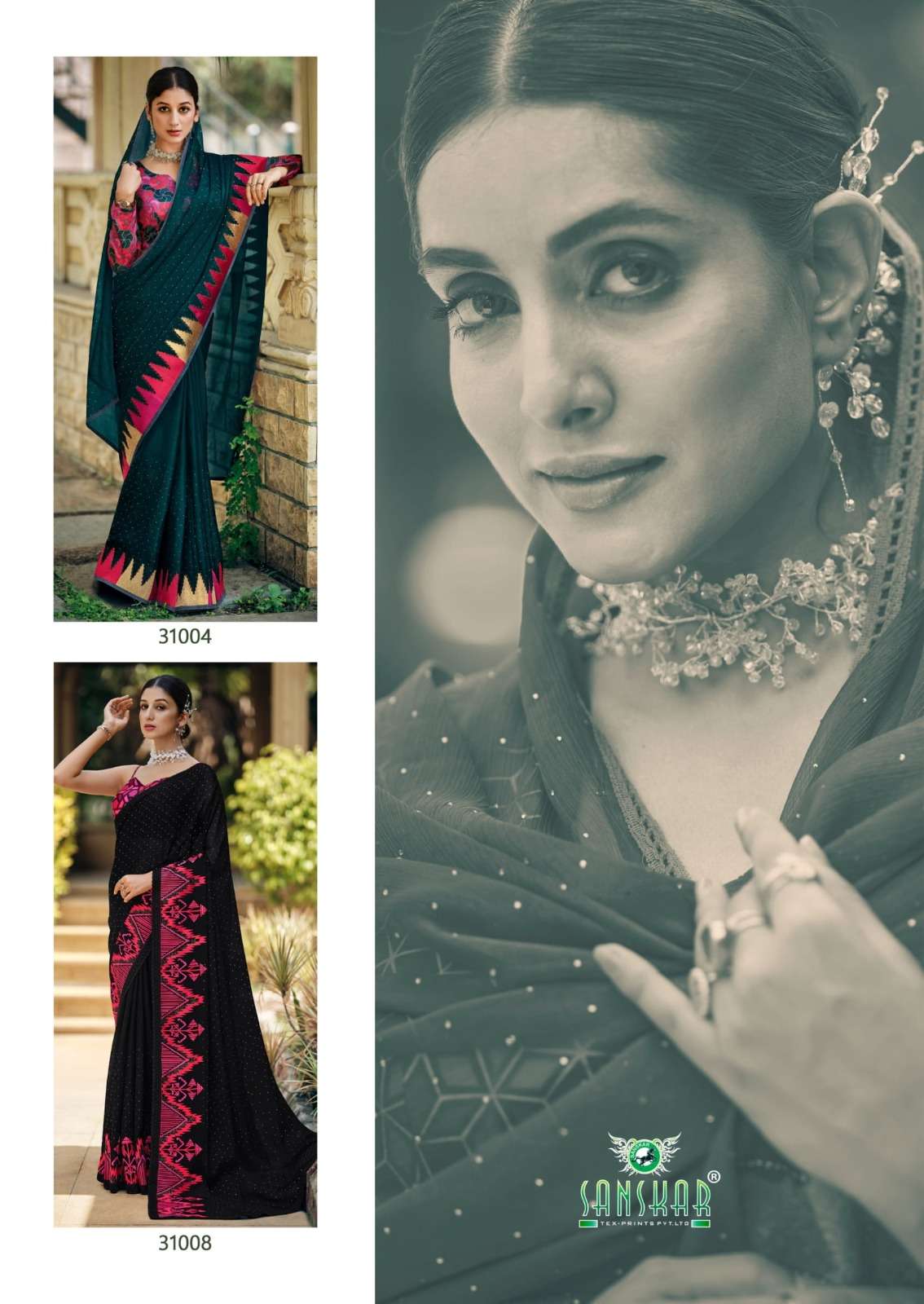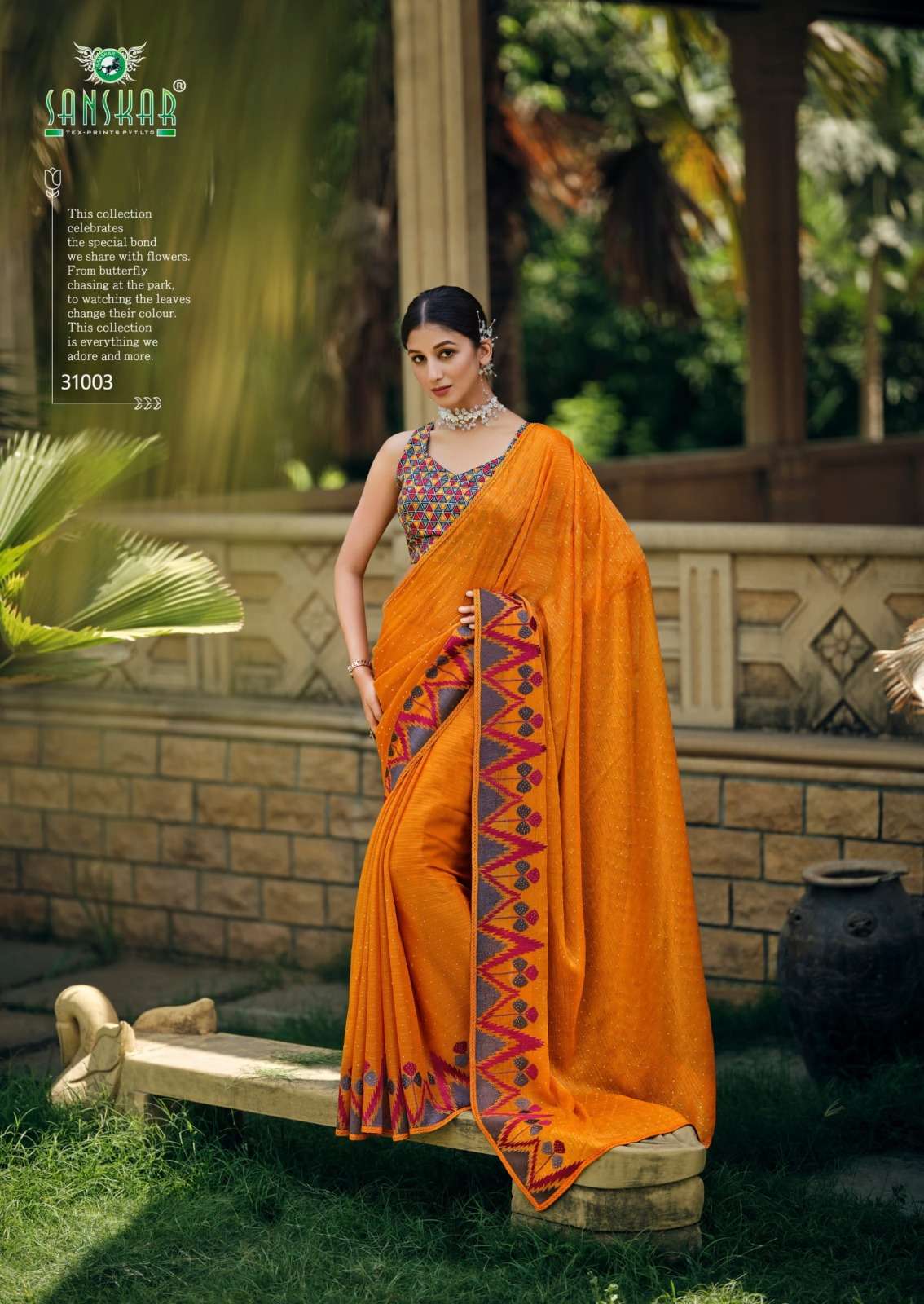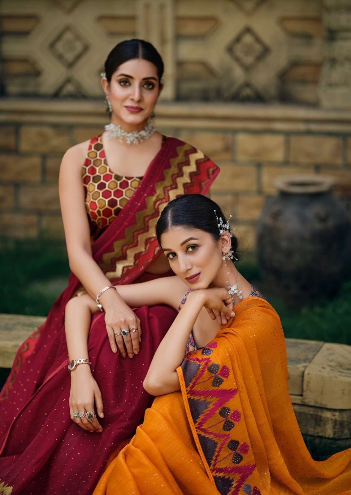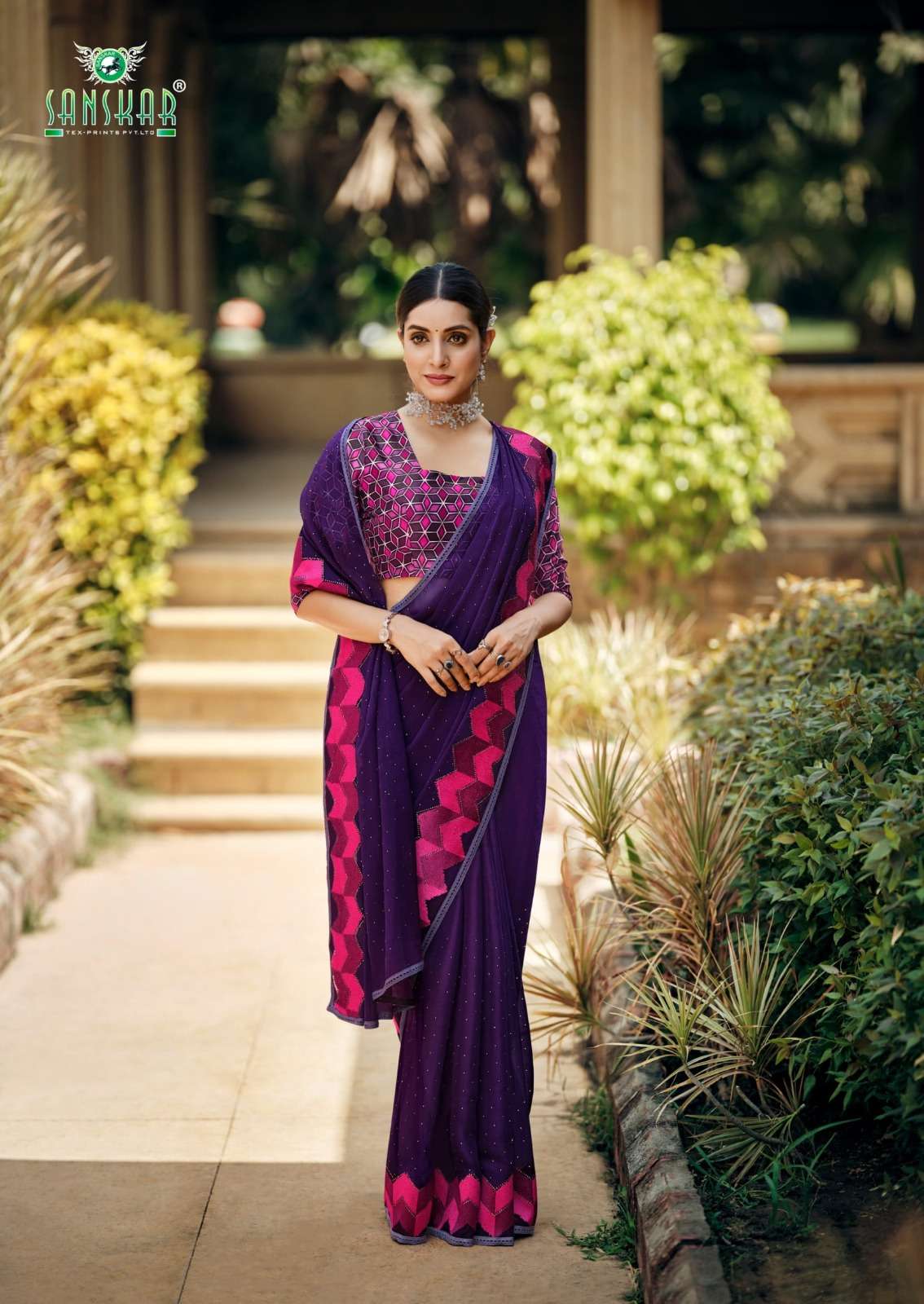 Sanskar Tex prints pvt. ltd. CATLOUGE- WOW Fabric- Simmer Georgette chiffon with embroidery 🪡 thread 🧵 work full saree sirowski work border & Digital blouse Qty- 8 dis RATE - 1155₹ |