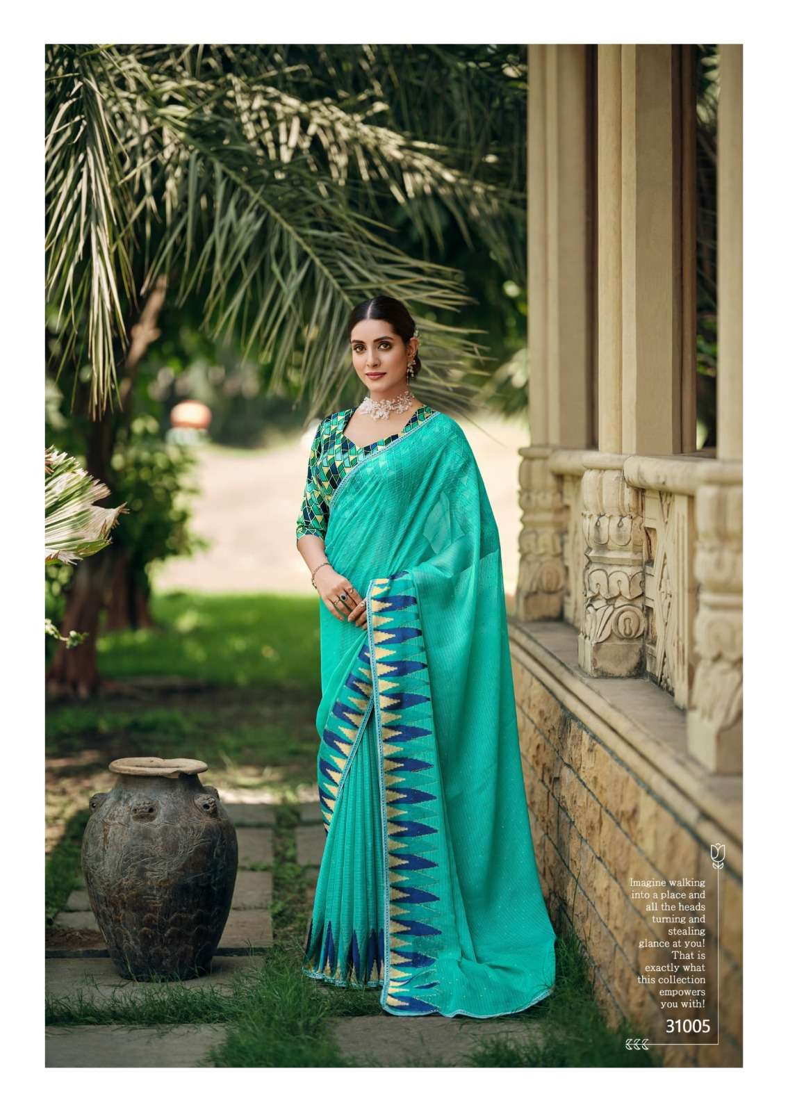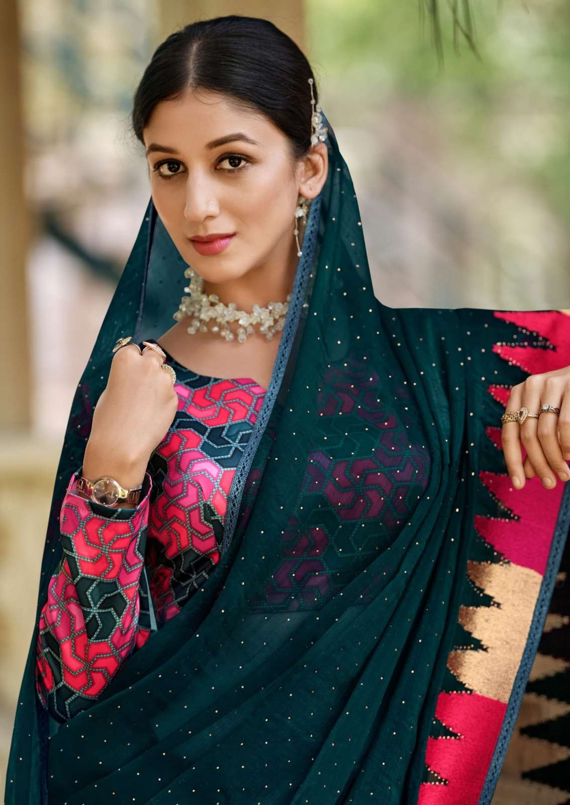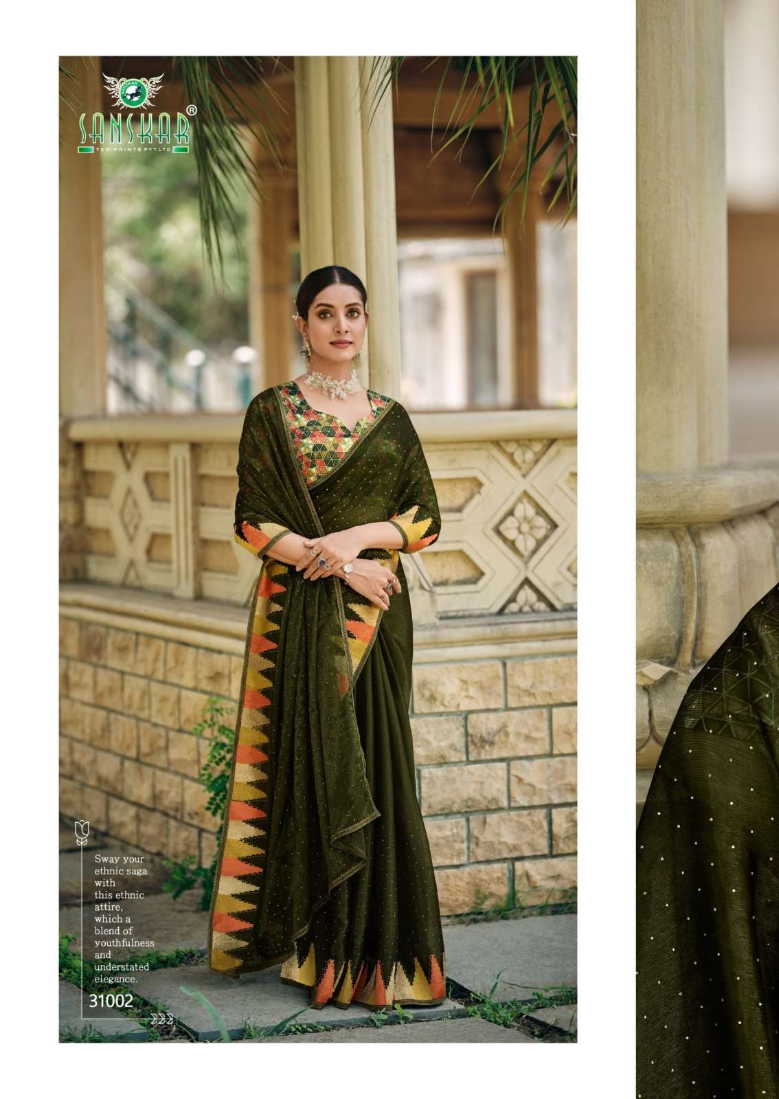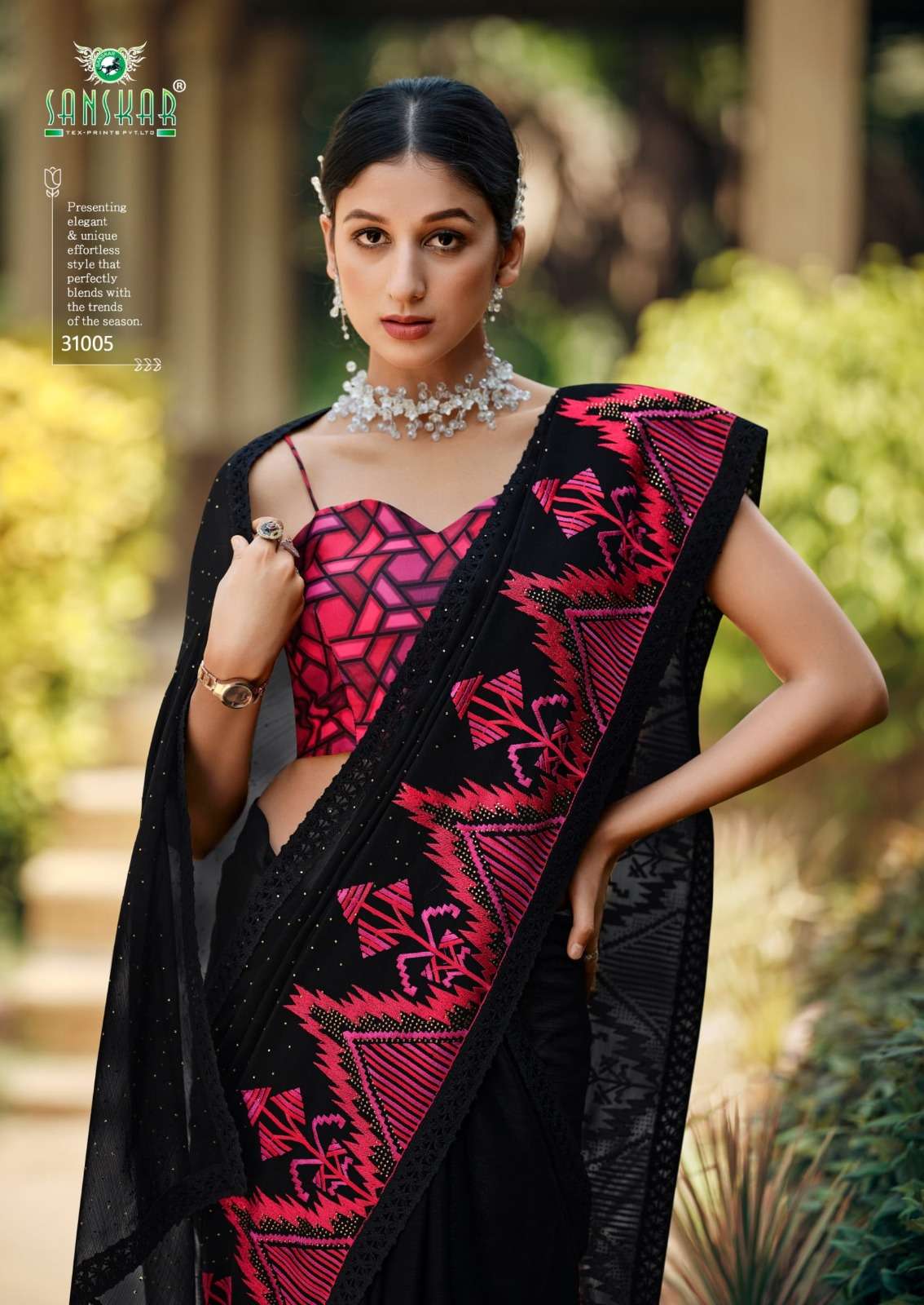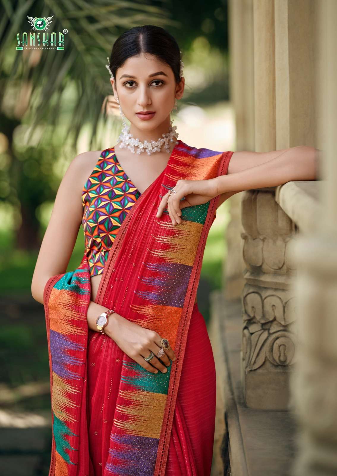 Sanskar Tex prints pvt. ltd. CATLOUGE- WOW Fabric- Simmer Georgette chiffon with embroidery 🪡 thread 🧵 work full saree sirowski work border & Digital blouse Qty- 8 dis RATE - 1155₹ |
